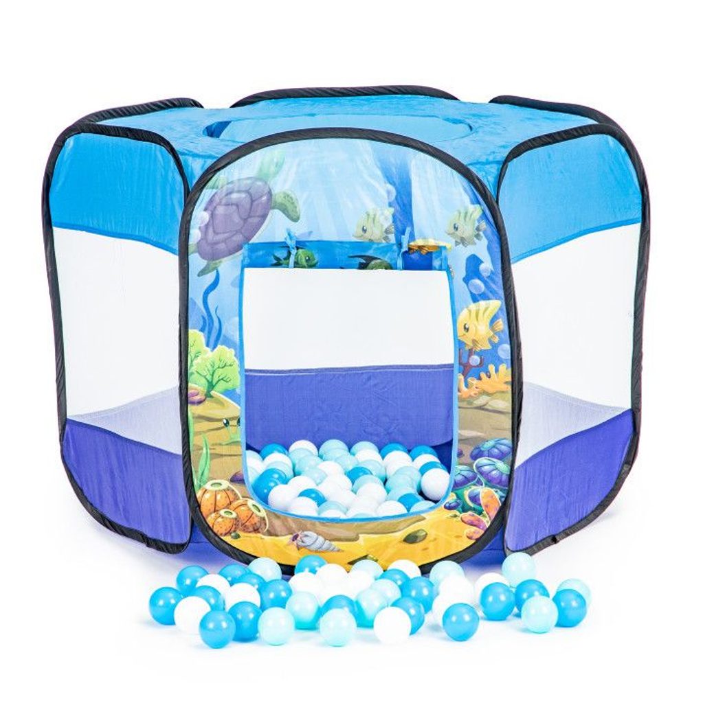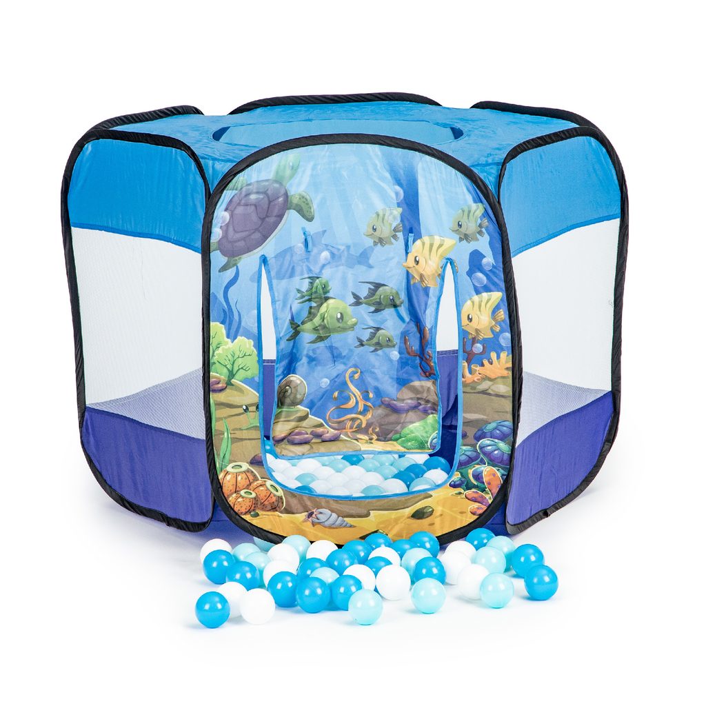 Ecotoys dětský stan Undewater Balls + 100 barevných plastových míčků o průměru 6 cm. Díky nepromokavé podlaze je vhodný jak do vnitřních prostor tak i pro venkovní použití. Stan má vchod se zatahovací roletkou a stěny ze síťoviny. Rodiče tak mají snadnou kontrolu nad dětmi. Svrchní materiál je polyester v pestrobarevném barevném provedení. Montáž stanu je velmi snadná a rychlá, což oceníte zejména při jeho přemist'ování.