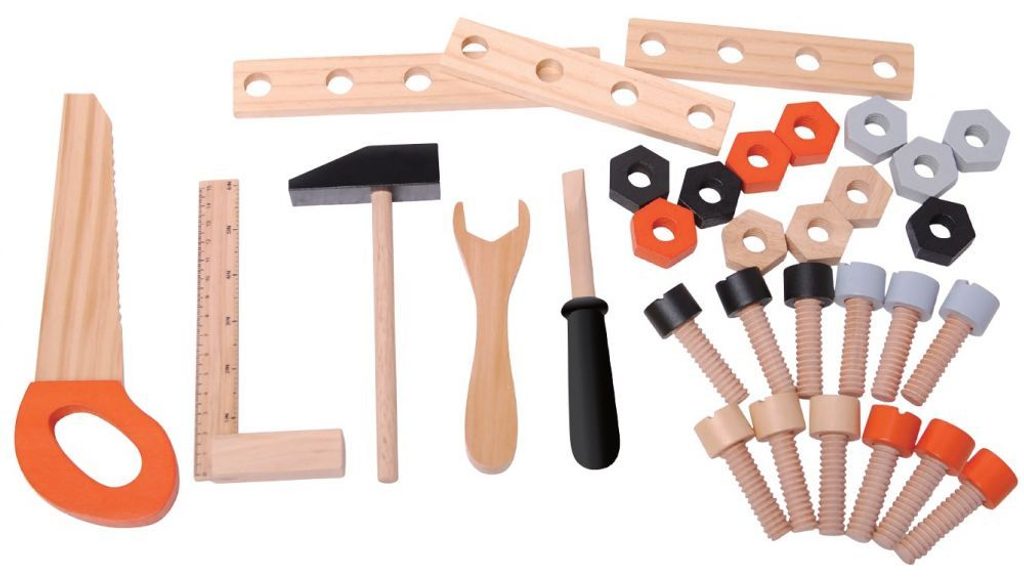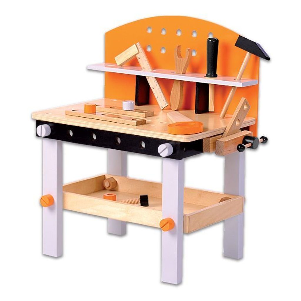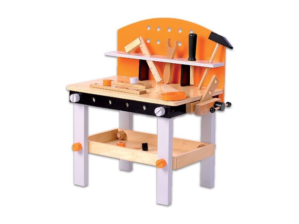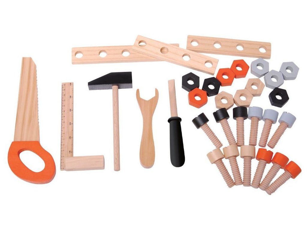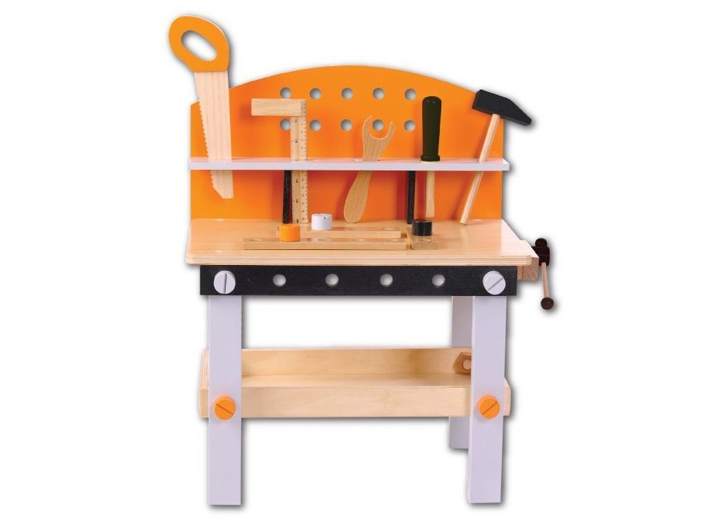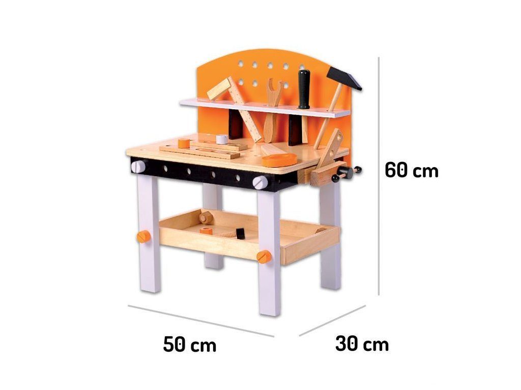 Ecotoys dřevěná pracovní dílna Malý kutil. Sada obsahuje celkem 32 součástí včetně pilky, pravítka, kladívka, klíče, šroubků, matic a dalších konstrukčních prvků. Ve spodní části je umístěna praktická police. V boční části je umístěn svěrák. Hračka je určena pro děti od 36 měsíců věku.