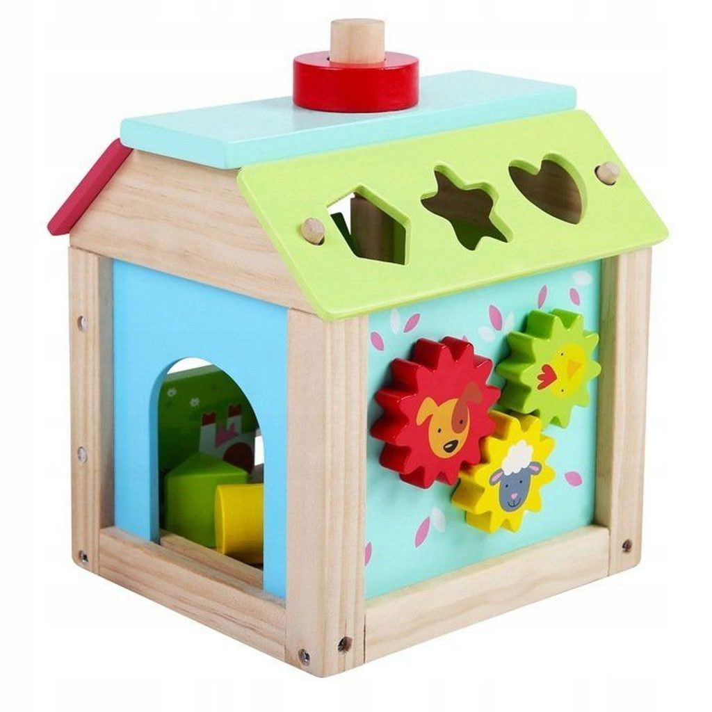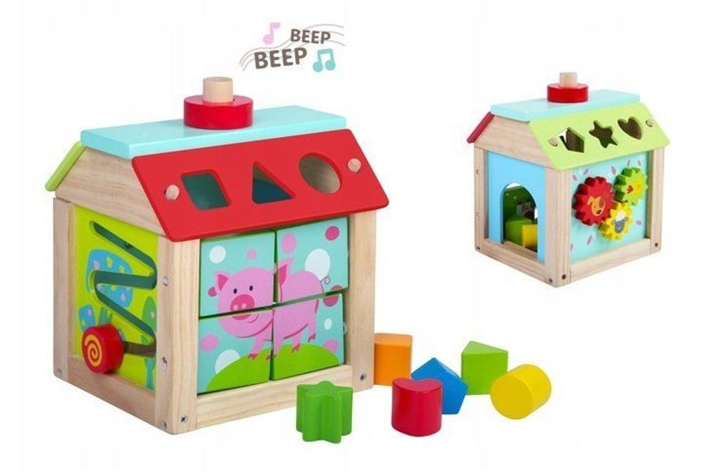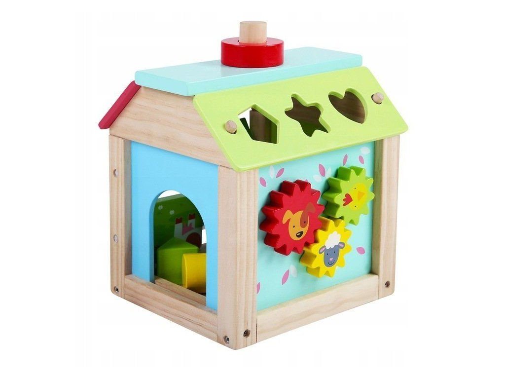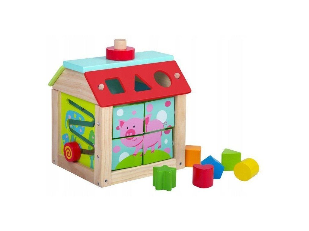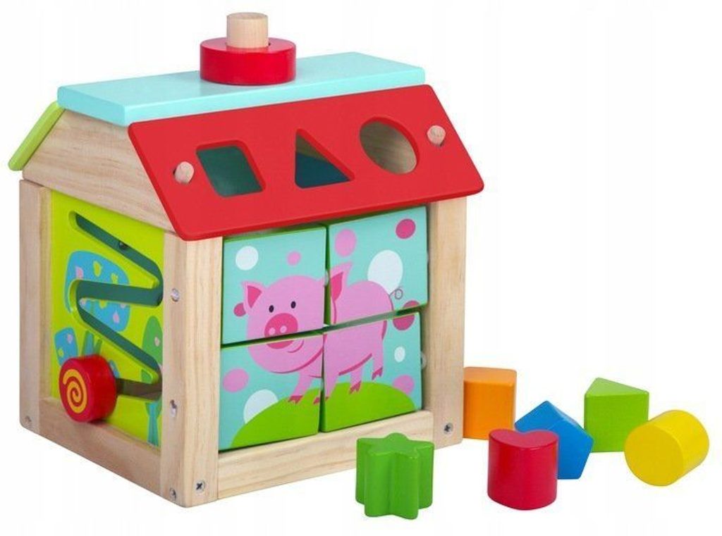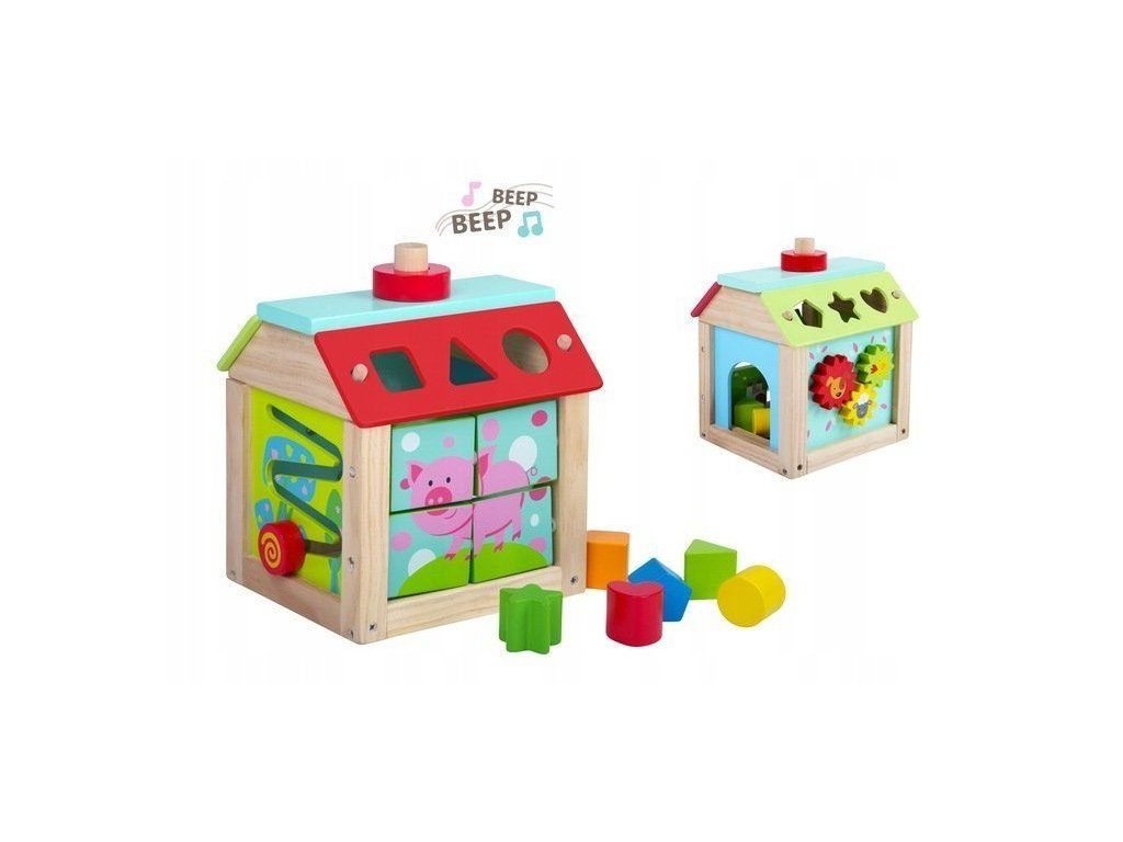 Ecotoys dřevěná edukační kostka 5v1. Každá stěna plní jinou funkci. Dítě si může hrát s labyrintem, dřevěnými otáčivými kolečky nebo s pohyblivým puzzle. V horní části jsou umístěny prohazovací otvory, kterými dítě prohazuje dřevěné kostky o různých tvarech. Ty jsou součástí hračky. Na stříšce je umístěno tlačítko, které po zmáčknutí vydává zvuk. Vnitřní prostor může sloužit pro úschovu malých hraček. Kostka je ideální hračkou pro rozvoj dětské motoriky, hmatu, zraku a logického myšlení. Hračka je určena pro děti od 18 měsíců věku.