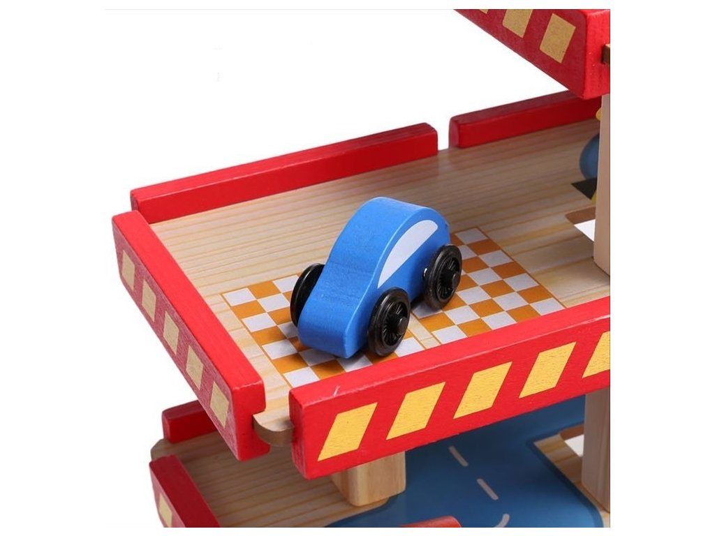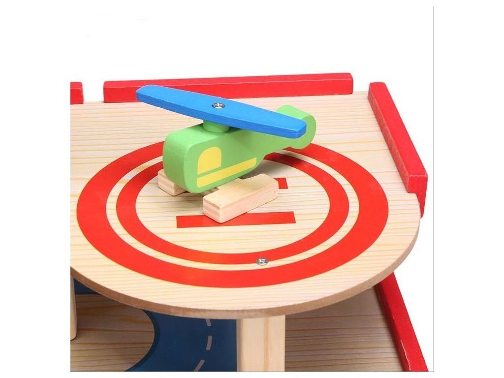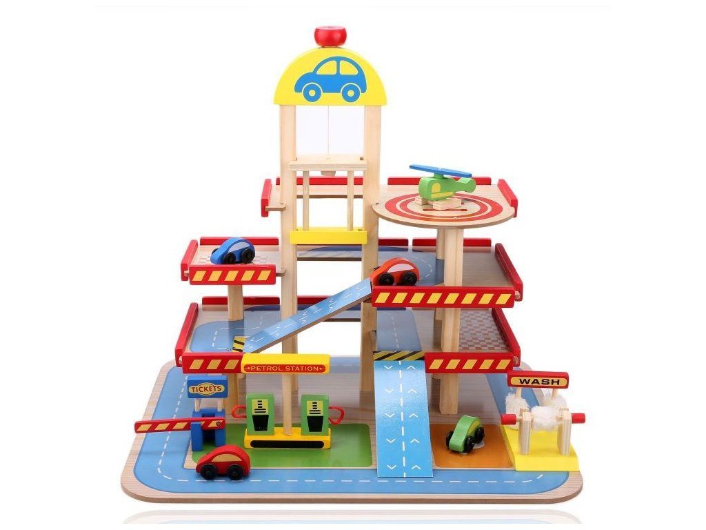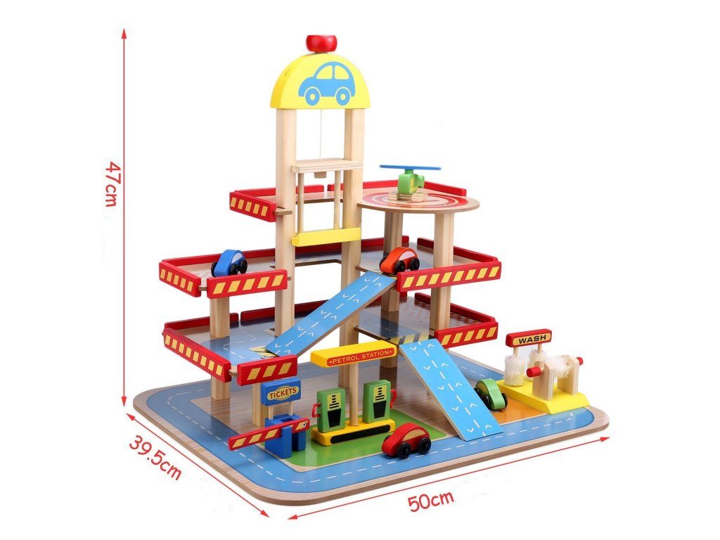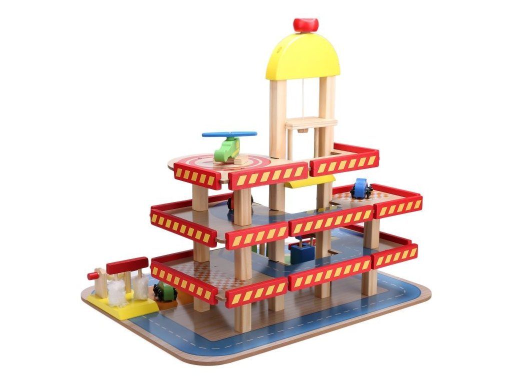 Dřevěná patrová garáž Ecotoys s dřevěnými autíčky a helikoptérou. Součástí je výtah, do kterého se dá vjet z každého patra. Na každém patře jsou mantinely, které zabraňují vypadnutí autíček. Mladý motoristický nadšenec zde nalezne vše co potřebuje. Na střeše garáže je heliport, v přízemí benzínová pumpa a myčka aut. Vyrobena ze dřeva v pestrobarevném provedení bez ostrých hran. Garáž je vhodná pro děti od 3 let věku.