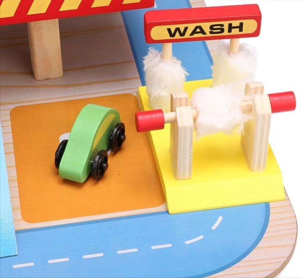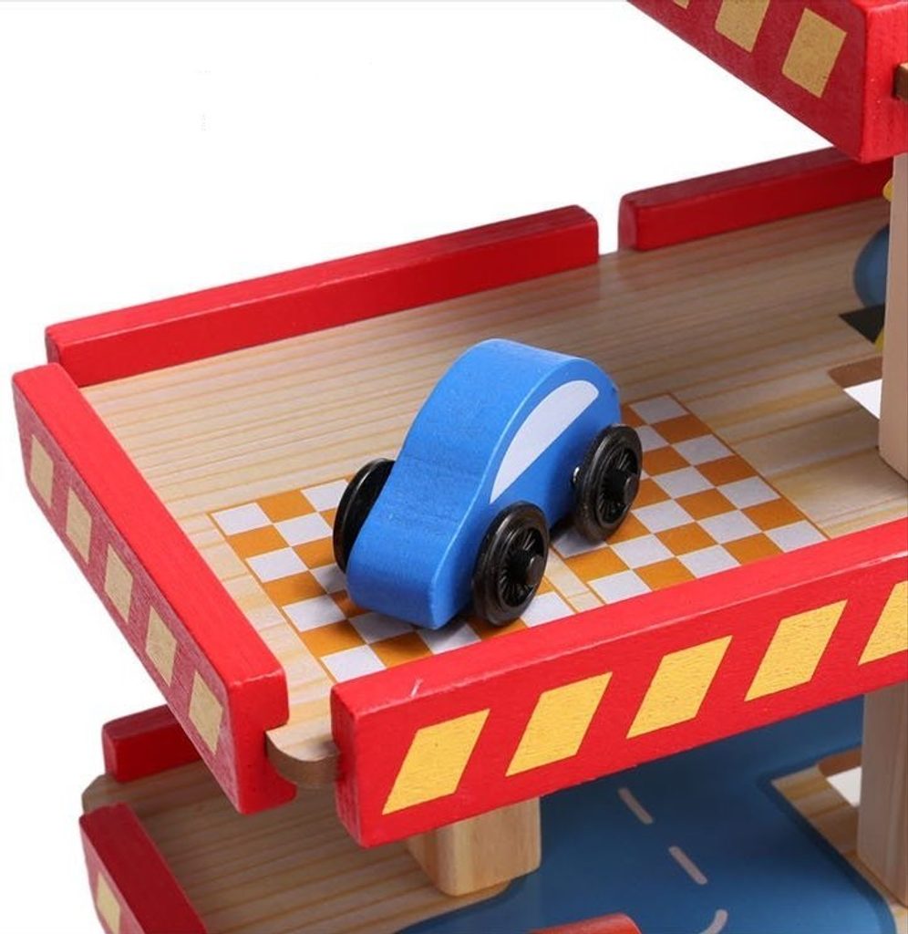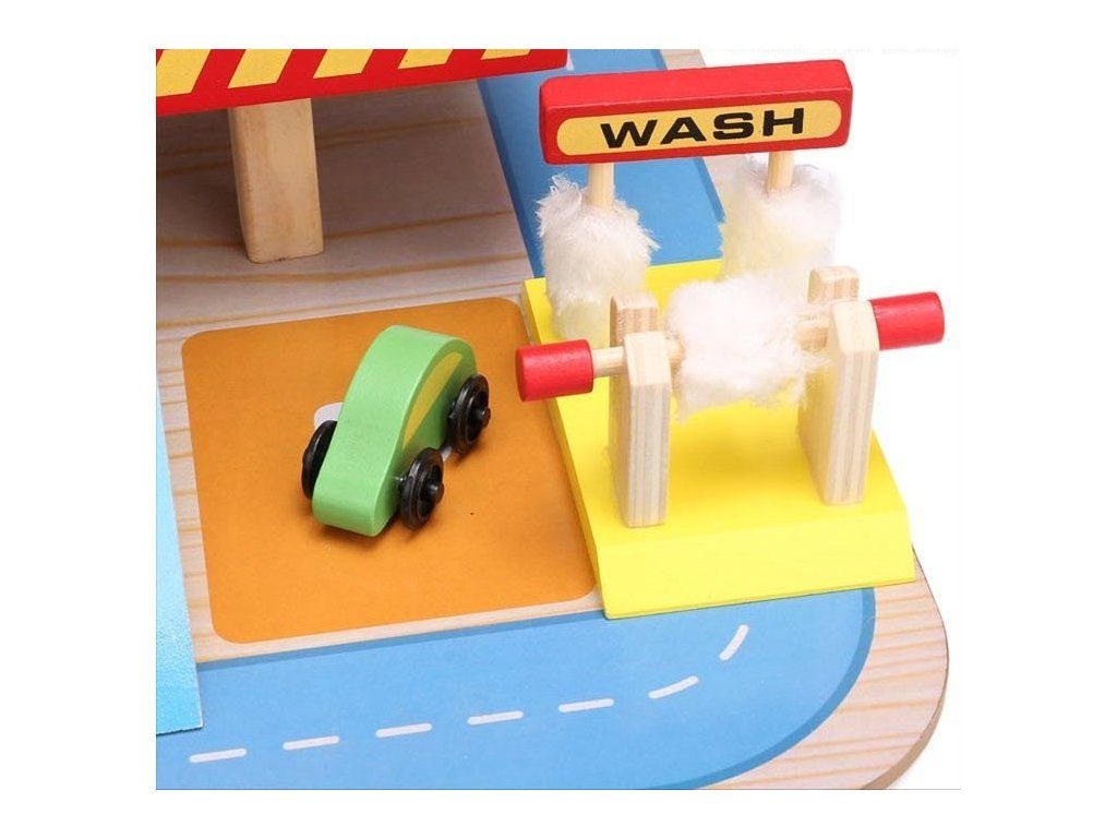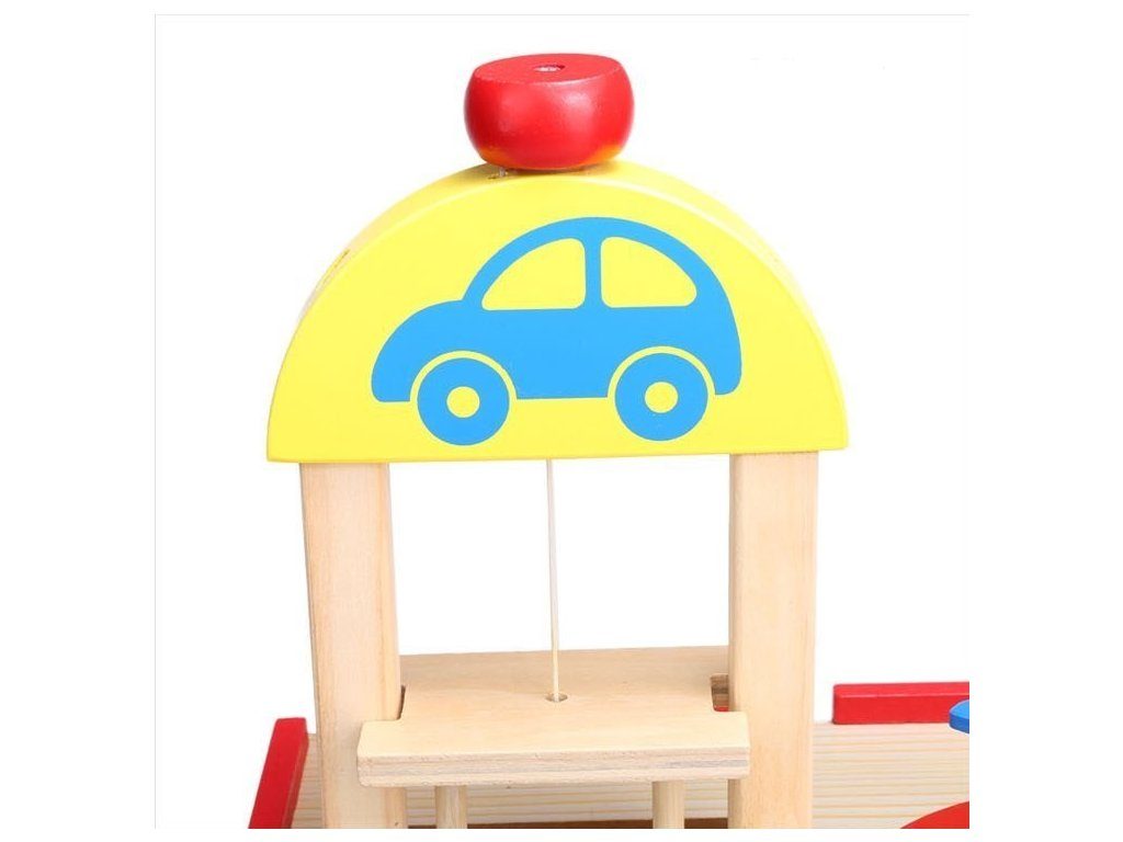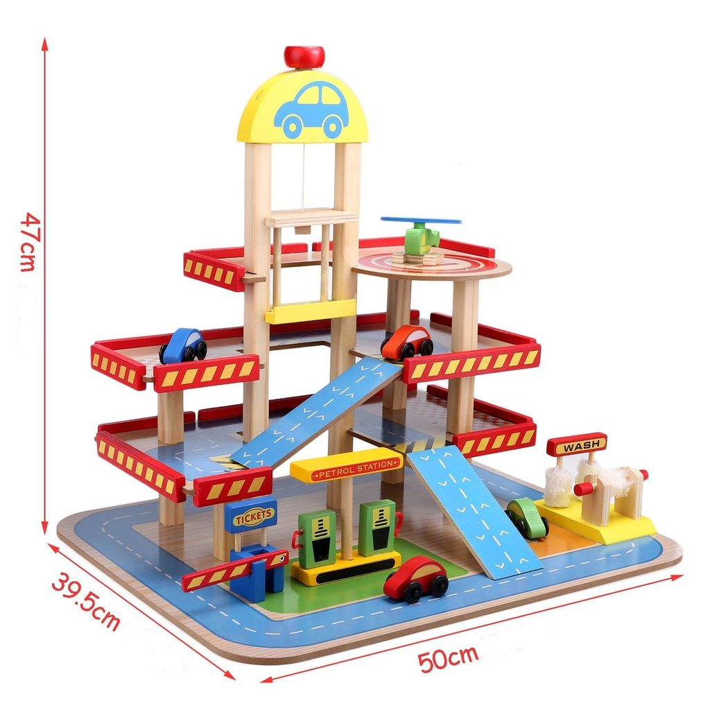 Dřevěná patrová garáž Ecotoys s dřevěnými autíčky a helikoptérou. Součástí je výtah, do kterého se dá vjet z každého patra. Na každém patře jsou mantinely, které zabraňují vypadnutí autíček. Mladý motoristický nadšenec zde nalezne vše co potřebuje. Na střeše garáže je heliport, v přízemí benzínová pumpa a myčka aut. Vyrobena ze dřeva v pestrobarevném provedení bez ostrých hran. Garáž je vhodná pro děti od 3 let věku.