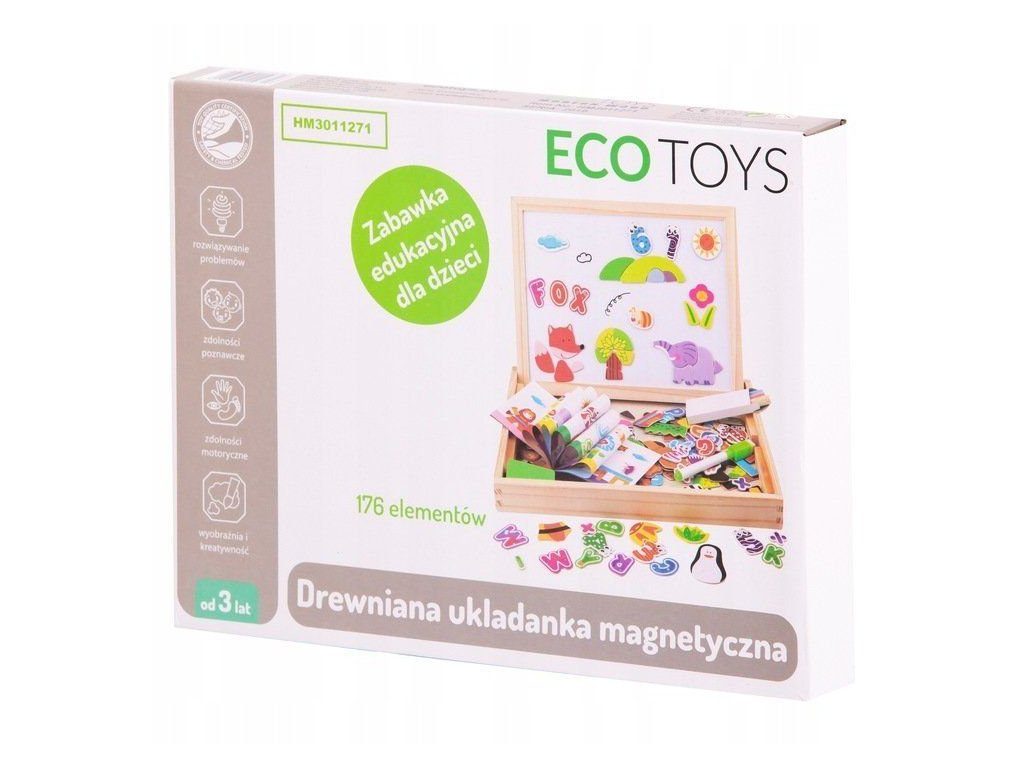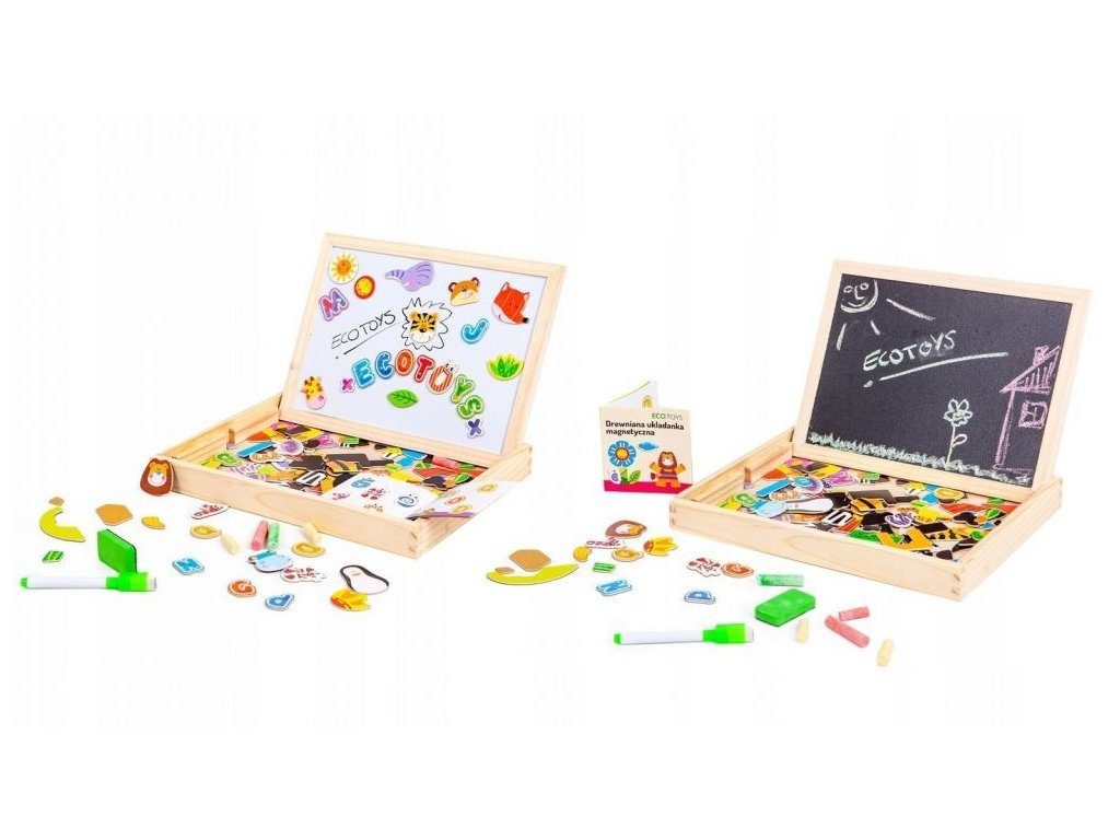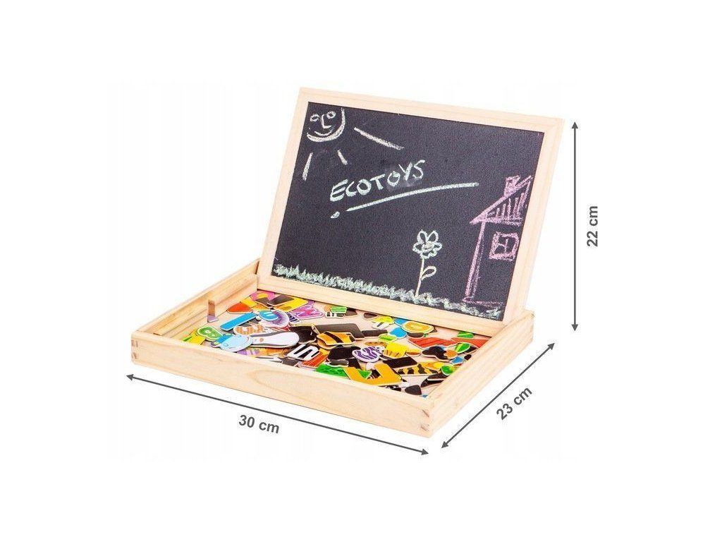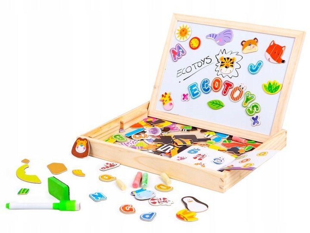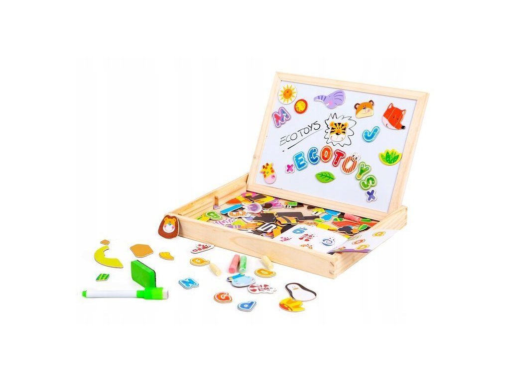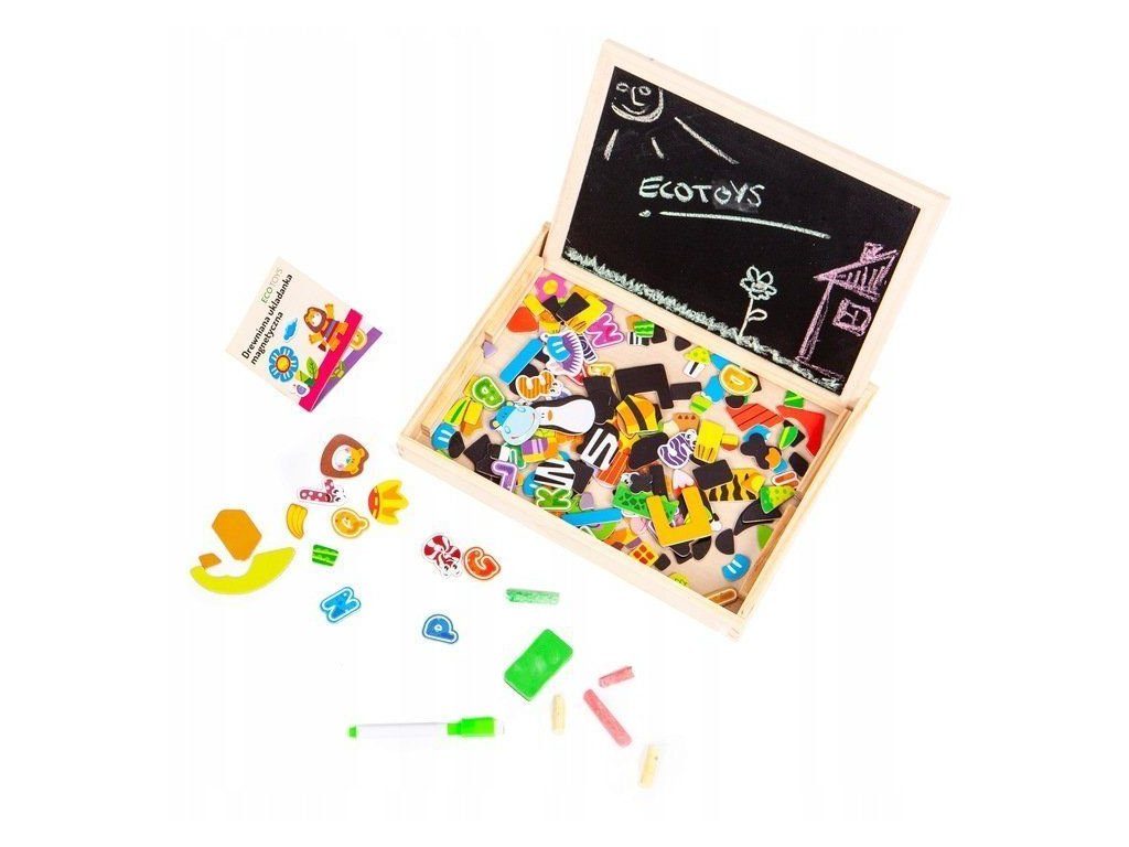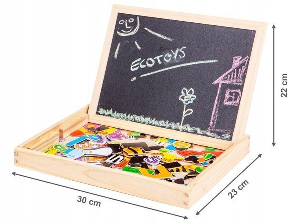Dřevěná multifunkční magnetická tabulka Ecotoys učí dítě porozumět číslům a písmenům. Má dvě možnosti využití a to jako klasickou kreslící tabuli, kdy součástí balení je křída a malinká houbička nebo ho lze využít jako magnetickou tabuli. V balení je celkem 176 ks různobarevných magnetek s vyobrazením čísel, znaků a obrázků. Hračka je určena pro děti od 3 let věku.