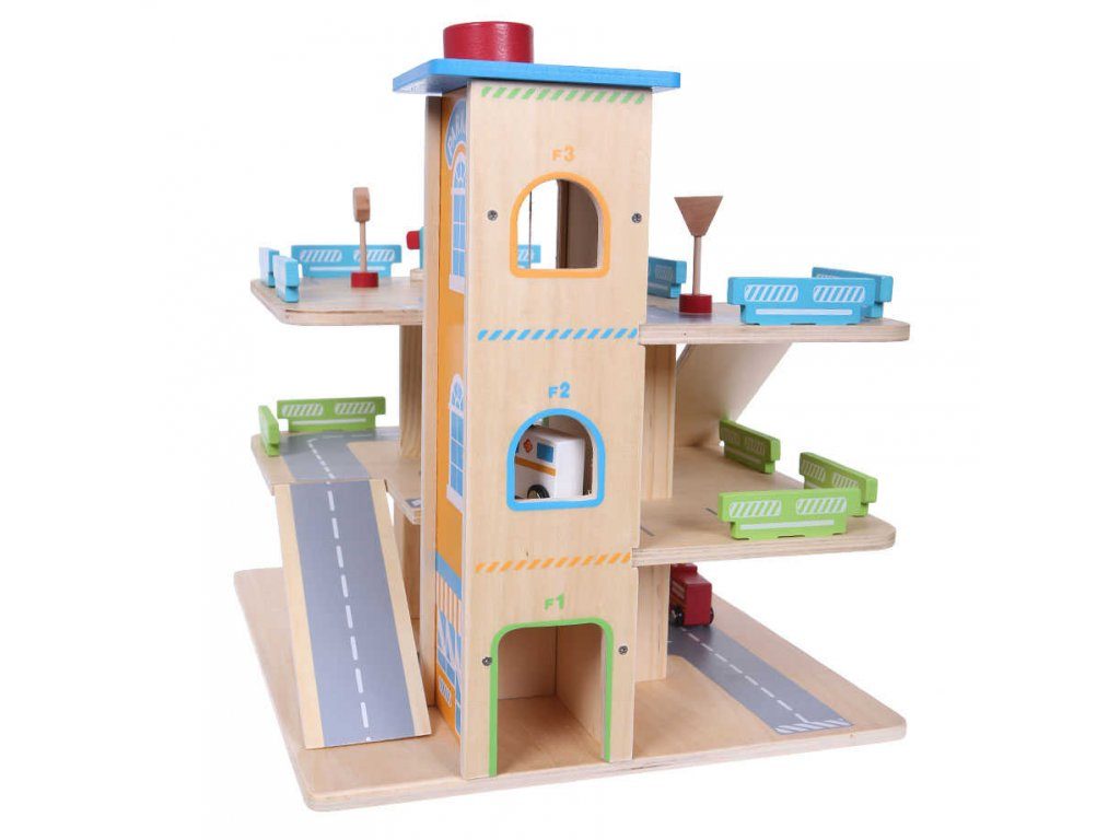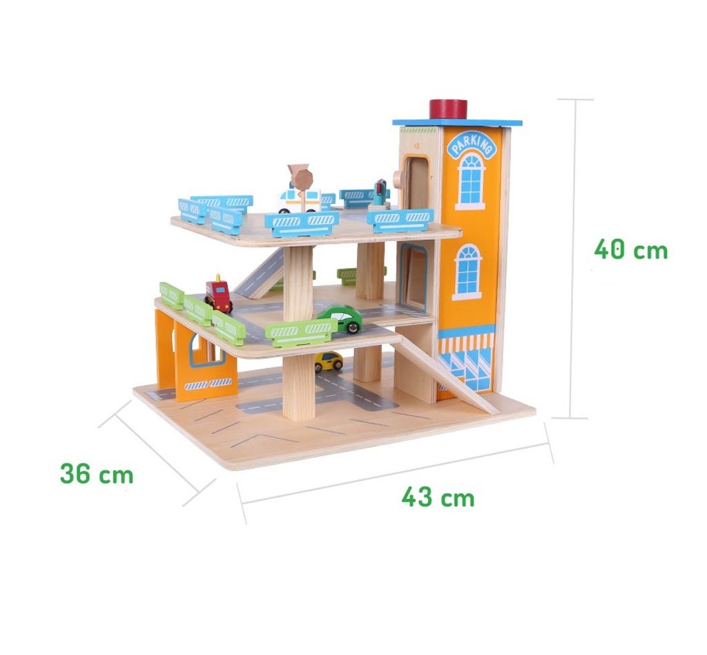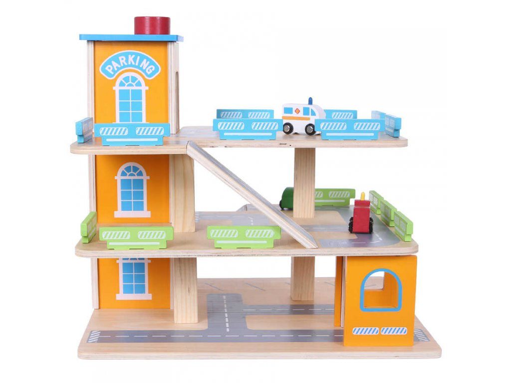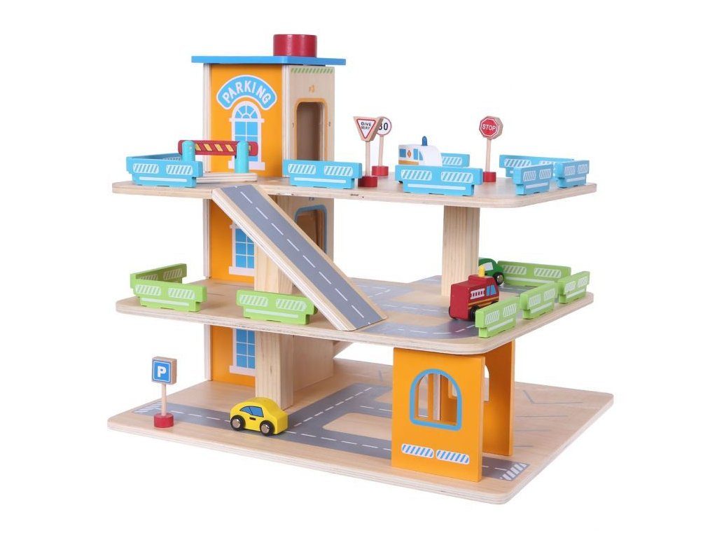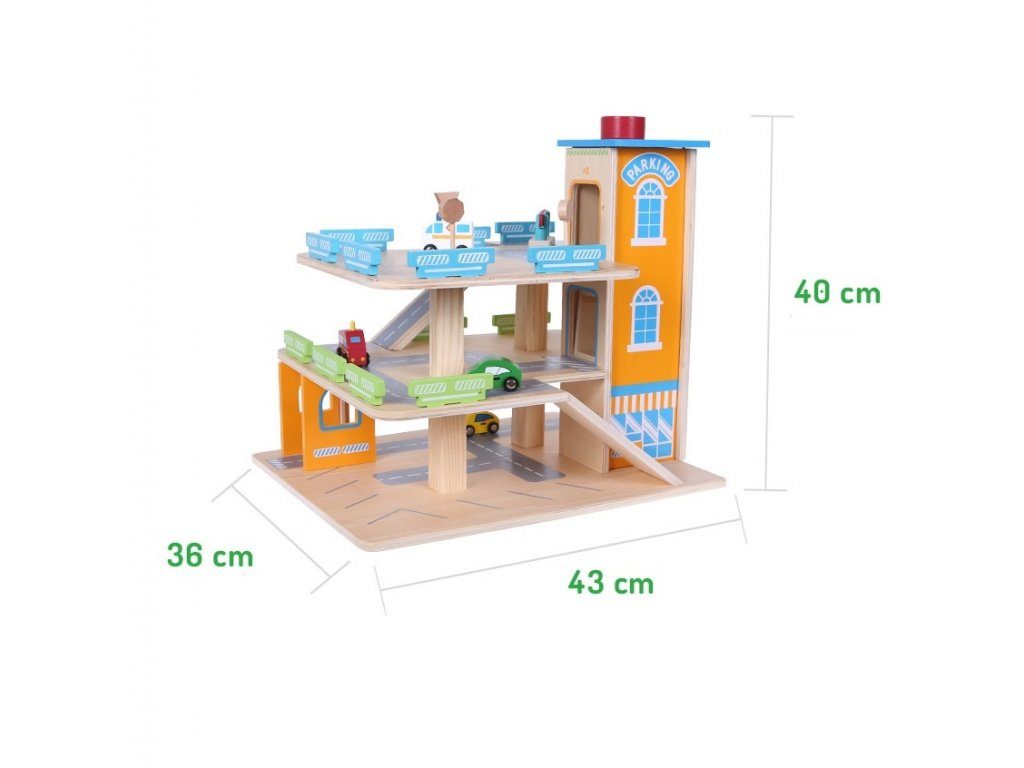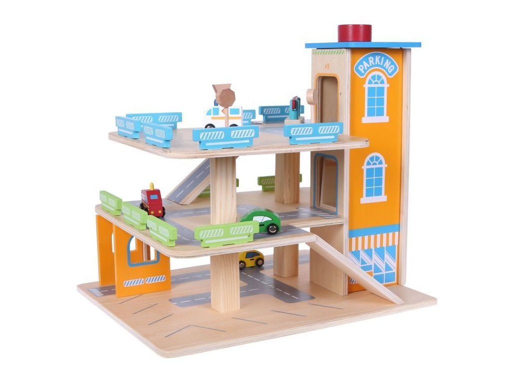 Dřevěná patrová garáž Ecotoys se 4 dřevěnými autíčky, 4 dopravními značkami a pohyblivou závorou. Součástí je výtah, do kterého se dá vjet z každého patra. Na každém patře jsou mantinely, které zabraňují vypadnutí autíček. Mladý motoristický nadšenec zde nalezne vše co potřebuje. Na střeše garáže je heliport. Vyrobena z velmi kvalitního materiálu bez ostrých hran.Garáž je vhodná pro děti od 3 let věku.