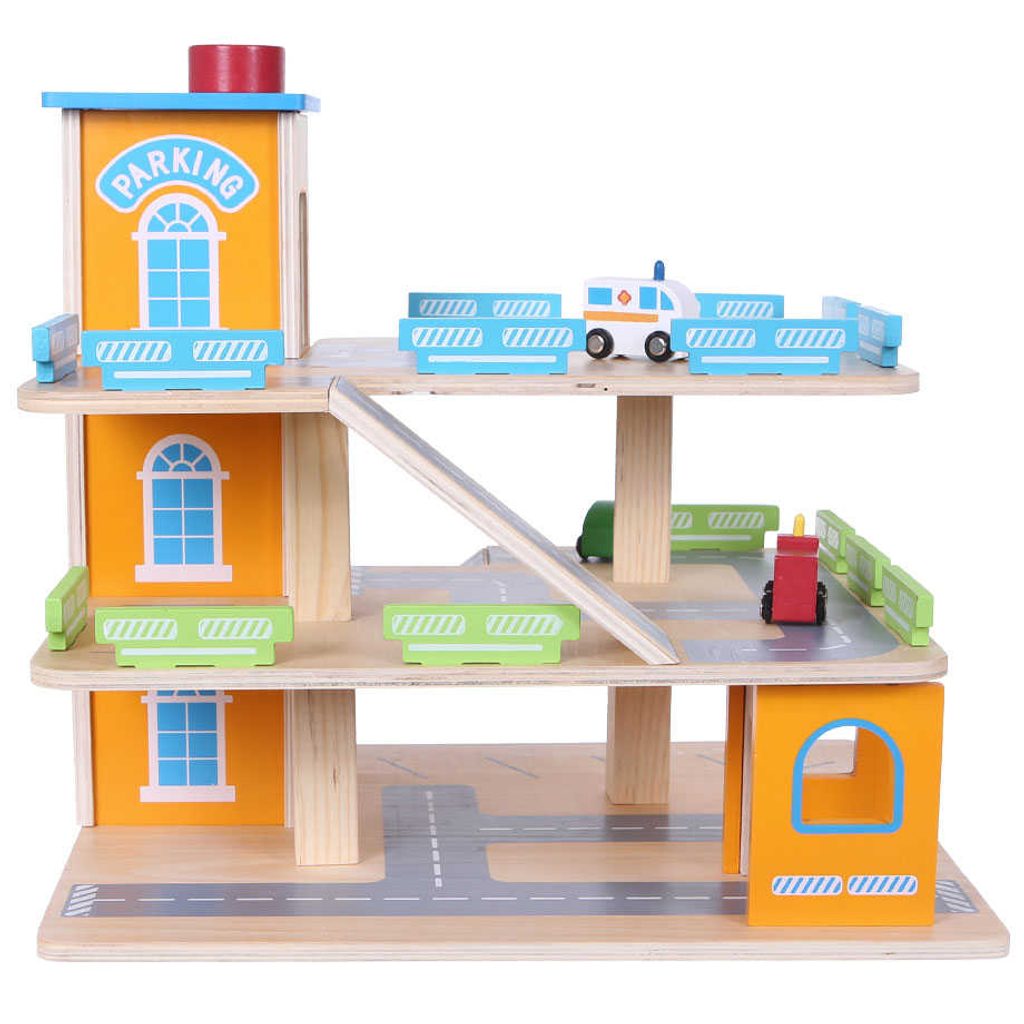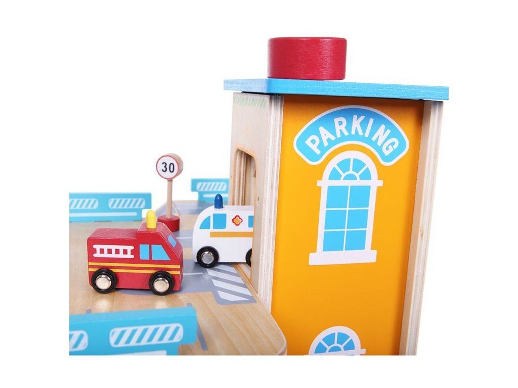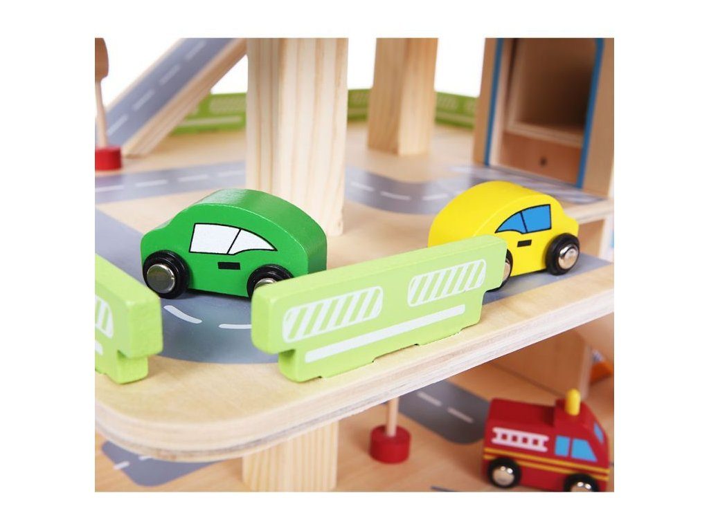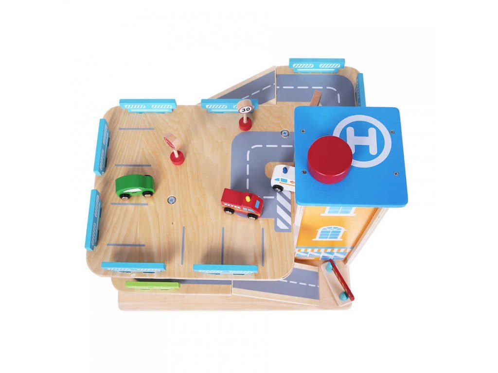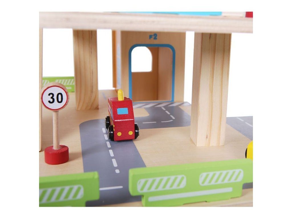 Dřevěná patrová garáž Ecotoys se 4 dřevěnými autíčky, 4 dopravními značkami a pohyblivou závorou. Součástí je výtah, do kterého se dá vjet z každého patra. Na každém patře jsou mantinely, které zabraňují vypadnutí autíček. Mladý motoristický nadšenec zde nalezne vše co potřebuje. Na střeše garáže je heliport. Vyrobena z velmi kvalitního materiálu bez ostrých hran.Garáž je vhodná pro děti od 3 let věku.