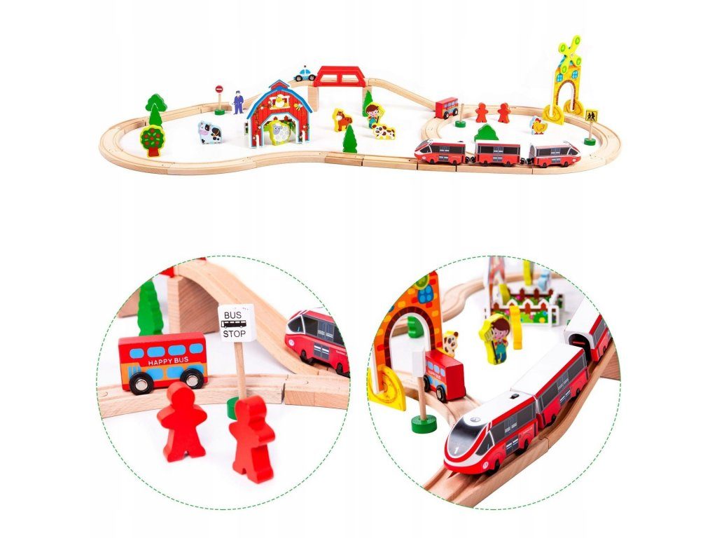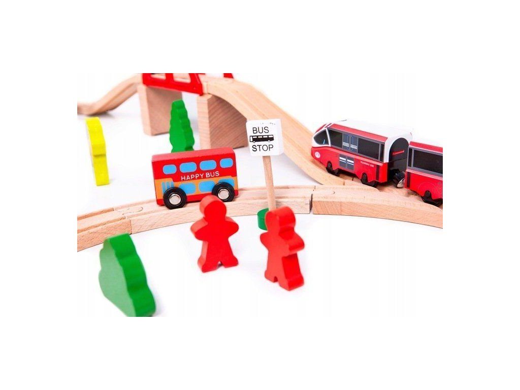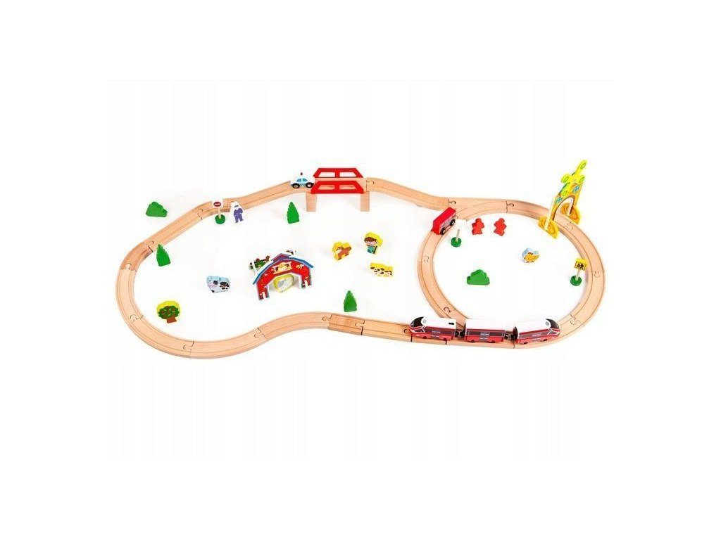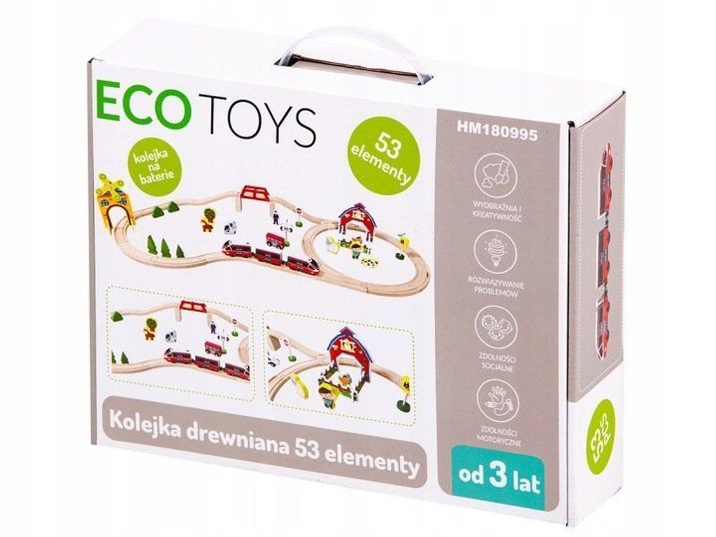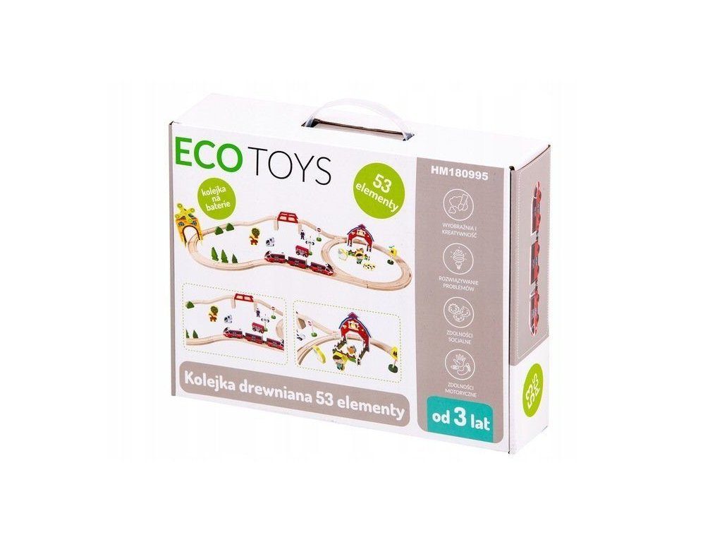 Ecotoys dřevěná vláčkodráha s 53 elementy na baterie podporuje u dětí představivost, kreativitu a logické myšlení. Vláčkodráha je kompletně vybavená, naleznete zde koleje se železničním mostem, 2 lokomotivy, 2 autíčka, dopravní značky, dřevěné stromečky, domeček, figurky a další. Po rozložení má vláčkodráha rozměry 114 x 48 cm. Vše je vyrobeno z kvalitního dřeva bez ostrých hran. Hračka je určena pro děti od 36 měsíců věku.
