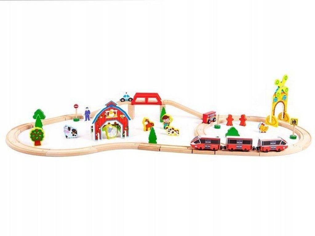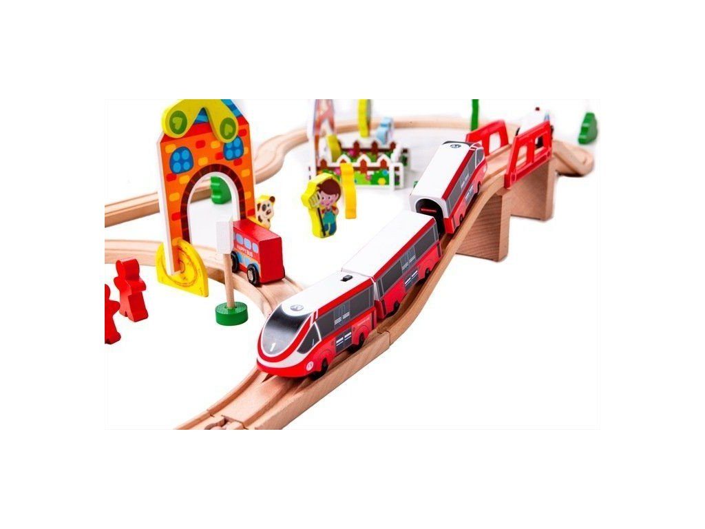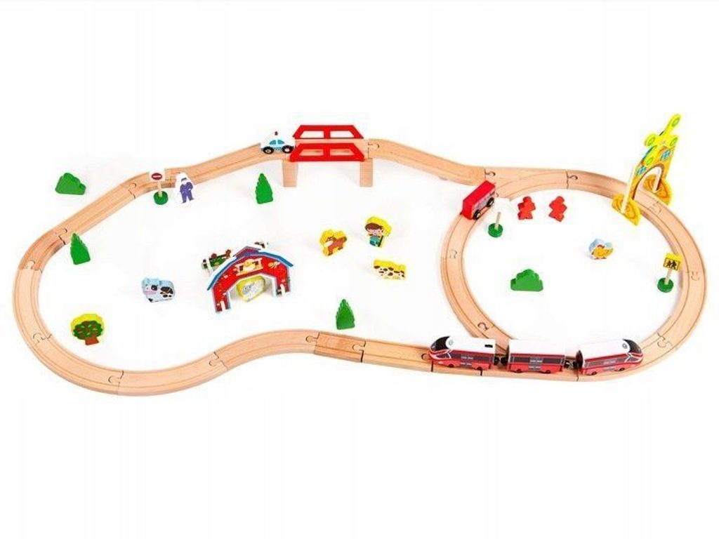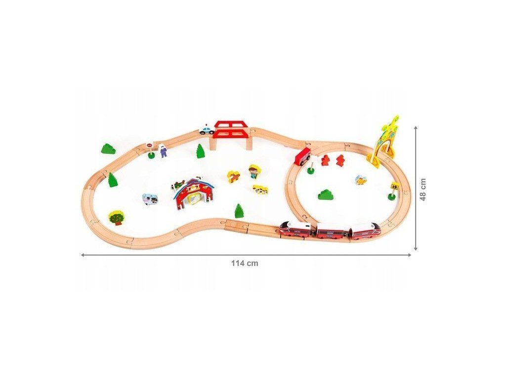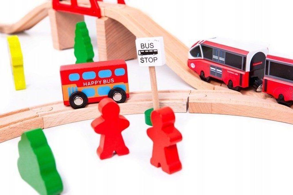 Ecotoys dřevěná vláčkodráha s 53 elementy na baterie podporuje u dětí představivost, kreativitu a logické myšlení. Vláčkodráha je kompletně vybavená, naleznete zde koleje se železničním mostem, 2 lokomotivy, 2 autíčka, dopravní značky, dřevěné stromečky, domeček, figurky a další. Po rozložení má vláčkodráha rozměry 114 x 48 cm. Vše je vyrobeno z kvalitního dřeva bez ostrých hran. Hračka je určena pro děti od 36 měsíců věku.