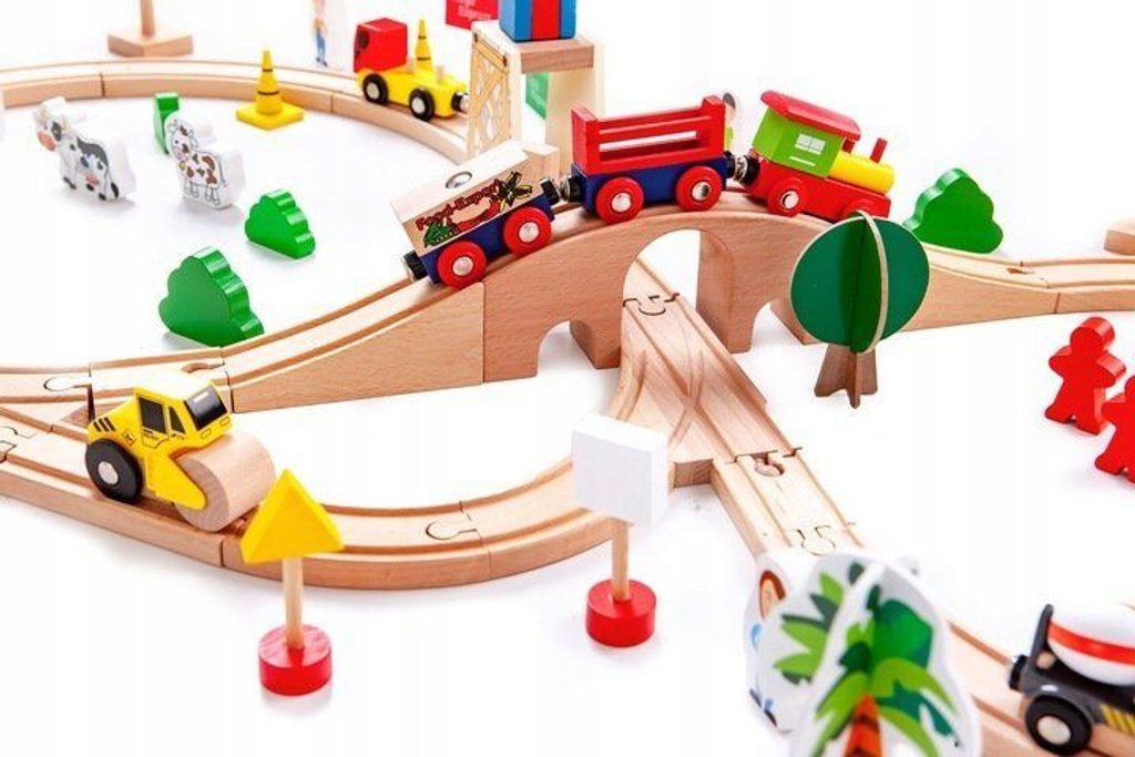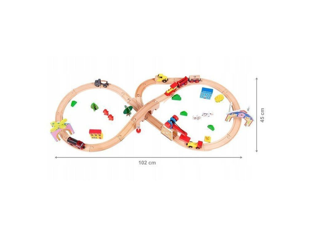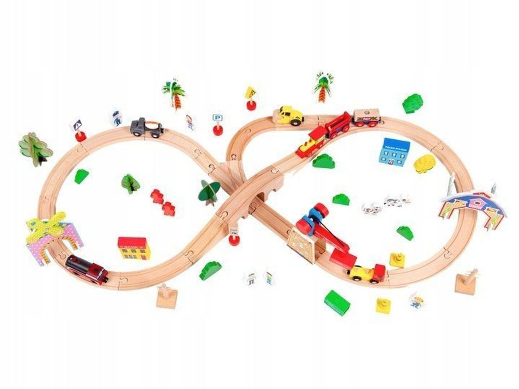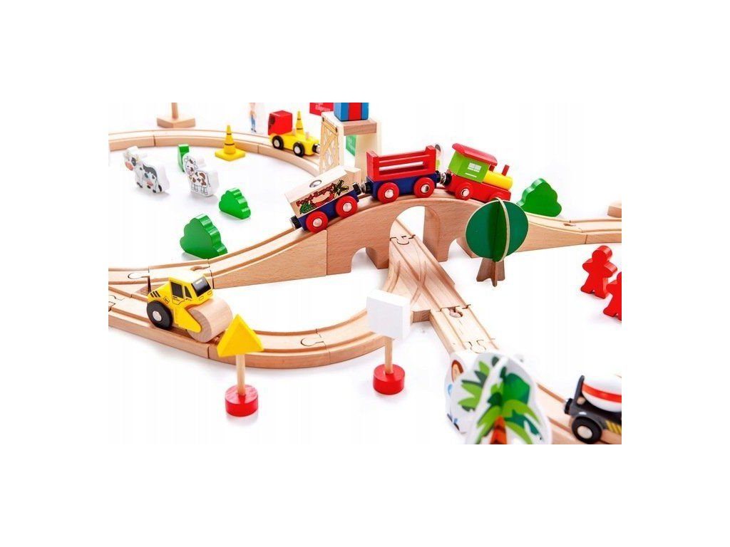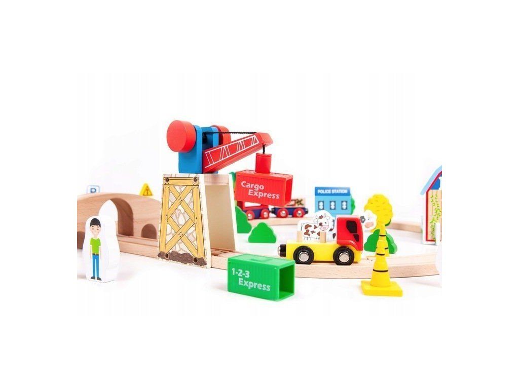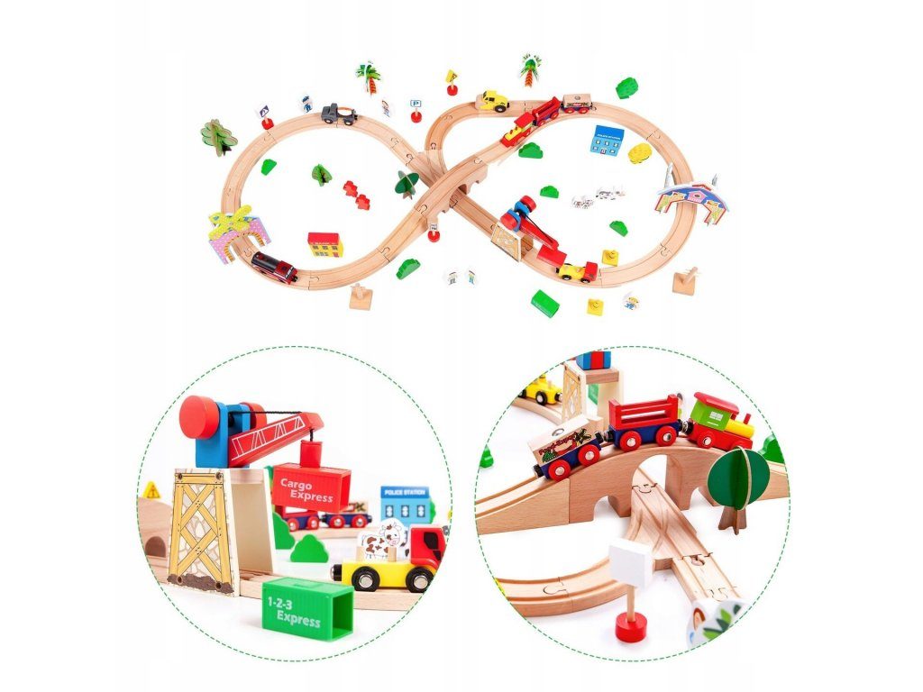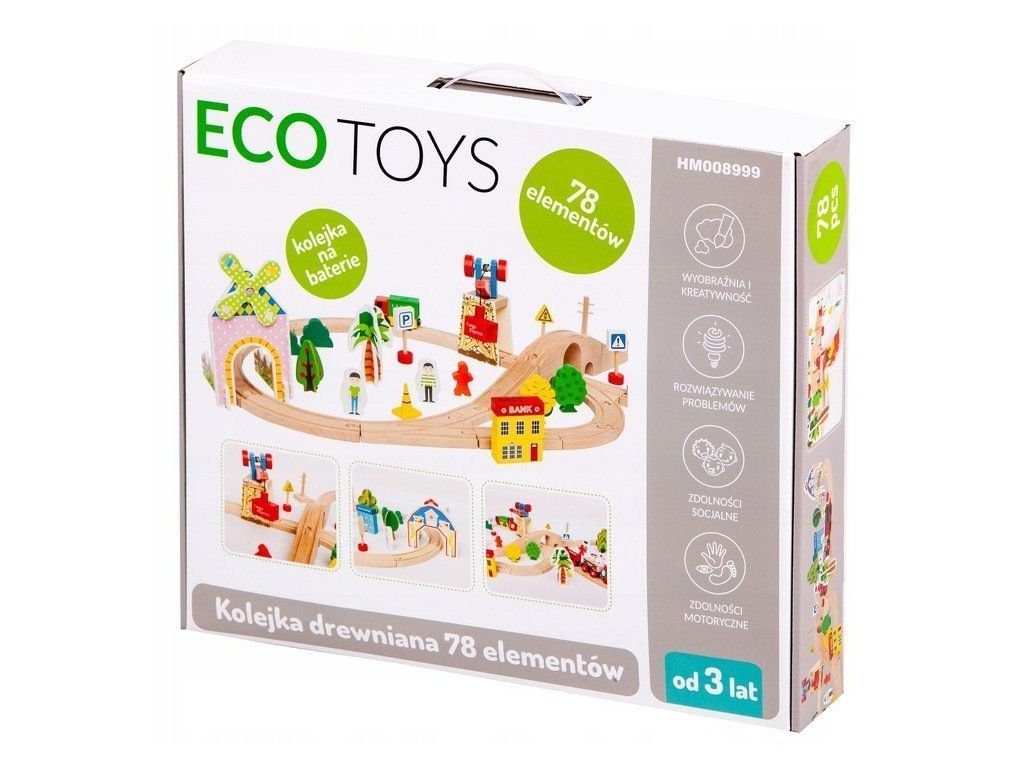 Ecotoys dřevěná vláčkodráha s 53 elementy na baterie podporuje u dětí představivost, kreativitu a logické myšlení. Vláčkodráha je kompletně vybavená, naleznete zde koleje se železničním mostem, tunel s jeřábem, lodní kontejnery, 2 lokomotivy, 3 autíčka, dopravní značky, dřevěné stromečky, domeček, figurky a další. Po rozložení má vláčkodráha rozměry 102 x 45 cm. Vše je vyrobeno z kvalitního dřeva bez ostrých hran. Hračka je určena pro děti od 36 měsíců věku.