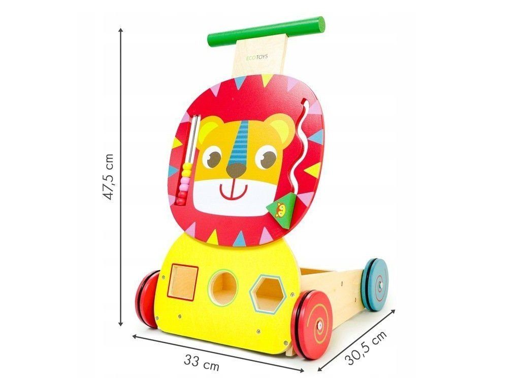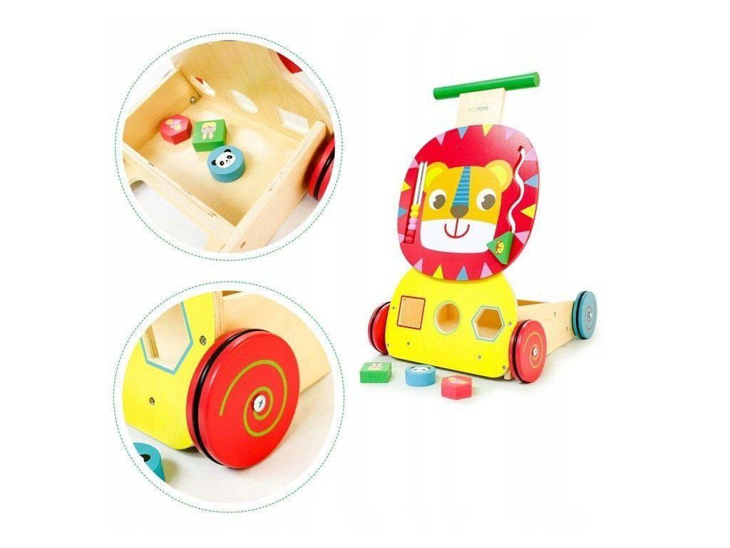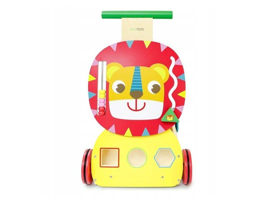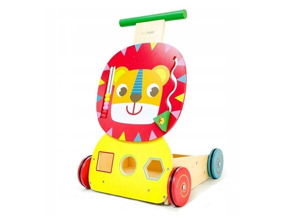 Dětské dřevěné chodítko Ecotoys 2v1 Lvíček je ideální hračkou pro děti již od prvních krůčků. Je vyrobeno ze dřeva v nejvyšší kvalitě tak, že nemá žádné ostré hrany a je pro dítě absolutně bezpečné. Obsahuje spoustu zábavných a barevných prvků jako je počítadlo, labyrint a prohazovací otvory na dřevěné kostky, které jsou součásti balení. Rukojeť je umístěna ve výšce, která usnadňuje chůzi dítěte. Chodítko má také úložný prostor na hračky. Kolečka chodítka jsou vyrobeny z protiskluzového materiálu, který nepoškrábe podlahu. Chodítko je určeno pro děti od 12 měsíců.