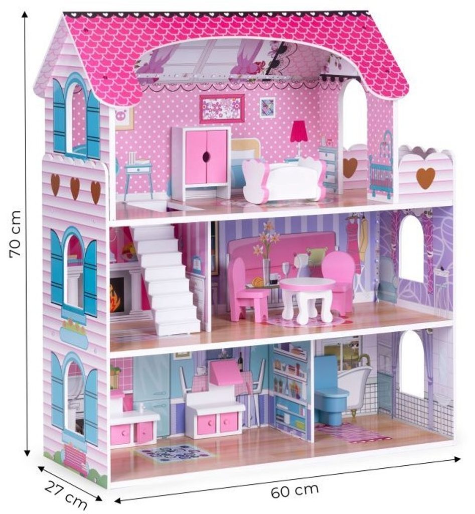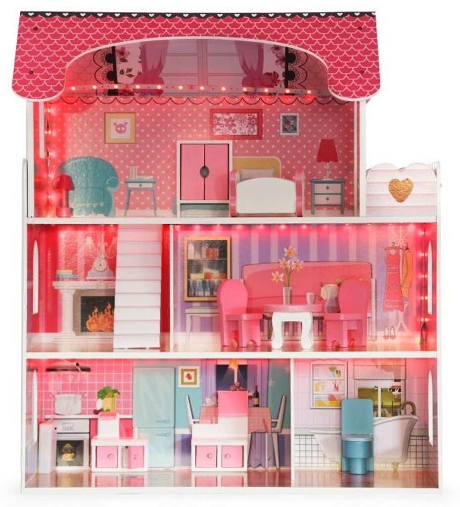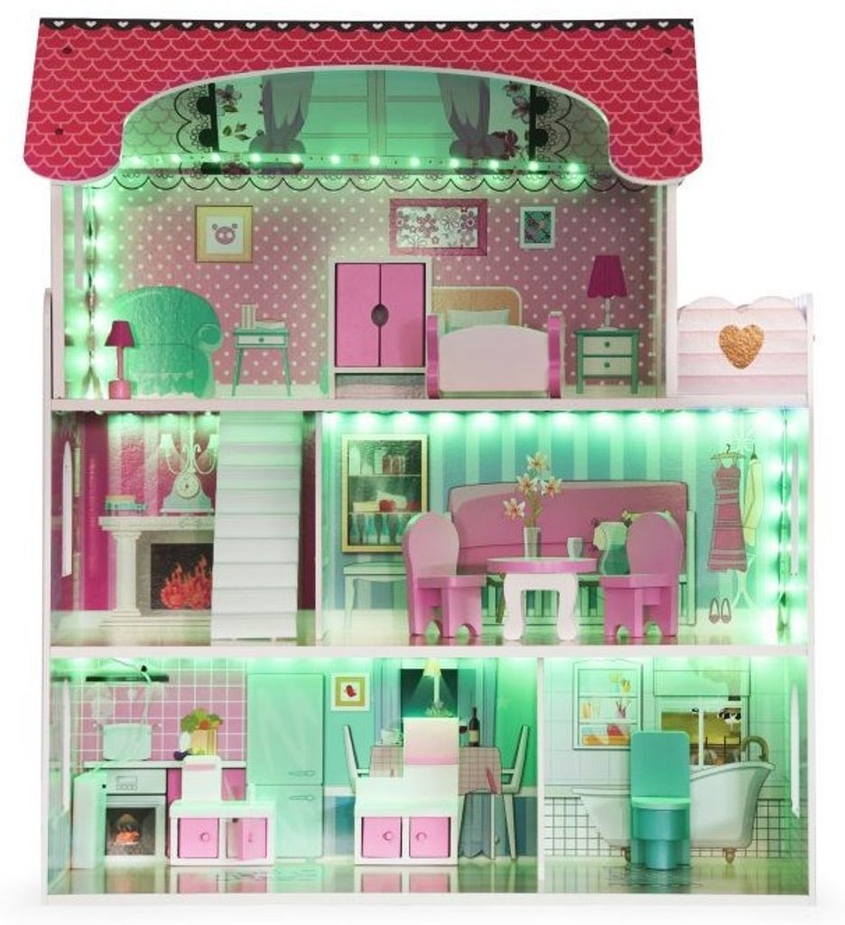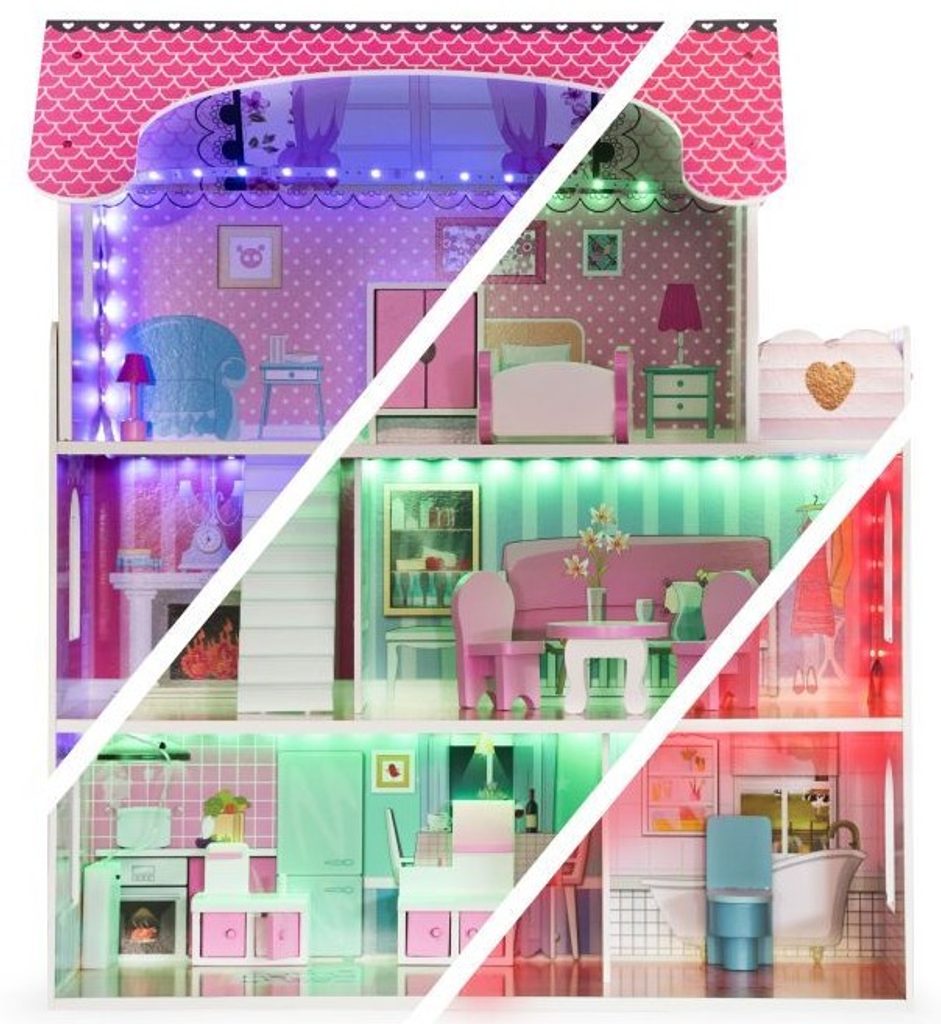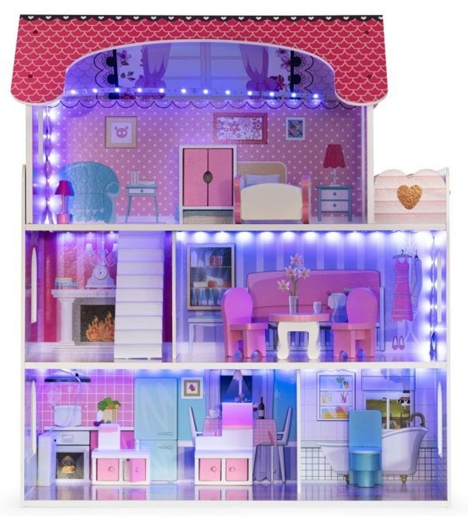 Domeček pro panenky s LED osvětlením Tennessee má 3 nezávislé úrovně, ve kterých je celkem 5 pokojů - vše imituje dokonale skutečný bytový dům. Každý pokoj byl dokončen v jiném stylu, přizpůsoben byl dekor a nábytek charakteru a účelu místnosti. Celý domeček je osvětlený LED páskou, která se ovládá pomocí dálkového ovladače. Součástí soupravy je také sada 7 ks dřevěného nábytku, který lze bez omezení přesunovat. Každý kus nábytku je vyroben ručně, s velkou pozorností k detailu a nejvyšší kvalitě provedení, bylo také dbáno na odstranění ostrých hran, které jsou zásadní pro bezpečnost Vašeho dítěte. Domeček pro panenky je nepochybně nejlepší dárek, který můžete dát Vašemu dítěti! Každá dívka sní o takovém domečku! Rezidence bude vypadat dobře nejen v dětském pokoji, ale i v obývacím pokoji, což povzbudí potěšení všech členů domácnosti. Nemusíte se starat o sestavení domu - jasná příručka s obrázky a číslování všech prvků Vám umožní rychle a efektivně sestavit dům.