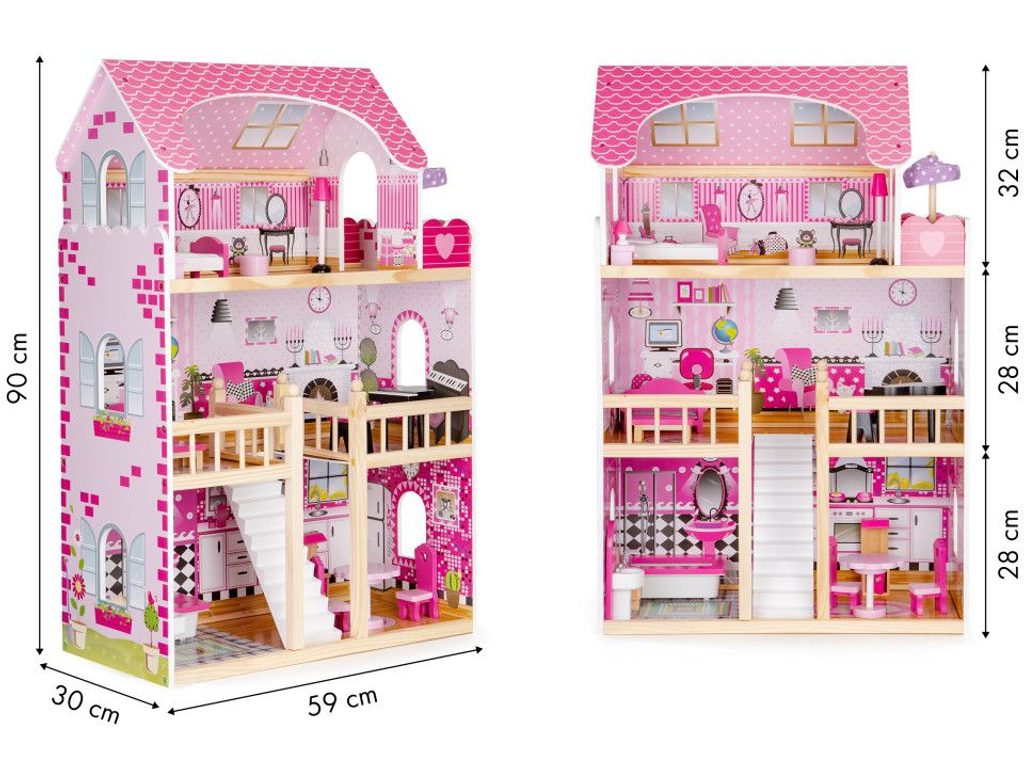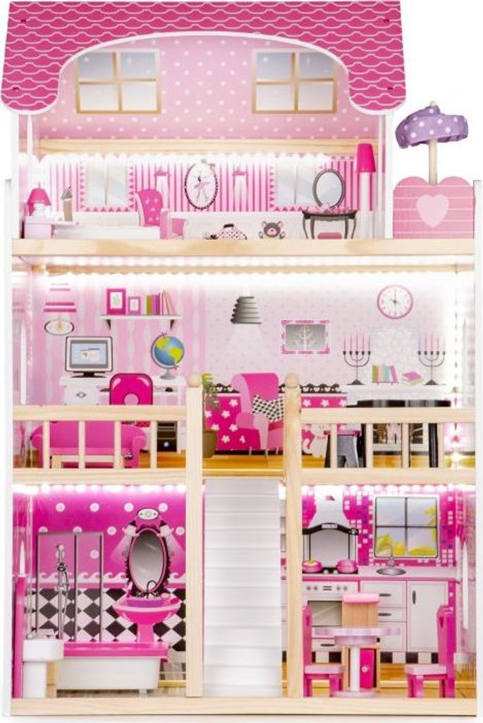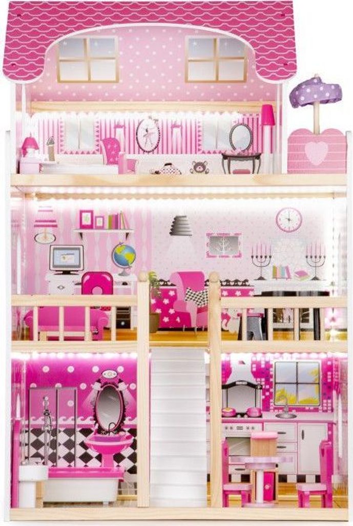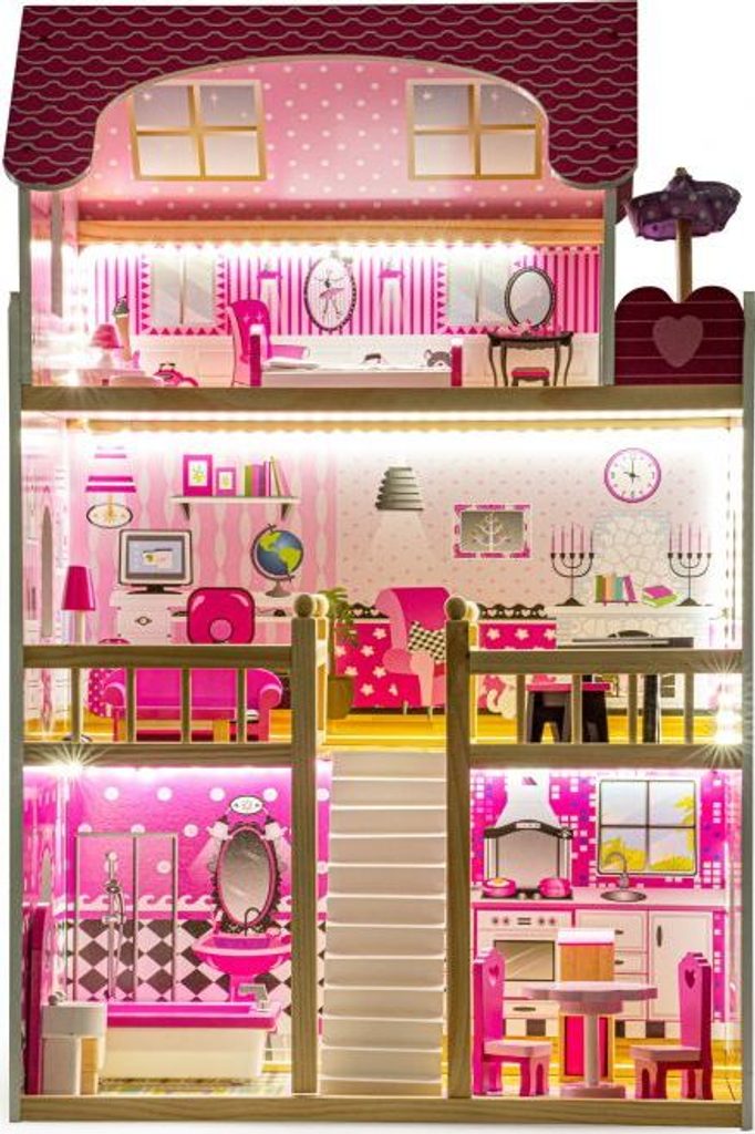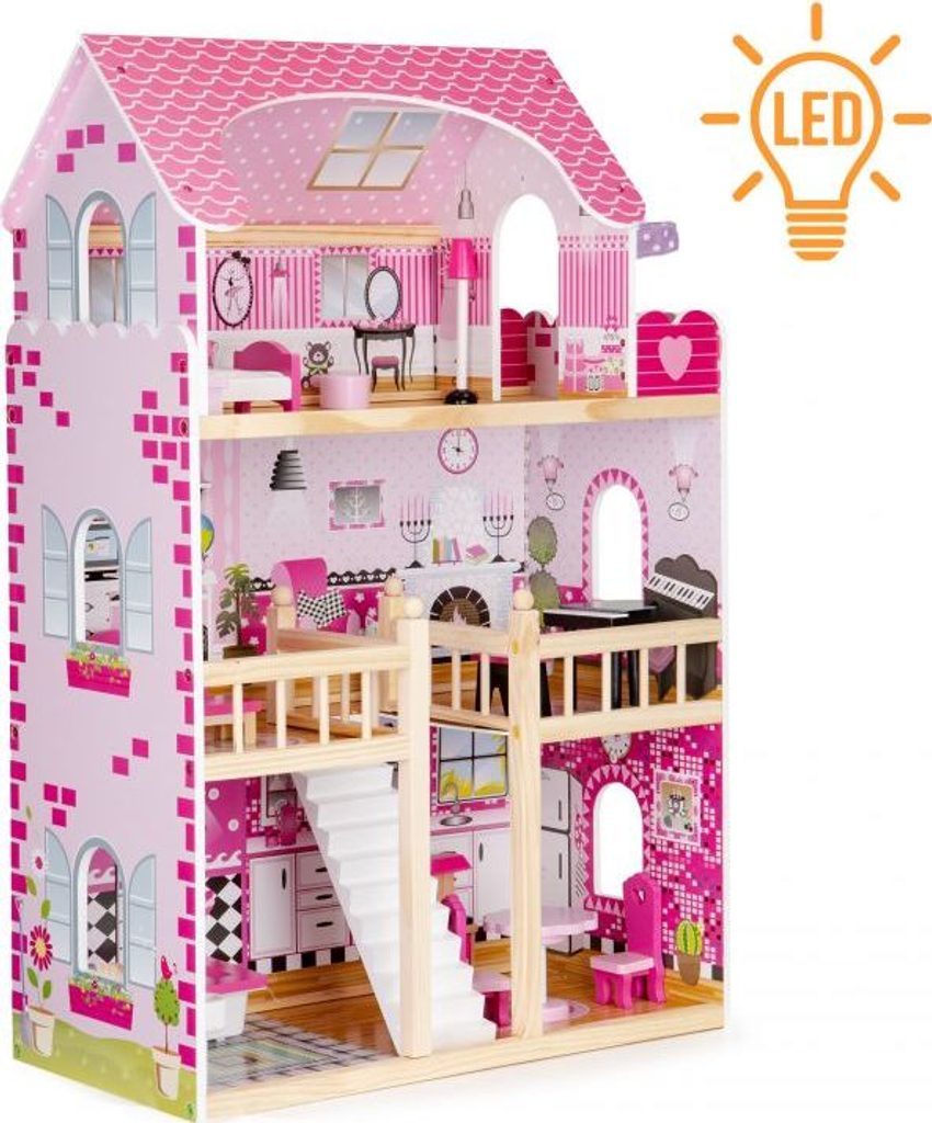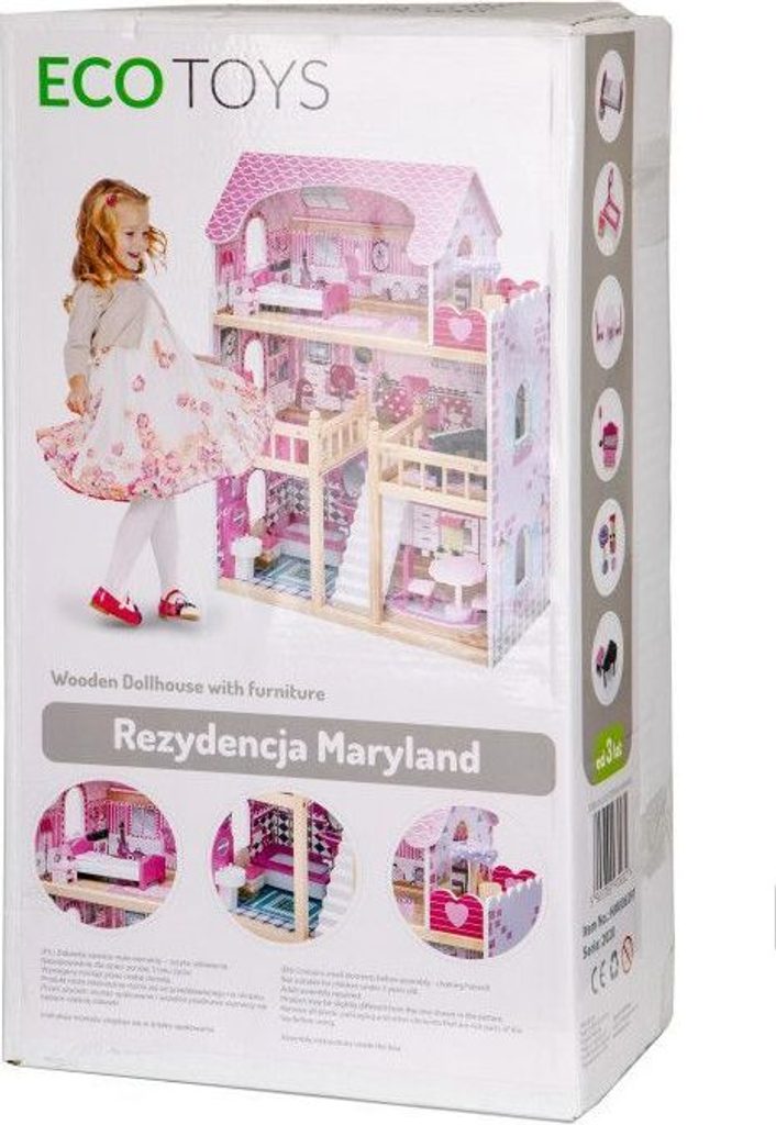 Domeček pro panenky s LED osvětlením Maryland má 3 nezávislé úrovně, ve kterých je celkem 5 pokojů a balkon - vše imituje dokonale skutečný bytový dům. Každý pokoj byl dokončen v jiném stylu, přizpůsoben byl dekor a nábytek charakteru a účelu místnosti. Celý domeček je osvětlený LED páskou, která se ovládá pomocí dálkového ovladače. Součástí soupravy je také sada 16 ks dřevěného nábytku, který lze bez omezení přesunovat. Každý kus nábytku je vyroben ručně, s velkou pozorností k detailu a nejvyšší kvalitě provedení, bylo také dbáno na odstranění ostrých hran, které jsou zásadní pro bezpečnost Vašeho dítěte. Domeček pro panenky je nepochybně nejlepší dárek, který můžete dát Vašemu dítěti! Každá dívka sní o takovém domečku! Rezidence bude vypadat dobře nejen v dětském pokoji, ale i v obývacím pokoji, což povzbudí potěšení všech členů domácnosti. Nemusíte se starat o sestavení domu - jasná příručka s obrázky a číslování všech prvků Vám umožní rychle a efektivně sestavit dům.