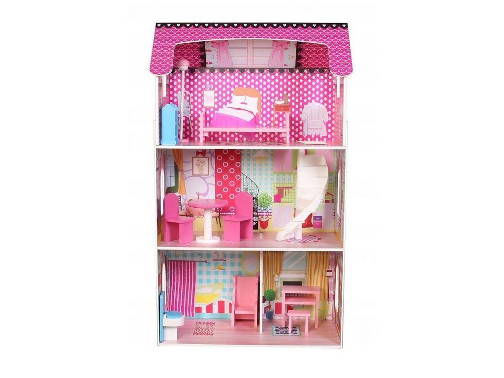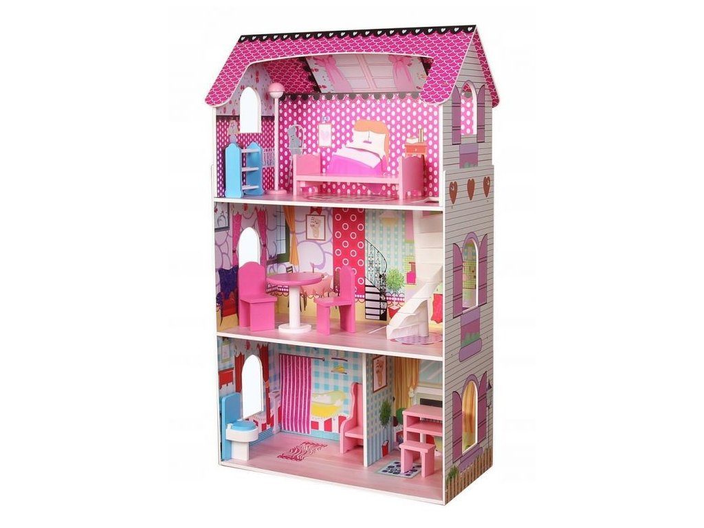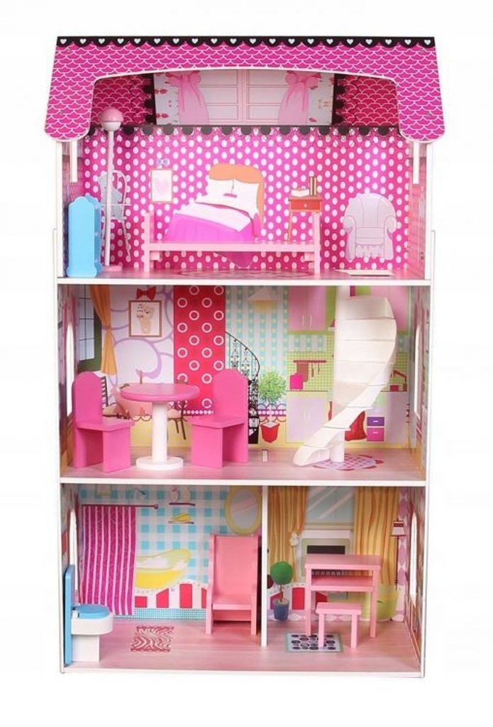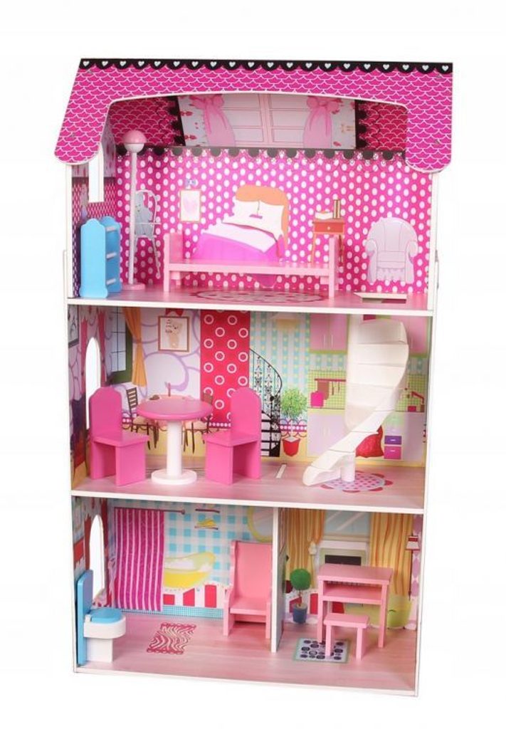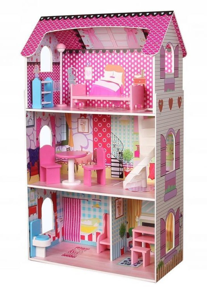 DOMEČEK PRO PANENKY SE 3 PATRY. Celý domeček má 3 nezávislé úrovně, ve kterých jsou celkem 4 pokoje - vše imituje dokonale skutečný bytový dům. Každý pokoj byl dokončen v jiném stylu, přizpůsoben byl dekor a nábytek charakteru a účelu místnosti. Součástí soupravy je také sada 10 ks dřevěného nábytku, který lze bez omezení přesunovat. Každý kus nábytku je vyroben ručně, s velkou pozorností k detailu a nejvyšší kvalitě provedení, bylo také dbáno na odstranění ostrých hran, které jsou zásadní pro bezpečnost Vašeho dítěte. Domeček pro panenky je nepochybně nejlepší dárek, který můžete dát Vašemu dítěti! Každá dívka sní o takovém domečku! Rezidence Malinová bude vypadat dobře nejen v dětském pokoji, ale i v obývacím pokoji, což povzbudí potěšení všech členů domácnosti. Nemusíte se starat o sestavení domu - jasná příručka s obrázky a číslování všech prvků Vám umožní rychle a efektivně sestavit dům.