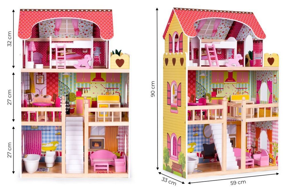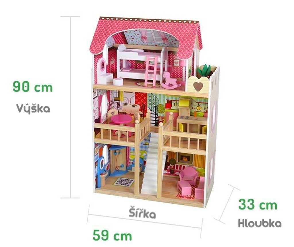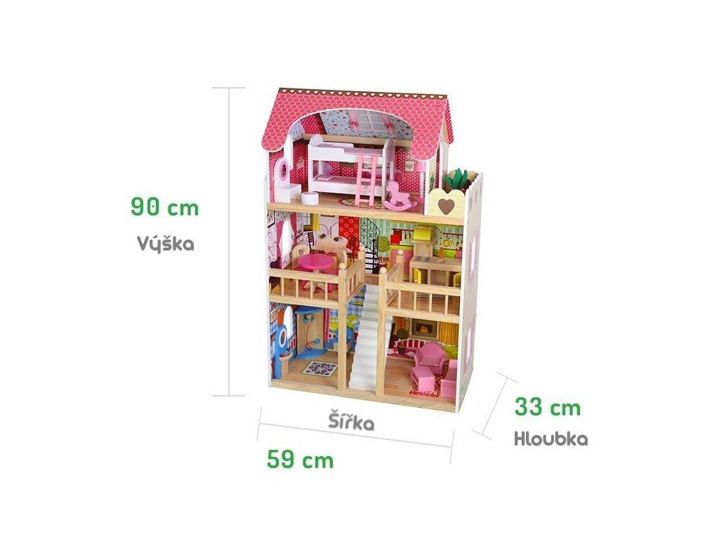 ROZMĚRY Přibližné rozměry domečku: 60 cm x 30 cm x 90 cm (šířka x hloubka x výška) První a druhé patro propojené schody. Výška podlahy je cca 27 cm. V podkroví, pro snadný přístup a pohodlnou zábavu je domečku speciálně profilovaná. Výška podkroví je cca 32 cm.