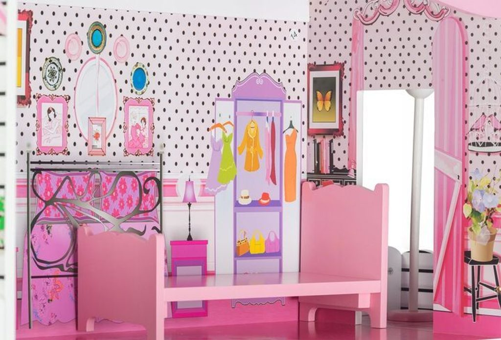 Domeček je určen pro větší panenky Barbie. První a druhé patro propojené pohyblivým výtahem. Výška patra je cca 35 cm.