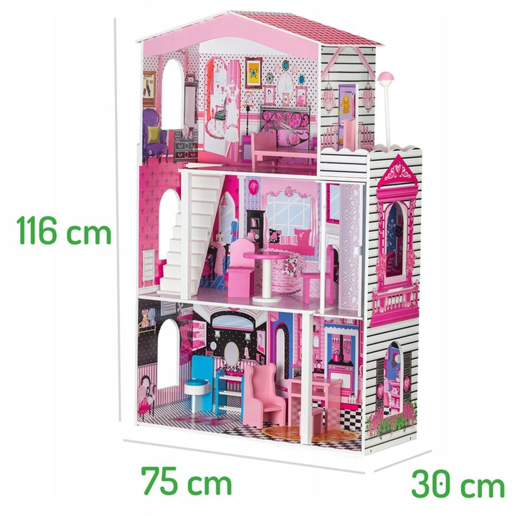 ROZMĚRY Přibližné rozměry domečku jsou 75 cm x 30 cm x 116 cm (šířka x hloubka x výška) Druhé a třetí patro je propojené schody. Výška patra je 35 cm. Podkroví je speciálně vyprofilované pro snadný přístup. Výška je 45 cm.