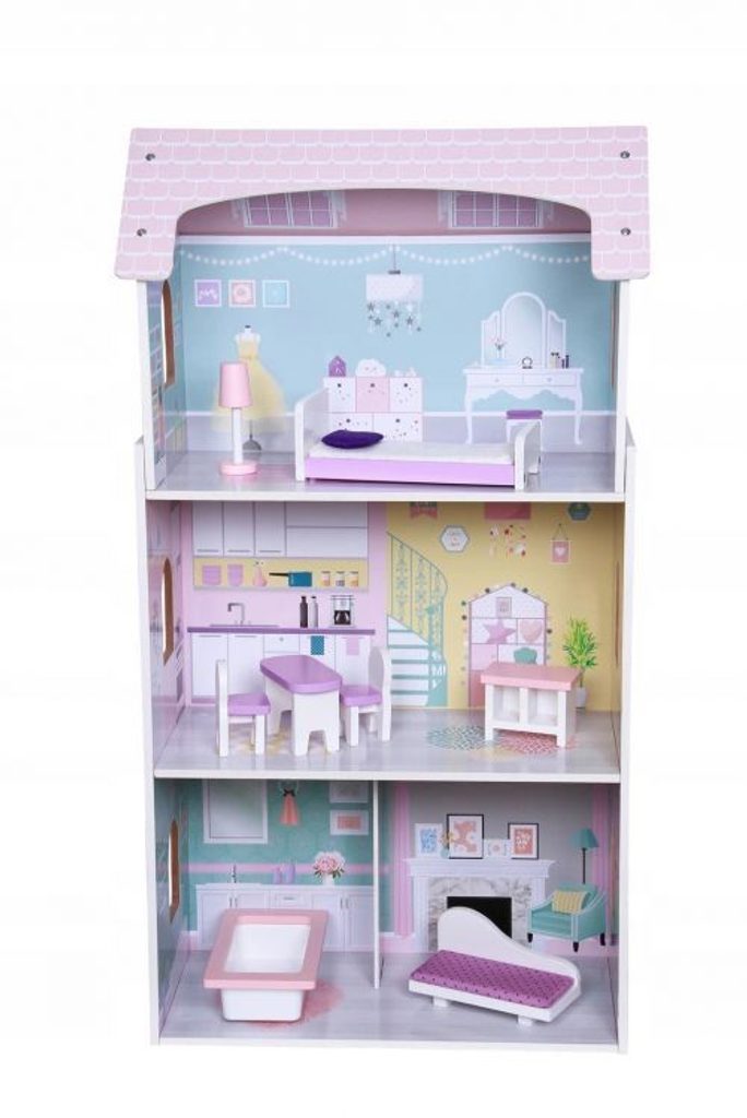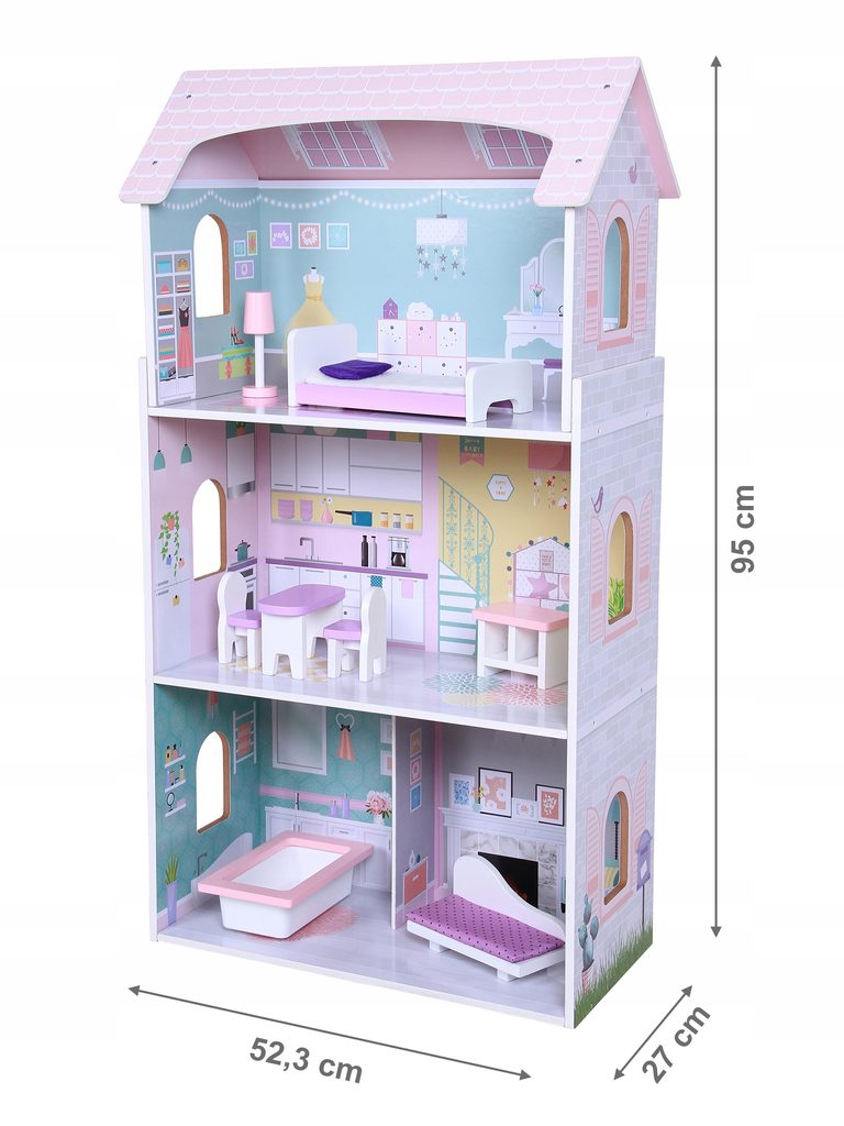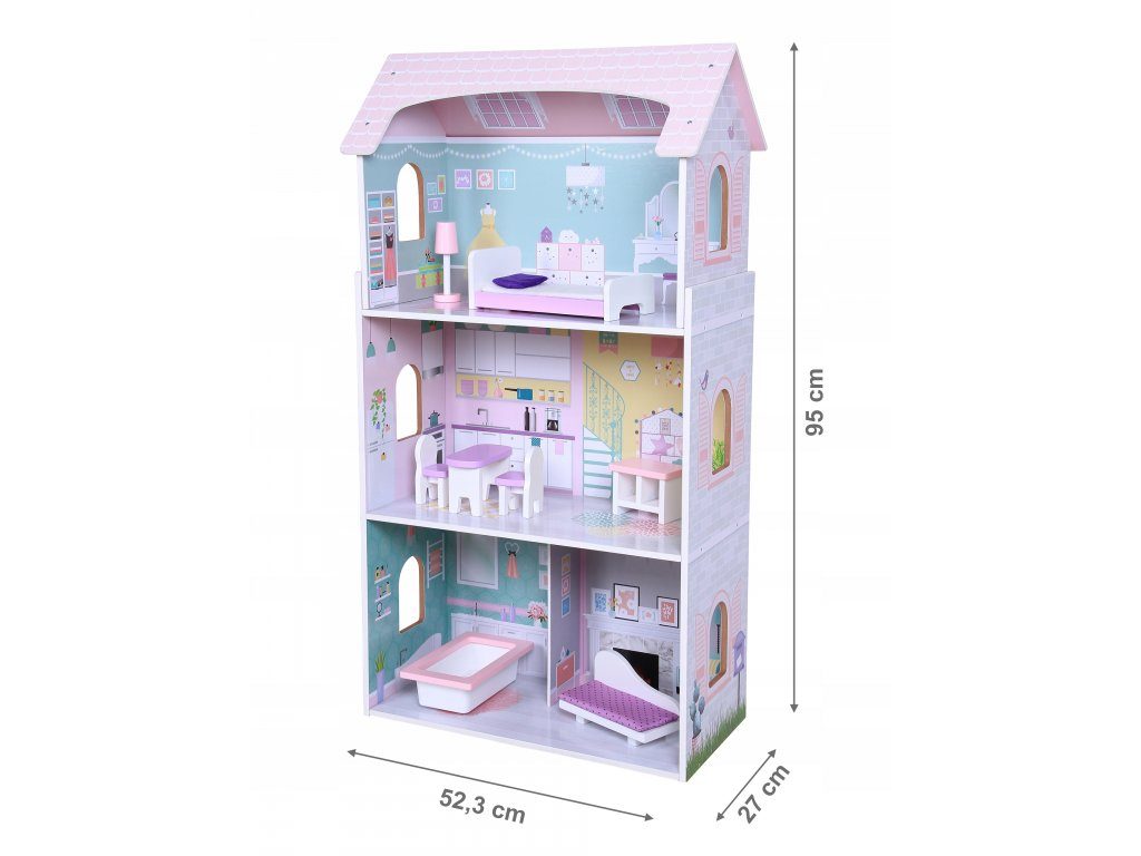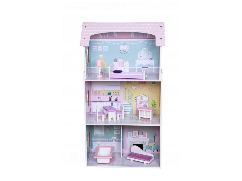Domeček pro panenky se 3 patry rezidence Jahodová. Celý domeček má 3 nezávislé úrovně, ve kterých jsou celkem 4 pokoje - vše imituje dokonale skutečný bytový dům. Každý pokoj byl dokončen v jiném stylu, přizpůsoben byl dekor a nábytek charakteru a účelu místnosti. Součástí soupravy je také sada 8 ks dřevěného nábytku, který lze bez omezení přesunovat. Každý kus nábytku je vyroben ručně, s velkou pozorností k detailu a nejvyšší kvalitě provedení, bylo také dbáno na odstranění ostrých hran, které jsou zásadní pro bezpečnost Vašeho dítěte. Domeček pro panenky je nepochybně nejlepší dárek, který můžete dát Vašemu dítěti! Každá dívka sní o takovém domečku! Rezidence Jahodová bude vypadat dobře nejen v dětském pokoji, ale i v obývacím pokoji, což povzbudí potěšení všech členů domácnosti. Nemusíte se starat o sestavení domu - jasná příručka s obrázky a číslování všech prvků Vám umožní rychle a efektivně sestavit dům.