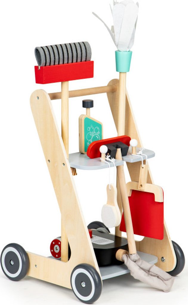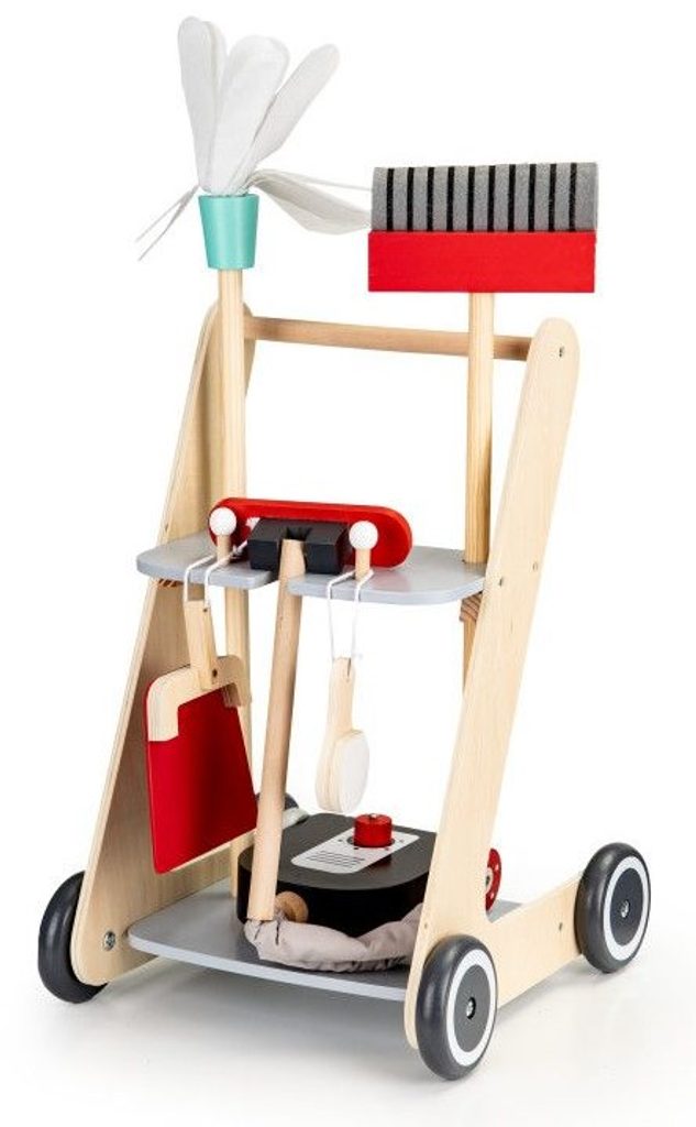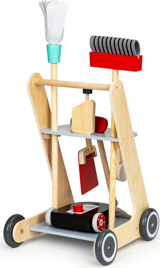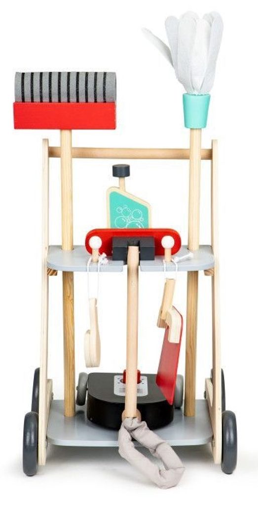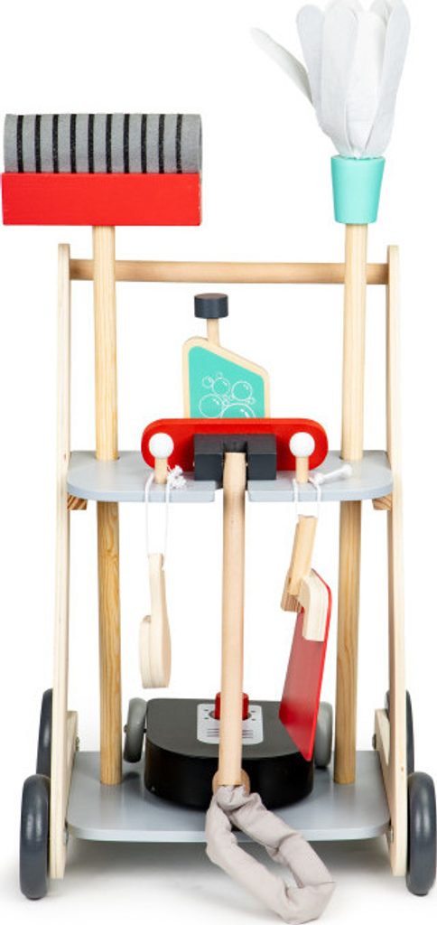 Ecotoys dřevěný úklidový vozíček s příslušenstvím umožní dítěti stát se pravým pánem nebo paní domu. Najde zde vše potřebné pro úklid domácnosti. Vysavač s látkovou hadici, dlouhou metlu, lopatku se smetáčkem a imitaci čistícího prostředku. Ve spodní části a střední jsou umístěny praktické police.  Hračka je vyrobena ze dřeva a je určena pro děti od 36 měsíců věku.