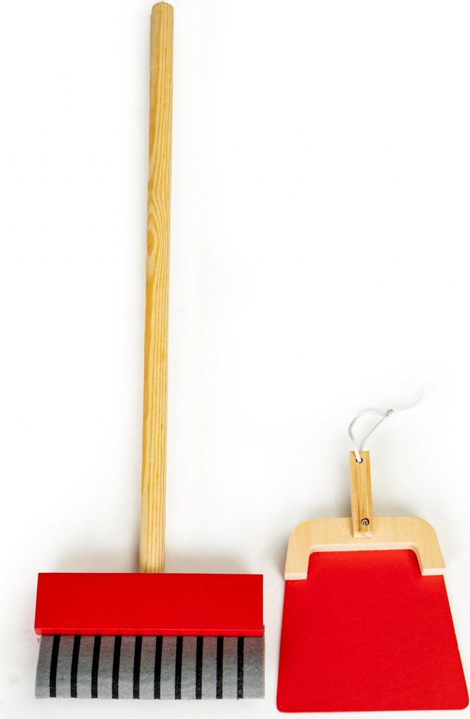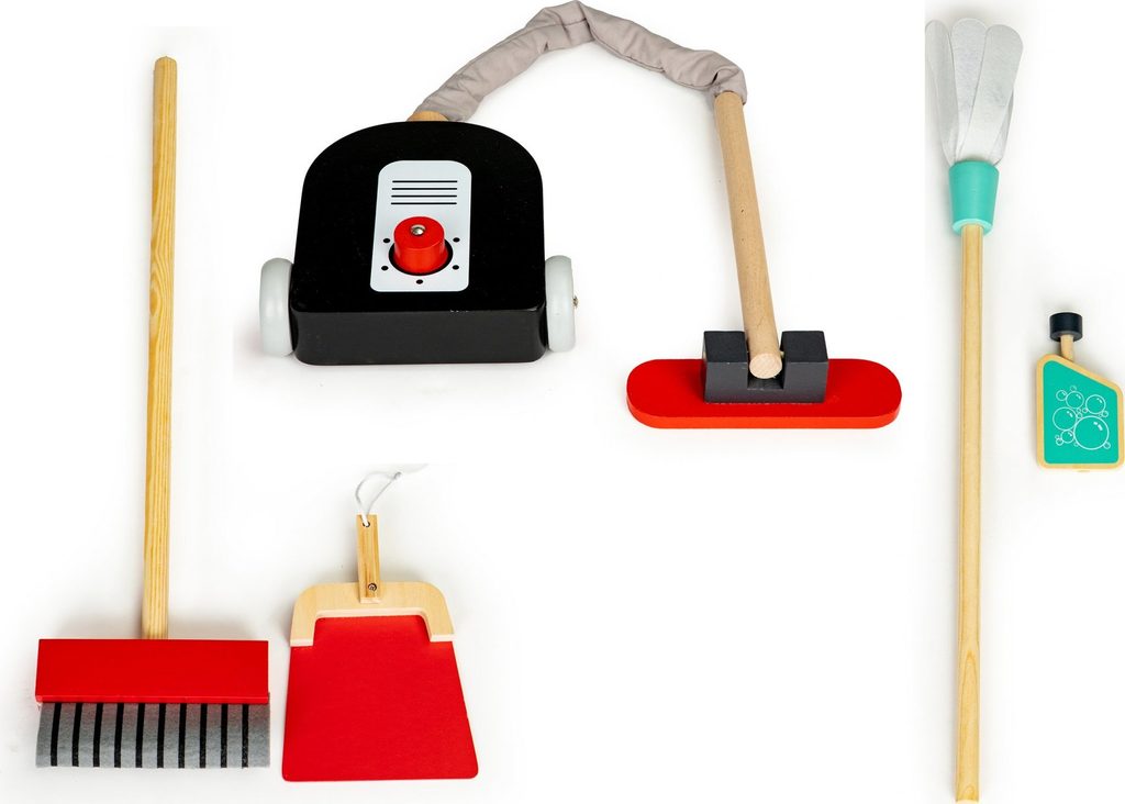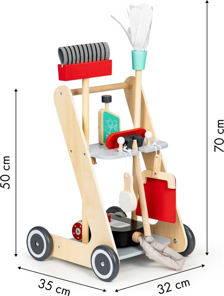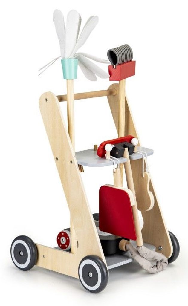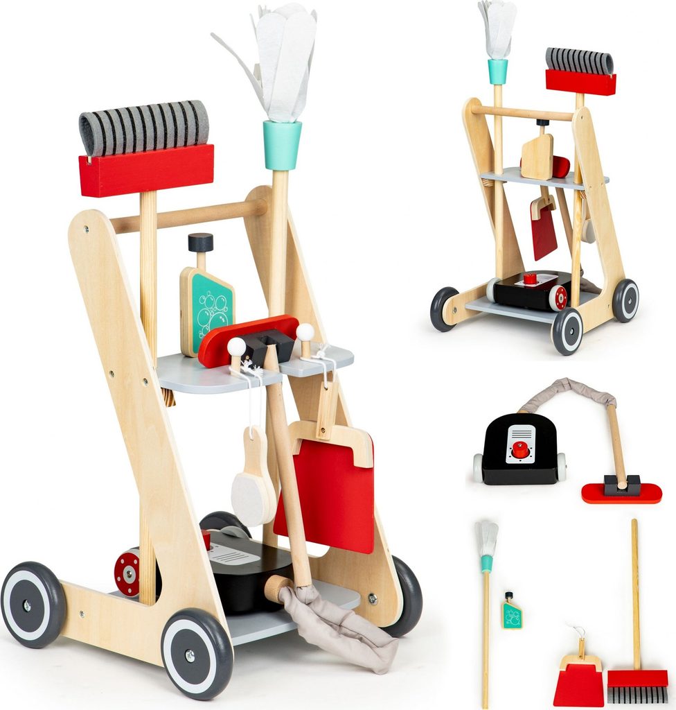 Ecotoys dřevěný úklidový vozíček s příslušenstvím umožní dítěti stát se pravým pánem nebo paní domu. Najde zde vše potřebné pro úklid domácnosti. Vysavač s látkovou hadici, dlouhou metlu, lopatku se smetáčkem a imitaci čistícího prostředku. Ve spodní části a střední jsou umístěny praktické police.  Hračka je vyrobena ze dřeva a je určena pro děti od 36 měsíců věku.