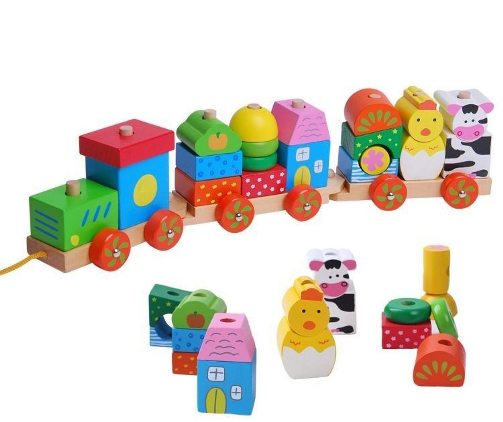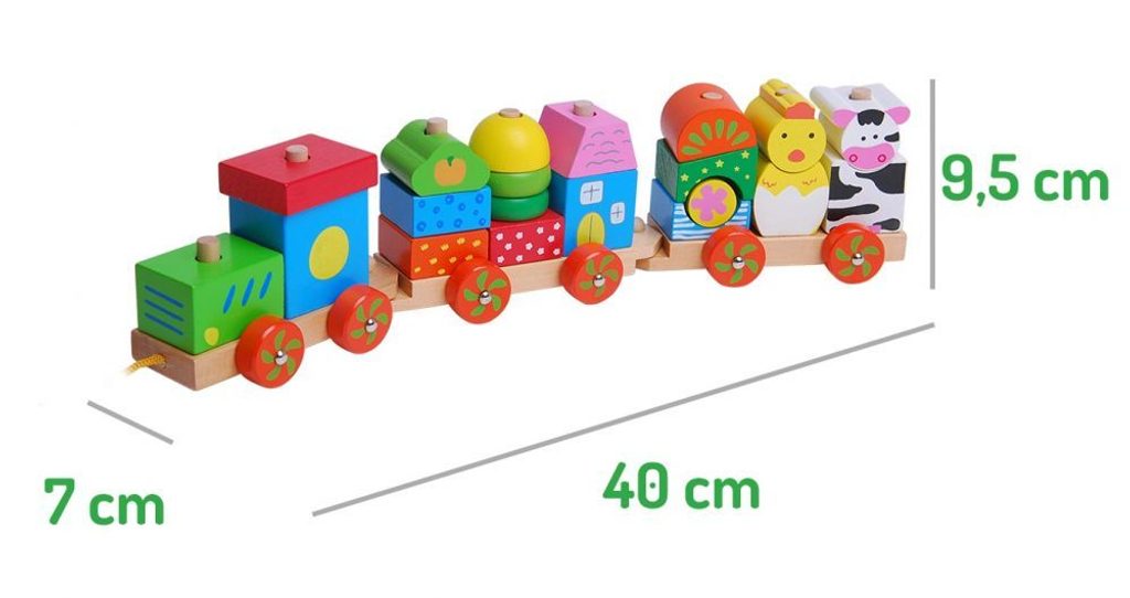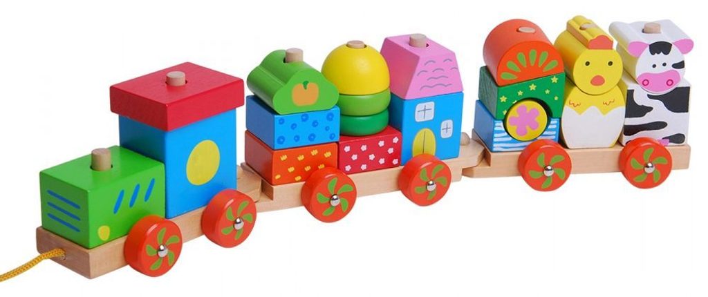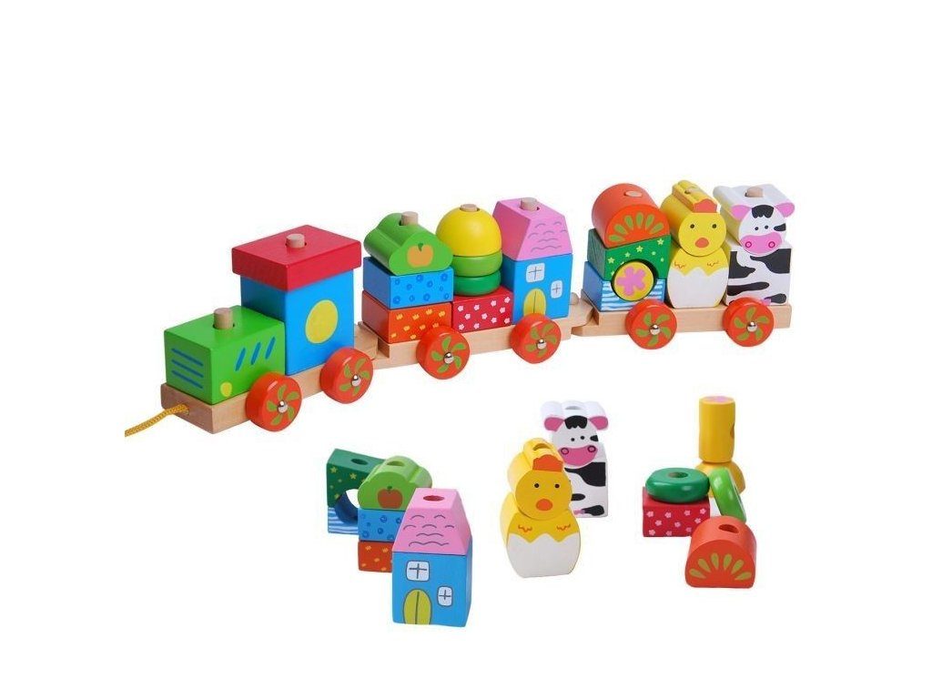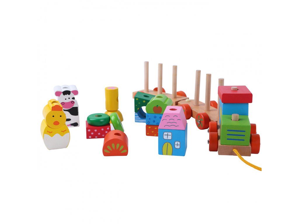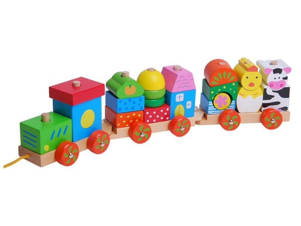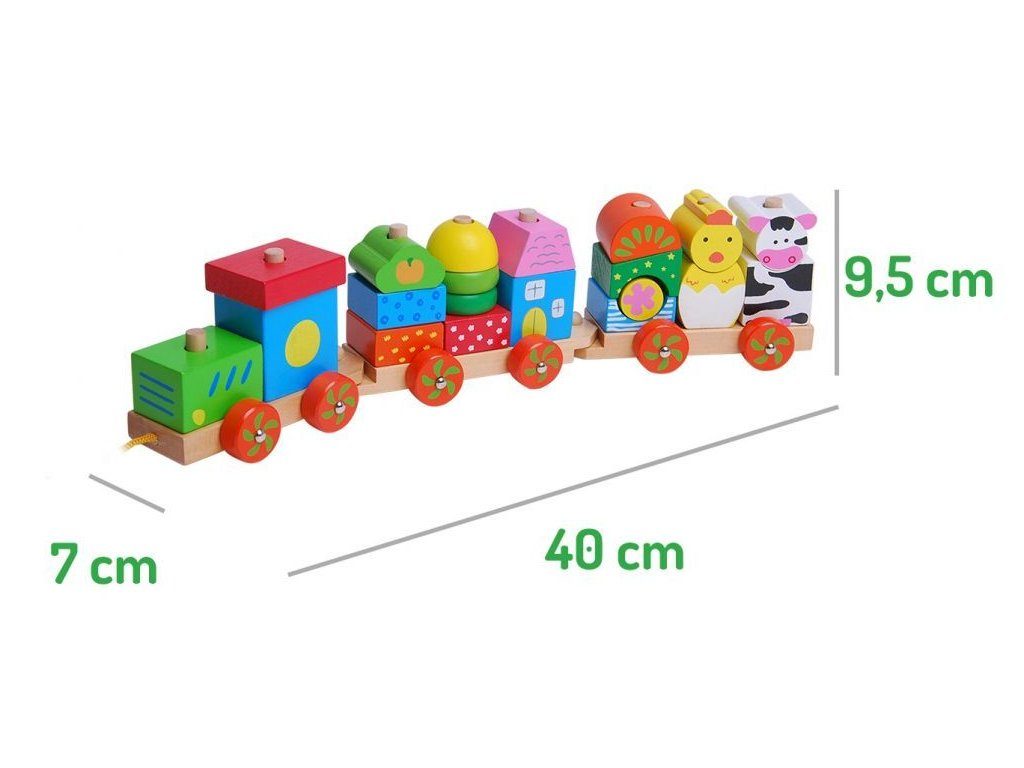 Ecotoys dřevěný vláček se šnůrkou na tažení podporuje u nejmenších dětí představivost a zlepšuje motoriku. Součástí vláčku je 20 barevných kostek v různobarevném provedení. Kostky lze z vláčku sundat a libovolně přeskupovat. Vše je vyrobeno z kvalitního dřeva bez ostrých hran. Hračka je určena pro děti od 18 měsíců věku.