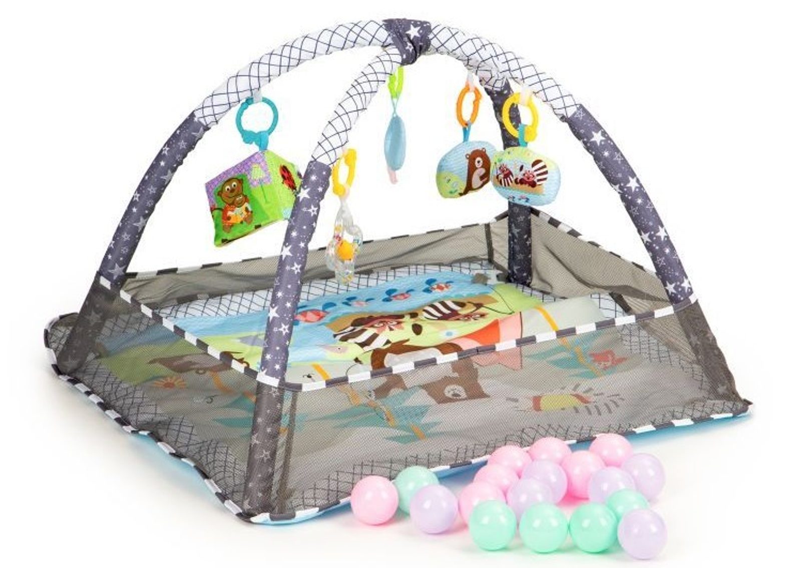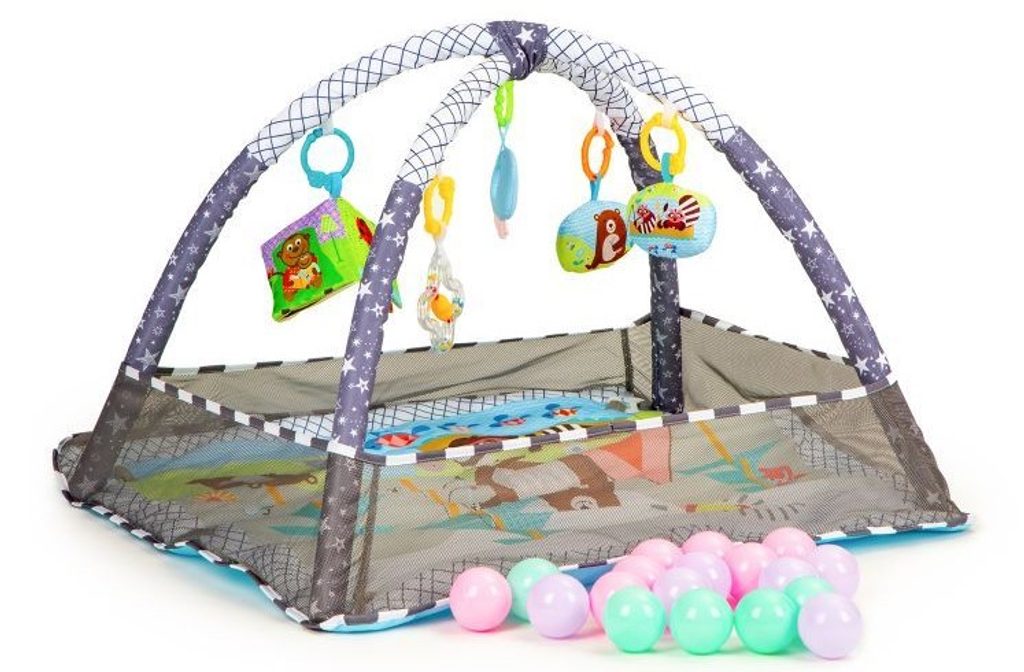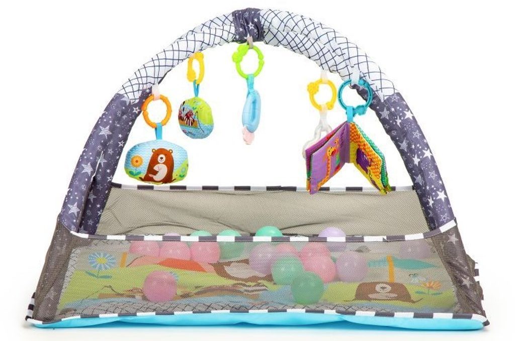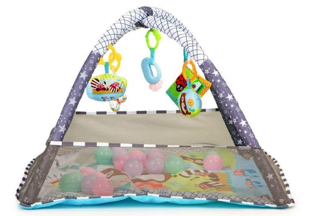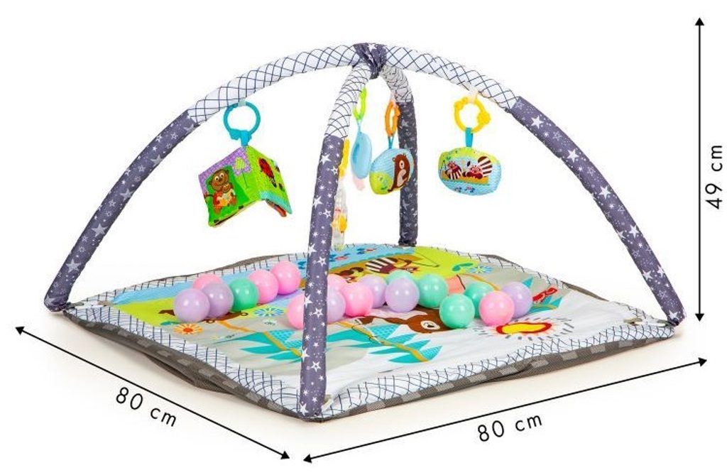 Ecotoys barevná hrací deka 2v1 Play Ball je určena Vašemu dítěti už od narození. Součástí deky jsou dvě hrazdičky s 5 zavěšenými hračkami a 18 barevných míčků. Hračky lze odejmout a dítě si s nimi může hrát samostatně. Na bočních stranách lze vytvořit ohrádku s výškou stěn 15 cm. Deka je vyrobena ze stálobarevného materiálu.