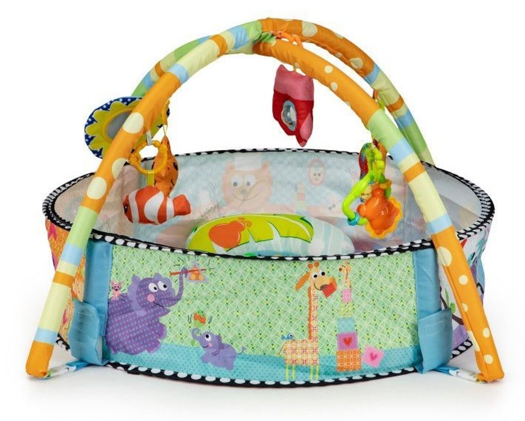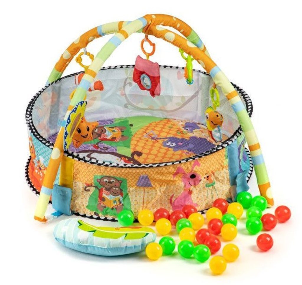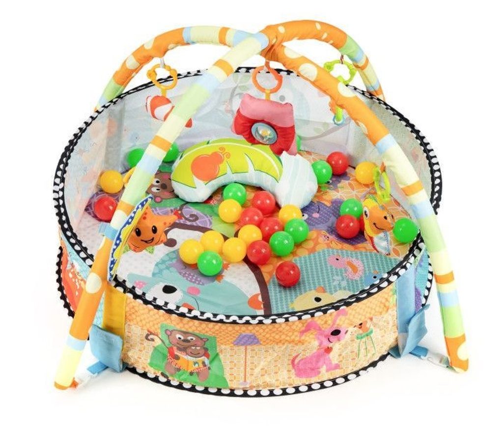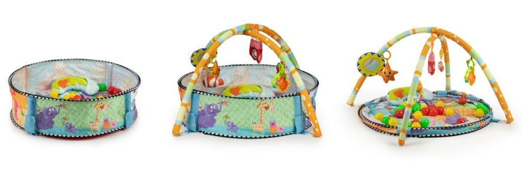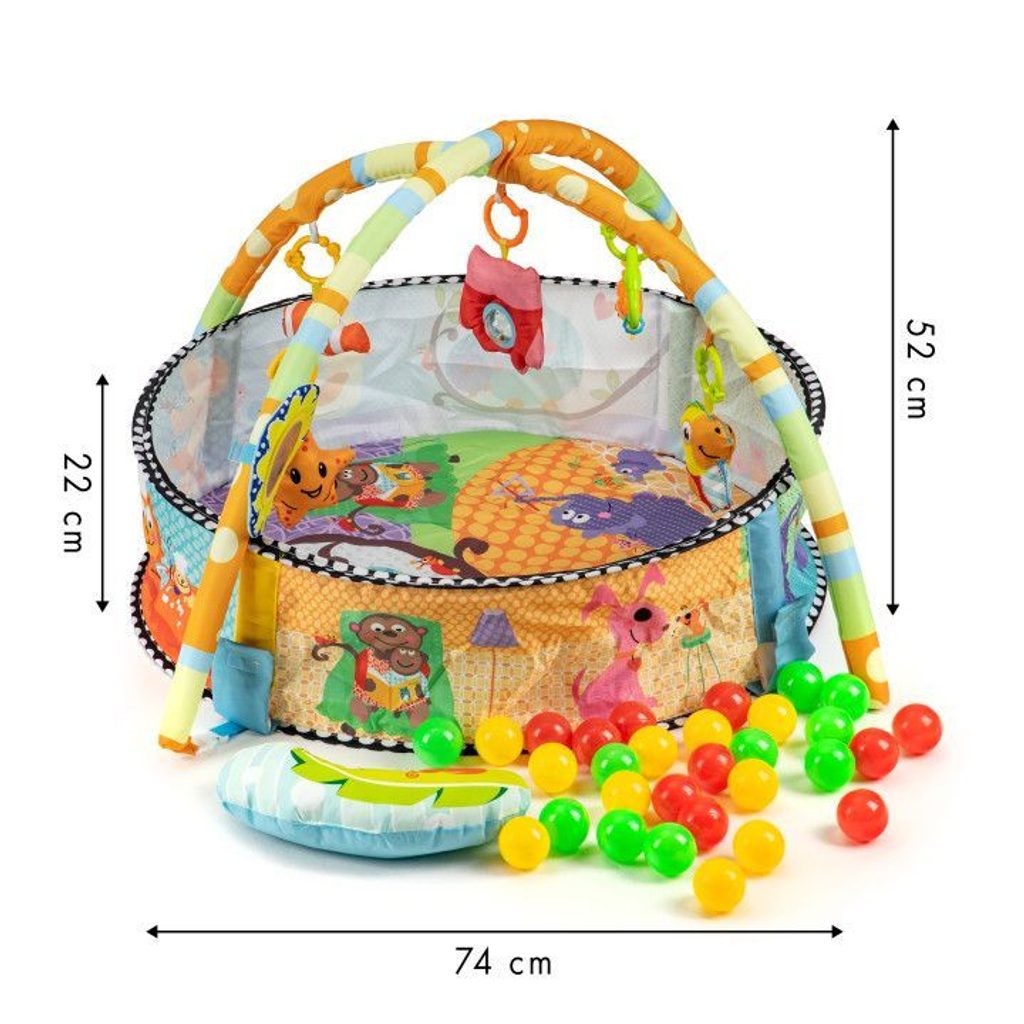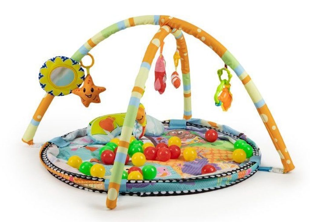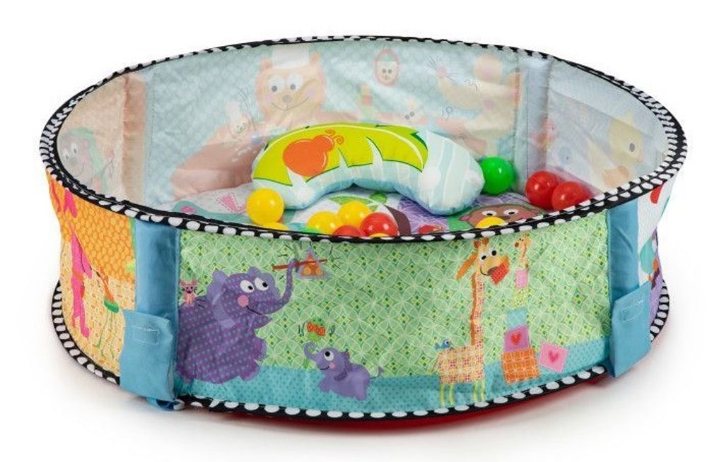 Ecotoys barevná hrací deka Funny Ocean se 30 míčky je určena Vašemu dítěti už od narození. Součástí deky jsou dvě hrazdičky se zavěšenými hračkami z nichž je v provedení bezpečného zrcátka. V první fázi života si dítě hraje na zádech a může pozorovat zavěšené hračky, které vzbuzují jeho zvědavost. Pro dítě, které již zvládne větší pohyby lze boční stěny jednoduše zvednout a vytvořit tak bezpečnou ohrádku pro hraní. Hračky lze odejmout a dítě si s nimi může hrát samostatně. Deka je vyrobena ze stálobarevného materiálu.