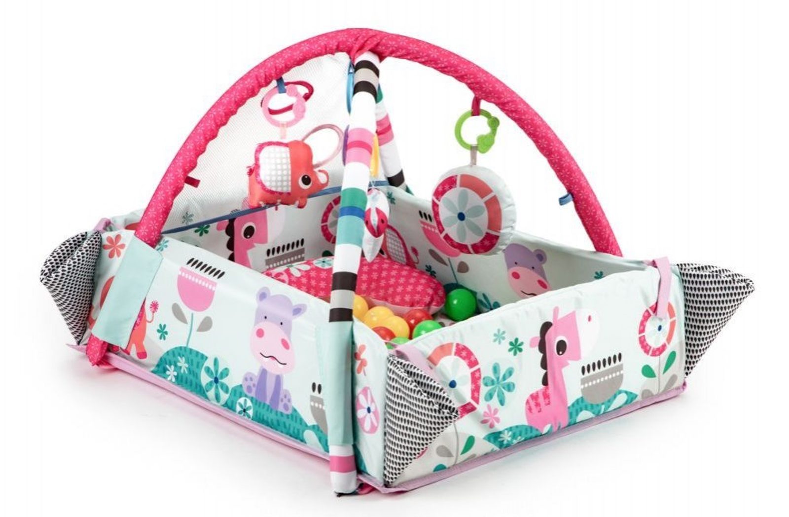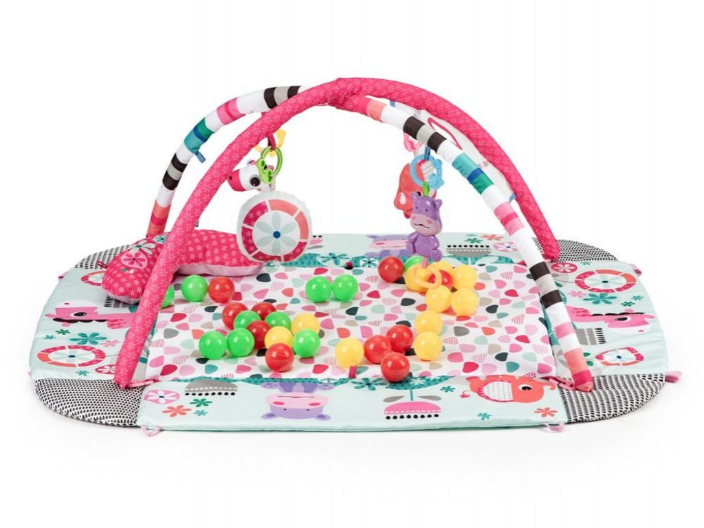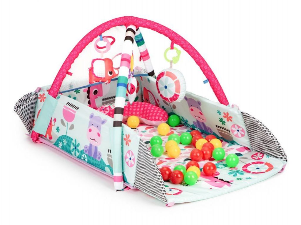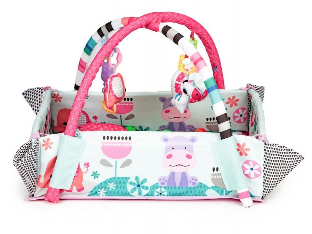 Ecotoys barevná hrací deka Your Way Ball Play se 30 míčky je určena Vašemu dítěti už od narození. Součástí deky jsou dvě hrazdičky se zavěšenými hračkami z nichž jedna ve tvaru tygříka vydává po zmáčknutí veselé melodie. Pomocí bočních stěn deky lze vytvořit ohrádka. Dítě si hrát několika způsoby dle toho jak rychle roste a má chuť si hrát. V první fázi života si dítě hraje na zádech a může pozorovat zavěšené hračky, které vzbuzují jeho zvědavost. Pro dítě, které již zvládne větší pohyby lze boční stěny jednoduše zvednout a vytvořit tak bezpečnou ohrádku pro hraní. Lze využít samostatnou deku, samostatnou ohrádku nebo zkombinovat za pomoci hrazdiček. Mezi nimi je umístěna síťka s otvory pro vhazování míčků. Hračky lze odejmout a dítě si s nimi může hrát samostatně. Deka je vyrobena ze stálobarevného materiálu.