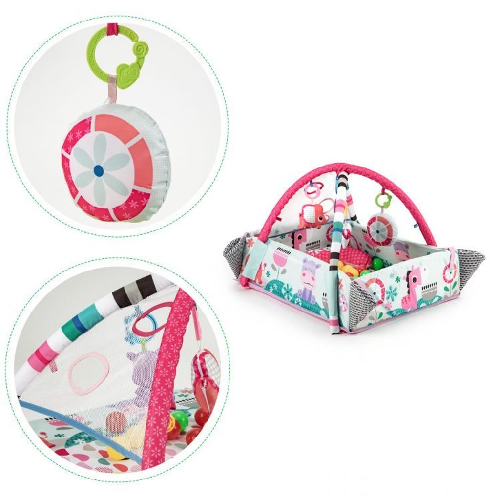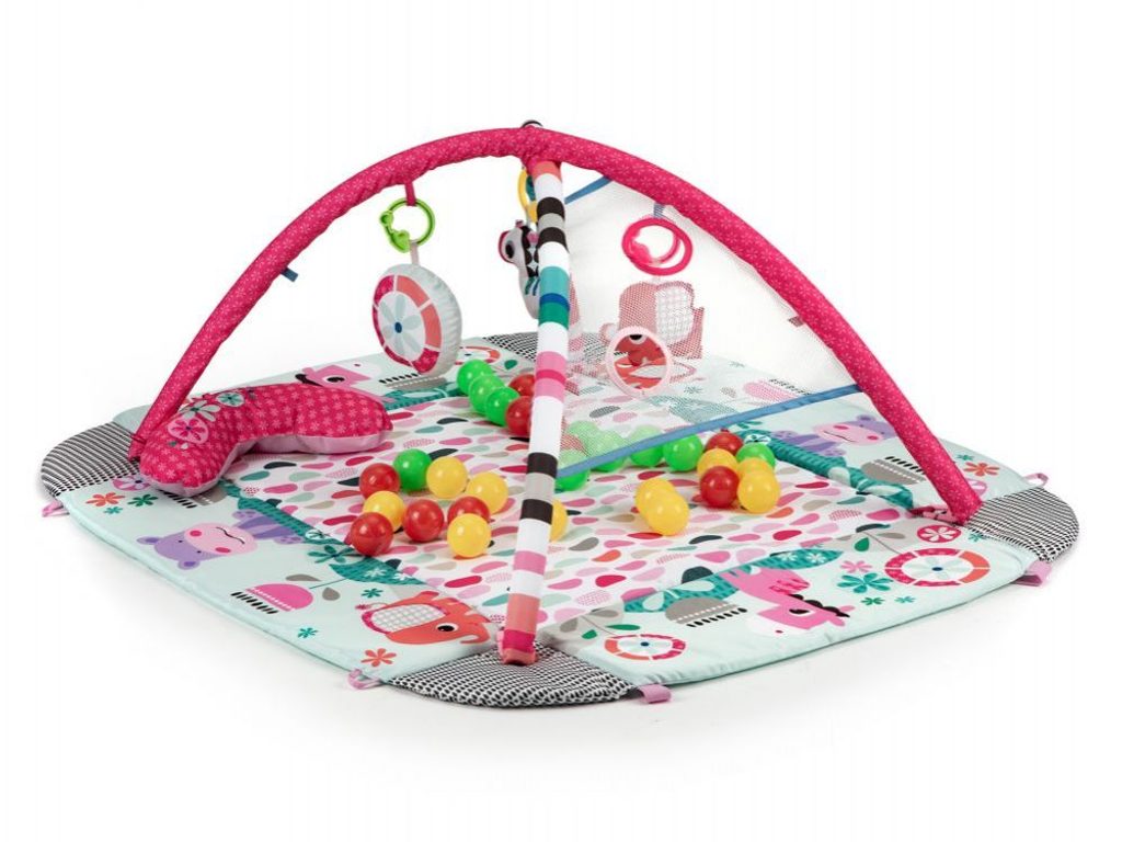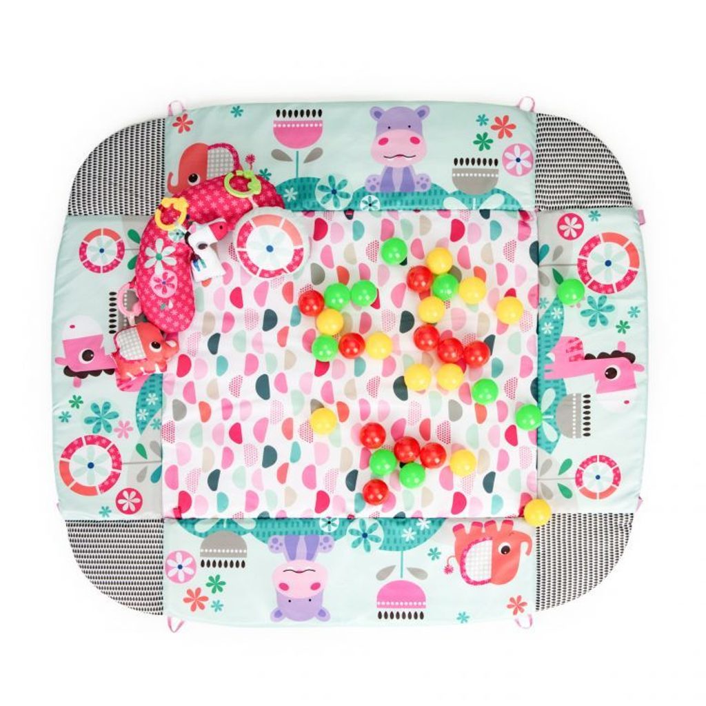 Ecotoys barevná hrací deka Your Way Ball Play se 30 míčky je určena Vašemu dítěti už od narození. Součástí deky jsou dvě hrazdičky se zavěšenými hračkami z nichž jedna ve tvaru tygříka vydává po zmáčknutí veselé melodie. Pomocí bočních stěn deky lze vytvořit ohrádka. Dítě si hrát několika způsoby dle toho jak rychle roste a má chuť si hrát. V první fázi života si dítě hraje na zádech a může pozorovat zavěšené hračky, které vzbuzují jeho zvědavost. Pro dítě, které již zvládne větší pohyby lze boční stěny jednoduše zvednout a vytvořit tak bezpečnou ohrádku pro hraní. Lze využít samostatnou deku, samostatnou ohrádku nebo zkombinovat za pomoci hrazdiček. Mezi nimi je umístěna síťka s otvory pro vhazování míčků. Hračky lze odejmout a dítě si s nimi může hrát samostatně. Deka je vyrobena ze stálobarevného materiálu.