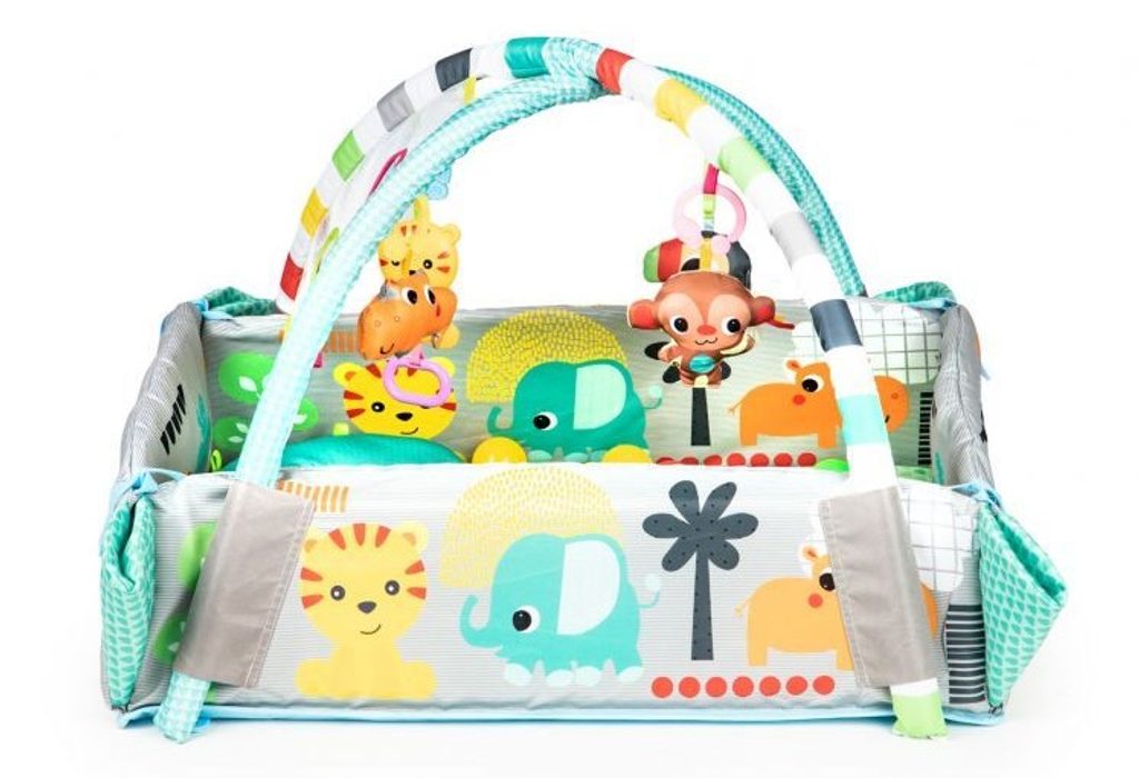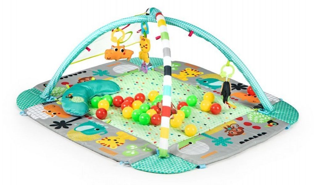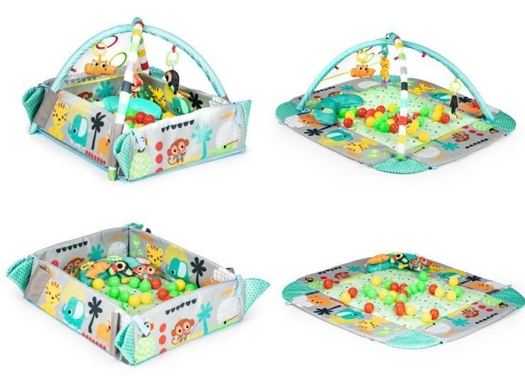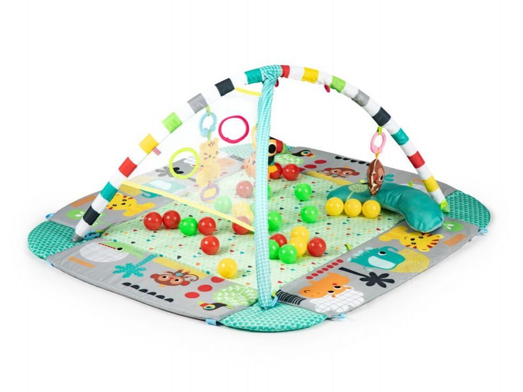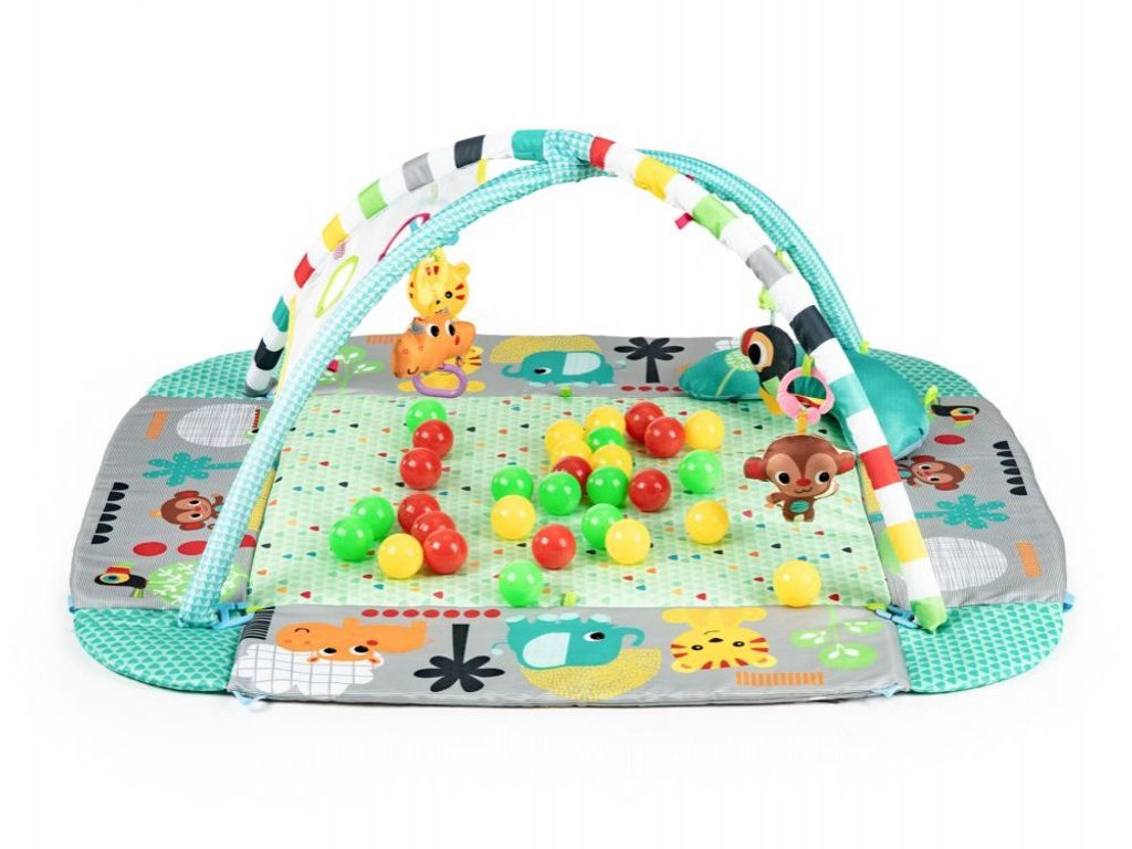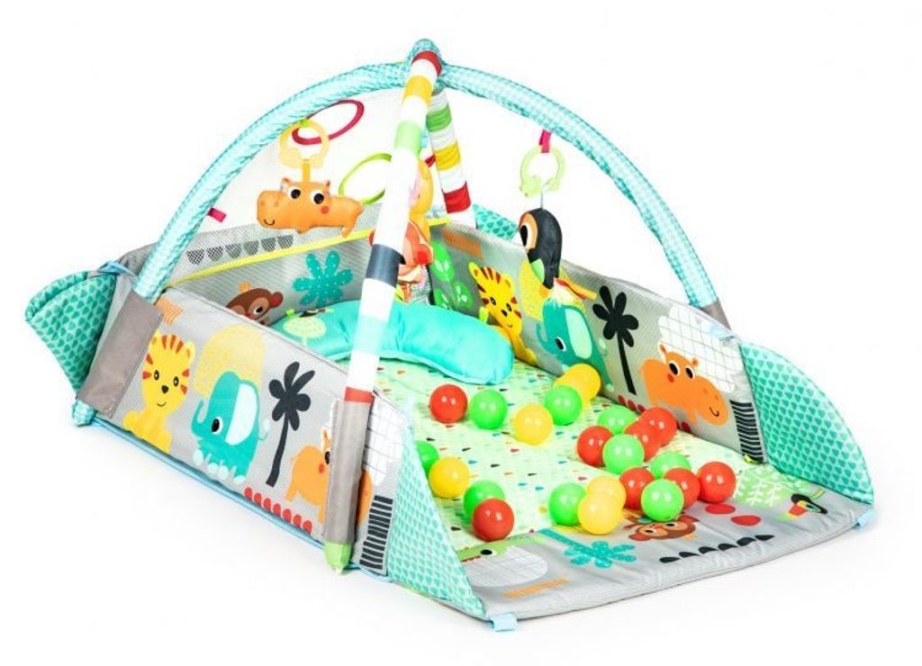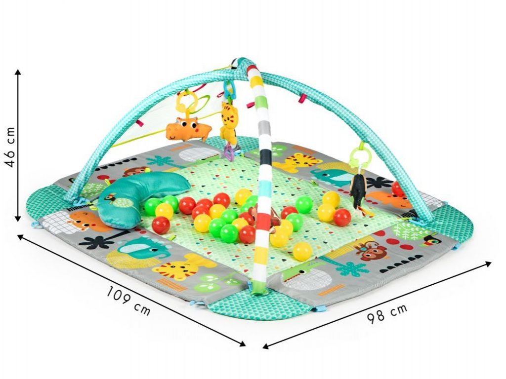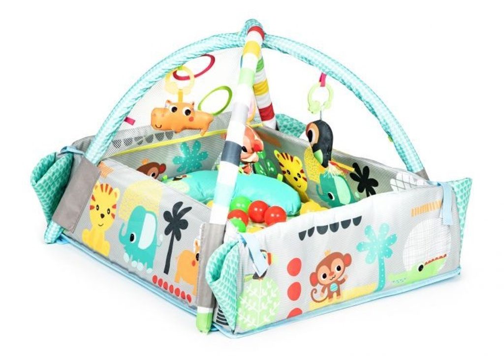Ecotoys barevná hrací deka Your Way Ball Play se 30 míčky je určena Vašemu dítěti už od narození. Součástí deky jsou dvě hrazdičky se zavěšenými hračkami z nichž jedna ve tvaru tygříka vydává po zmáčknutí veselé melodie. Pomocí bočních stěn deky lze vytvořit ohrádka. Dítě si hrát několika způsoby dle toho jak rychle roste a má chuť si hrát. V první fázi života si dítě hraje na zádech a může pozorovat zavěšené hračky, které vzbuzují jeho zvědavost. Pro dítě, které již zvládne větší pohyby lze boční  stěny jednoduše zvednout a vytvořit tak bezpečnou ohrádku pro hraní. Lze využít samostatnou deku, samostatnou ohrádku nebo zkombinovat za pomoci hrazdiček. Mezi nimi je umístěna síťka s otvory pro vhazování míčků. Hračky lze odejmout a dítě si s nimi může hrát samostatně. Deka je vyrobena ze stálobarevného materiálu.