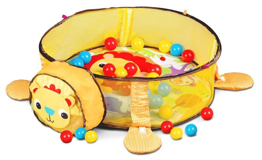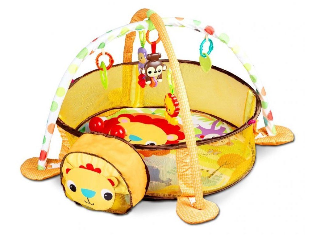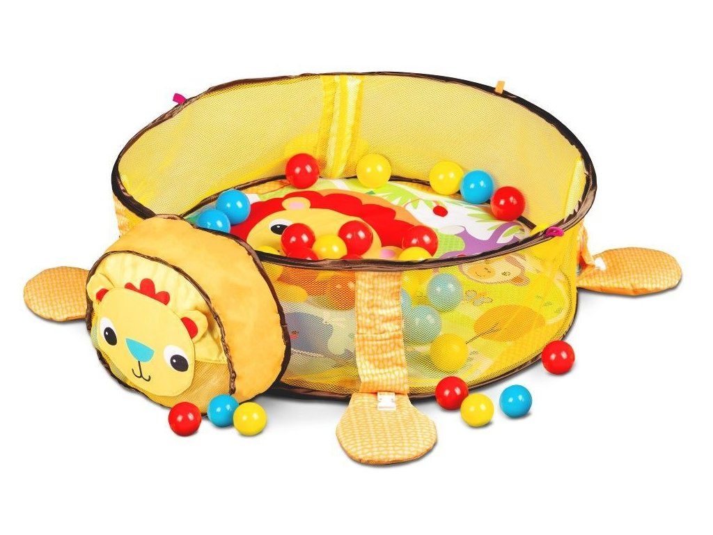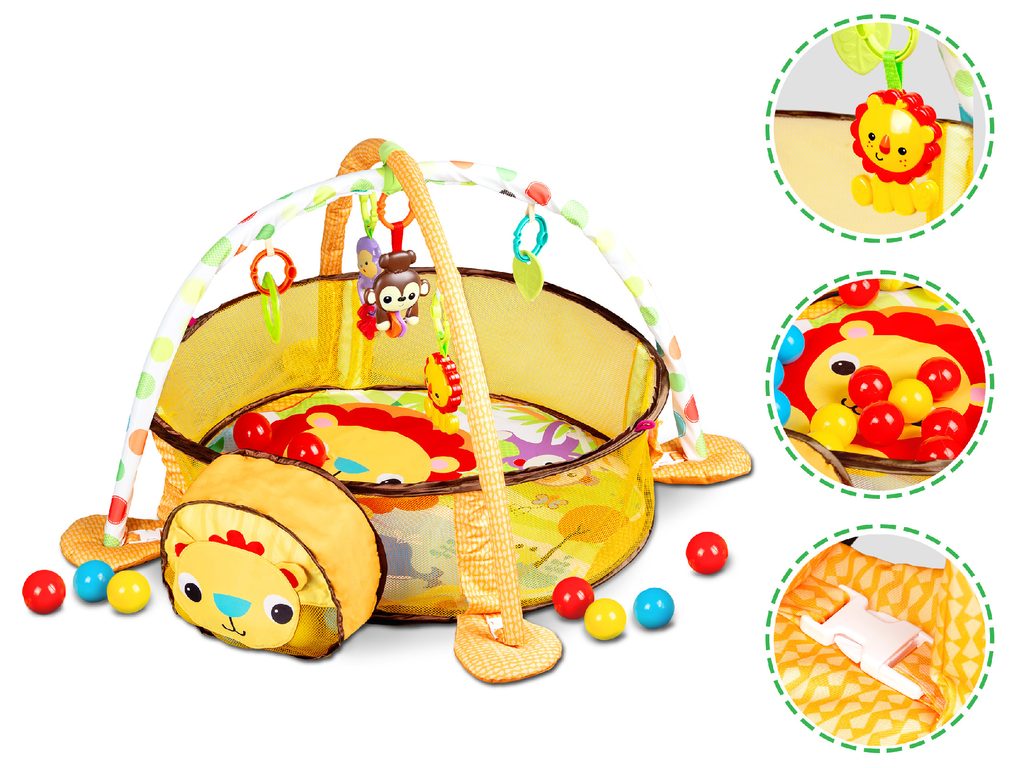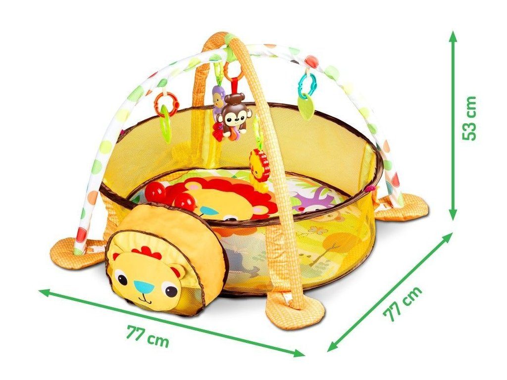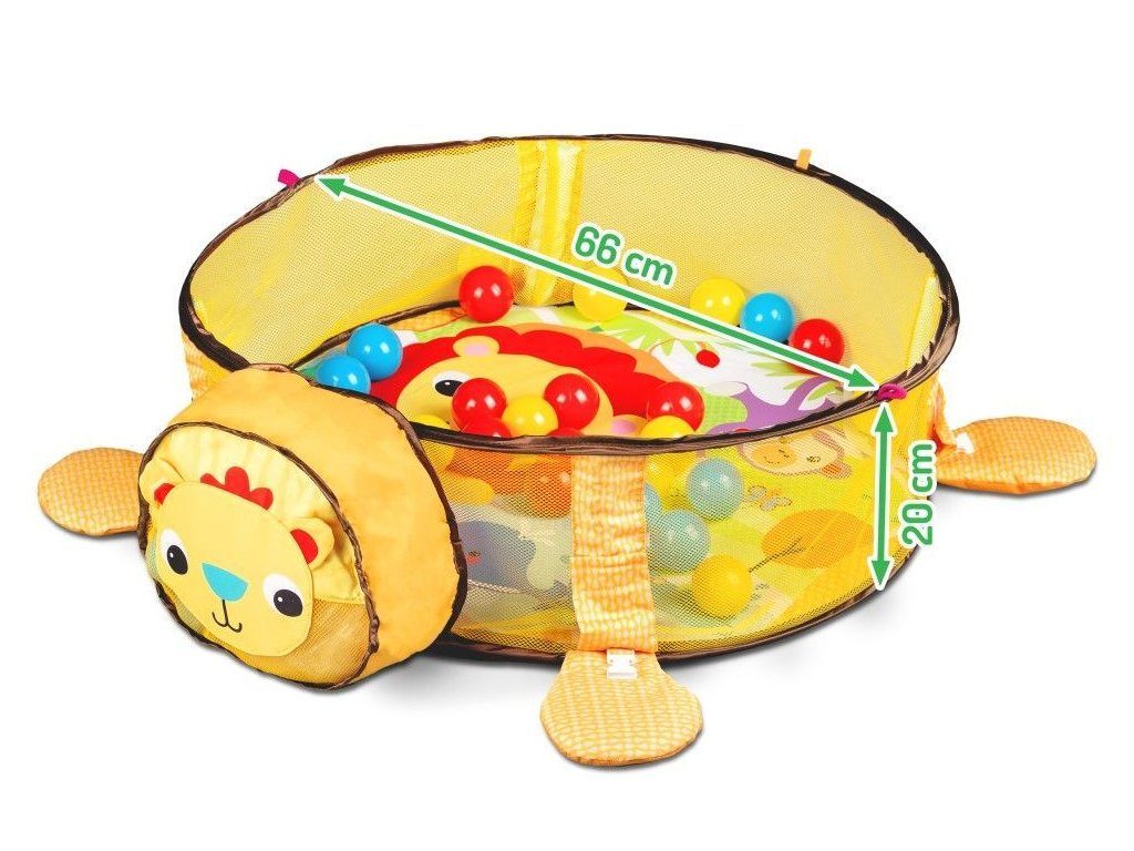Ecotoys barevná hrací deka se 30 míčky Lvíček je určena Vašemu dítěti už od narození. Součástí deky jsou dvě hrazdičky se zavěšenými hračkami v podobě kraba, rybky, chobotničky a hvězdice. Hlavička lvíčka v přední části deky slouží pro úschovu hracích míčků. V první fázi života si dítě hraje na zádech a může pozorovat zavěšené hračky, které vzbuzují jeho zvědavost. Pro dítě, které již zvládne větší pohyby lze boční ze síťky stěny jednoduše zvednut a vytvořit tak bezpečnou ohrádku pro hraní. Hračky lze odejmout a dítě si s nimi může hrát samostatně. Deka je vyrobena ze stálobarevného materiálu.