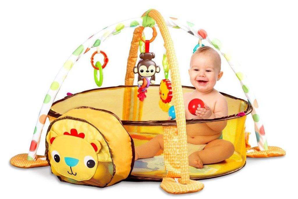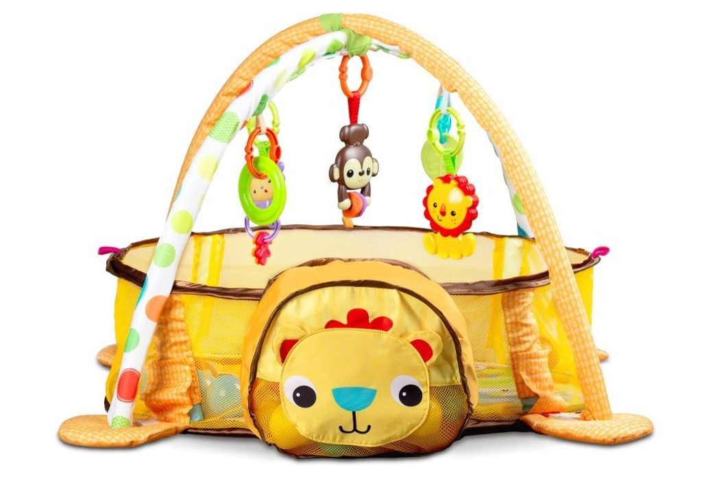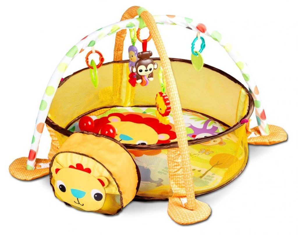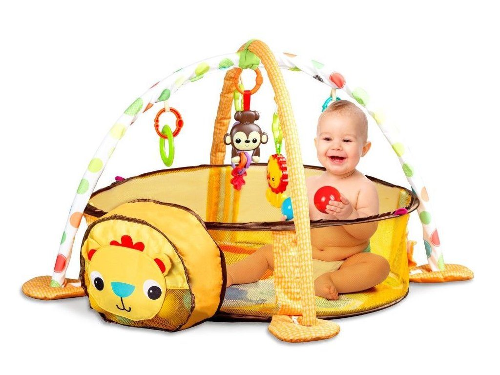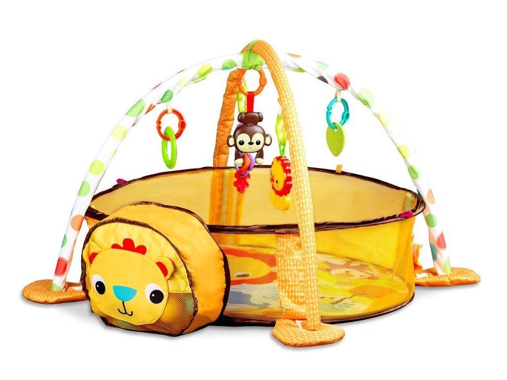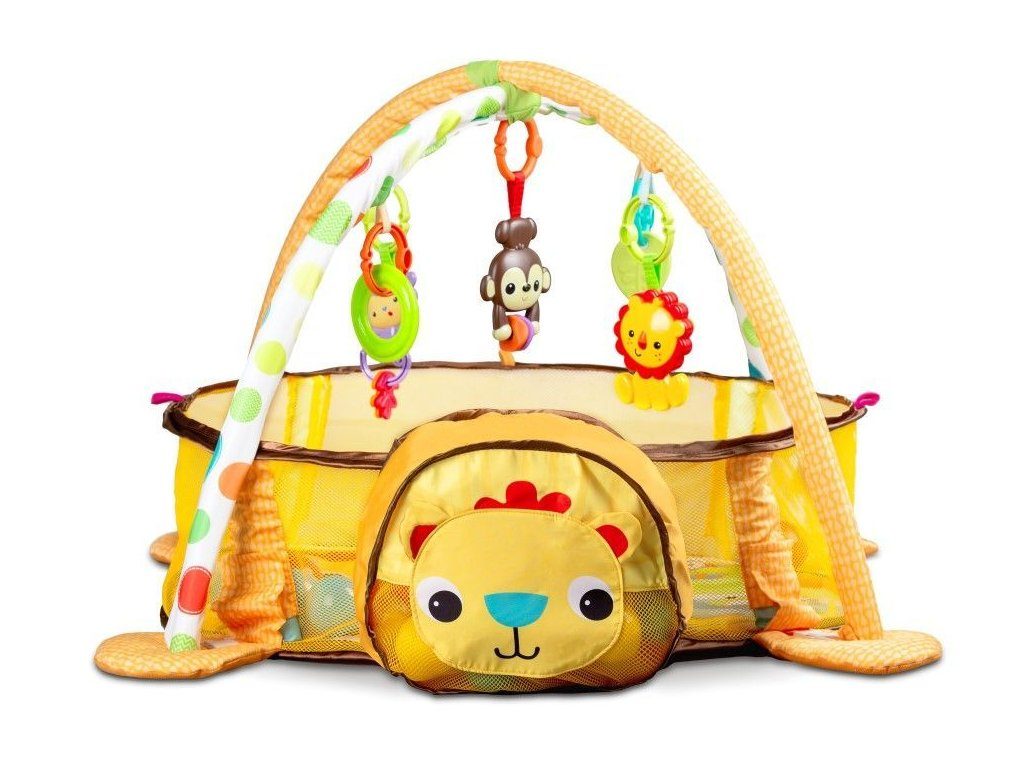 Ecotoys barevná hrací deka se 30 míčky Lvíček je určena Vašemu dítěti už od narození. Součástí deky jsou dvě hrazdičky se zavěšenými hračkami v podobě kraba, rybky, chobotničky a hvězdice. Hlavička lvíčka v přední části deky slouží pro úschovu hracích míčků. V první fázi života si dítě hraje na zádech a může pozorovat zavěšené hračky, které vzbuzují jeho zvědavost. Pro dítě, které již zvládne větší pohyby lze boční ze síťky stěny jednoduše zvednut a vytvořit tak bezpečnou ohrádku pro hraní. Hračky lze odejmout a dítě si s nimi může hrát samostatně. Deka je vyrobena ze stálobarevného materiálu.