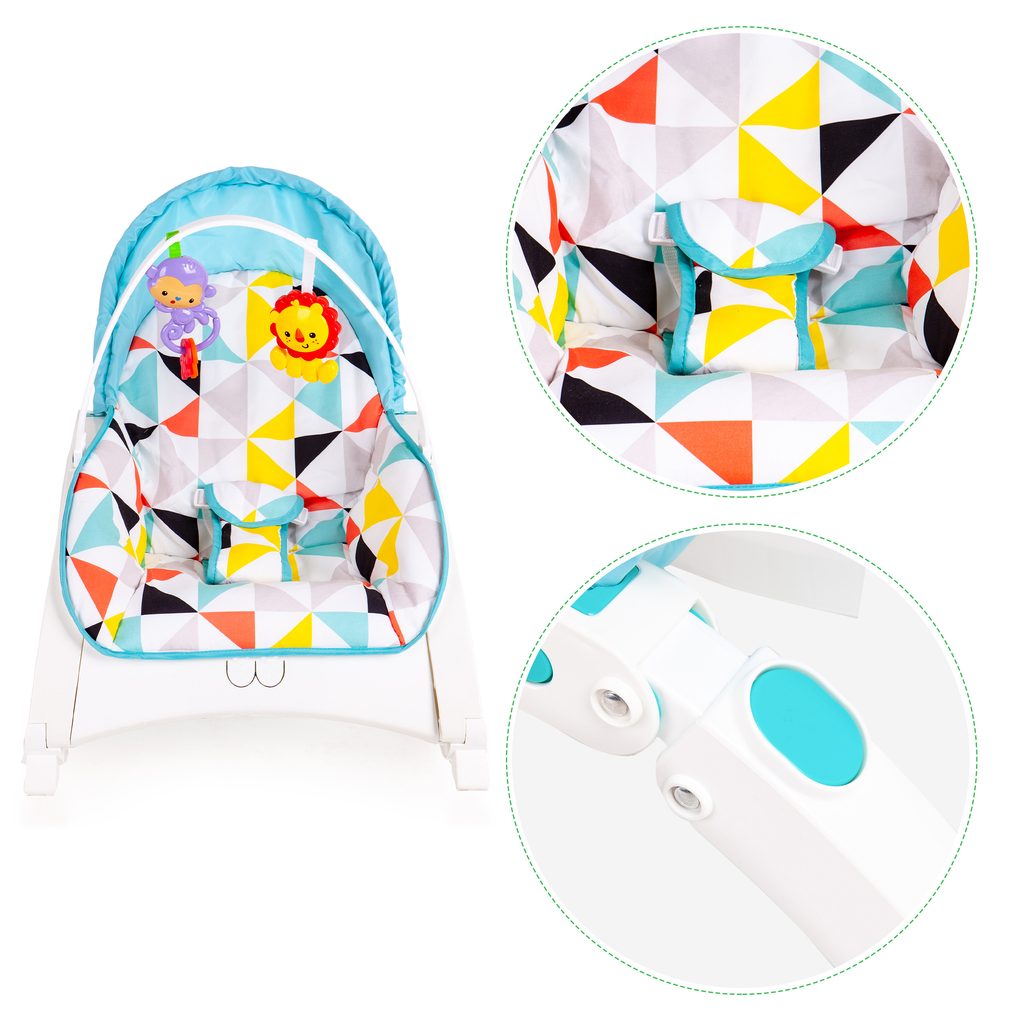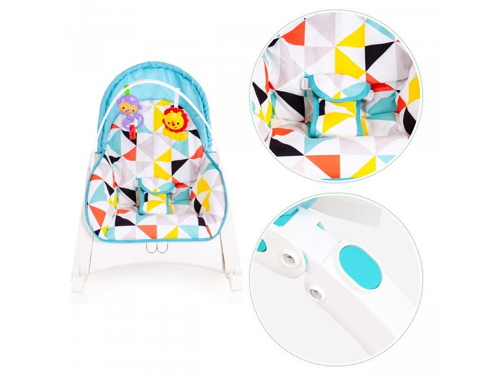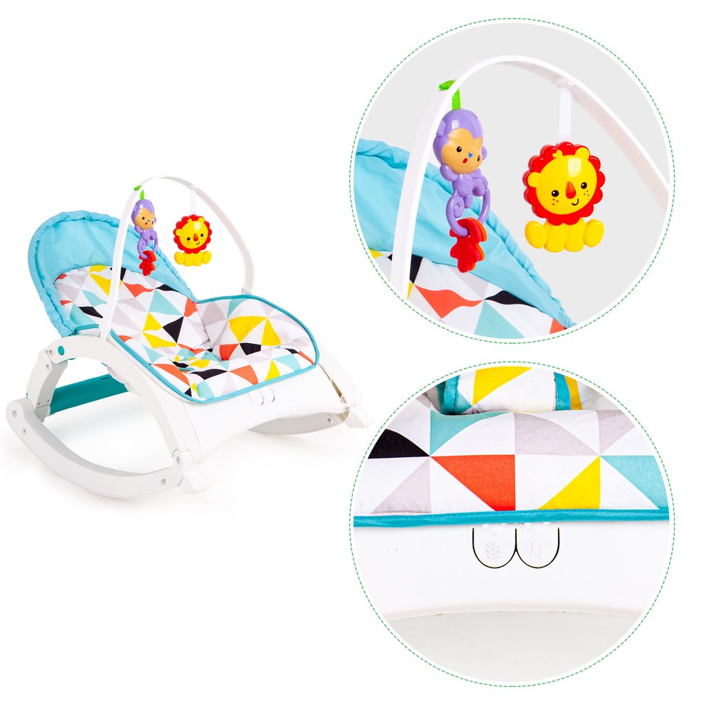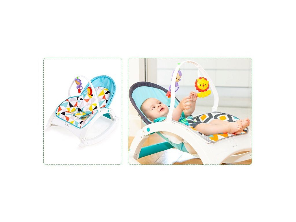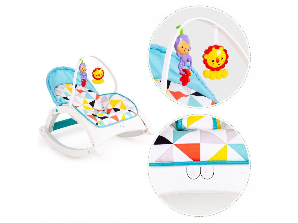 Ecotoys Animal 9 kojenecké lehátko 3v1. Dítě v něm může bezpečně odpočívat, spát a hrát si od prvních měsíců života. Potah je z měkkého a na dotek příjemného materiálu který lze prát v pračce. Díky elektronickému modulu lehátko vibruje a zklidňuje Vaše dítě. Nastavitelné tříbodové bezpečnostní pásy zaručují pohodlí a udržují dítě ve správné poloze. Pohon je velmi tichý proto nebude dítě vyrušovat ve spánku. Hrazdička se 2 zavěšenými hračkami a modul, který vydává různé melodie. Opěradlo lze velmi jednoduchým způsobem polohovat což oceníte zejména při potřebě lehátka.