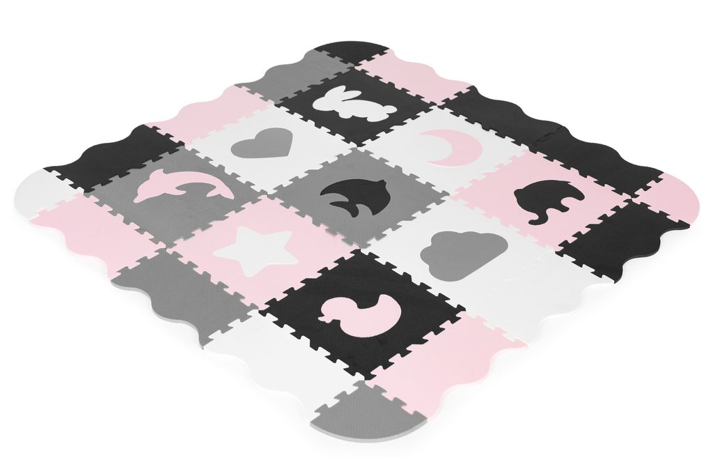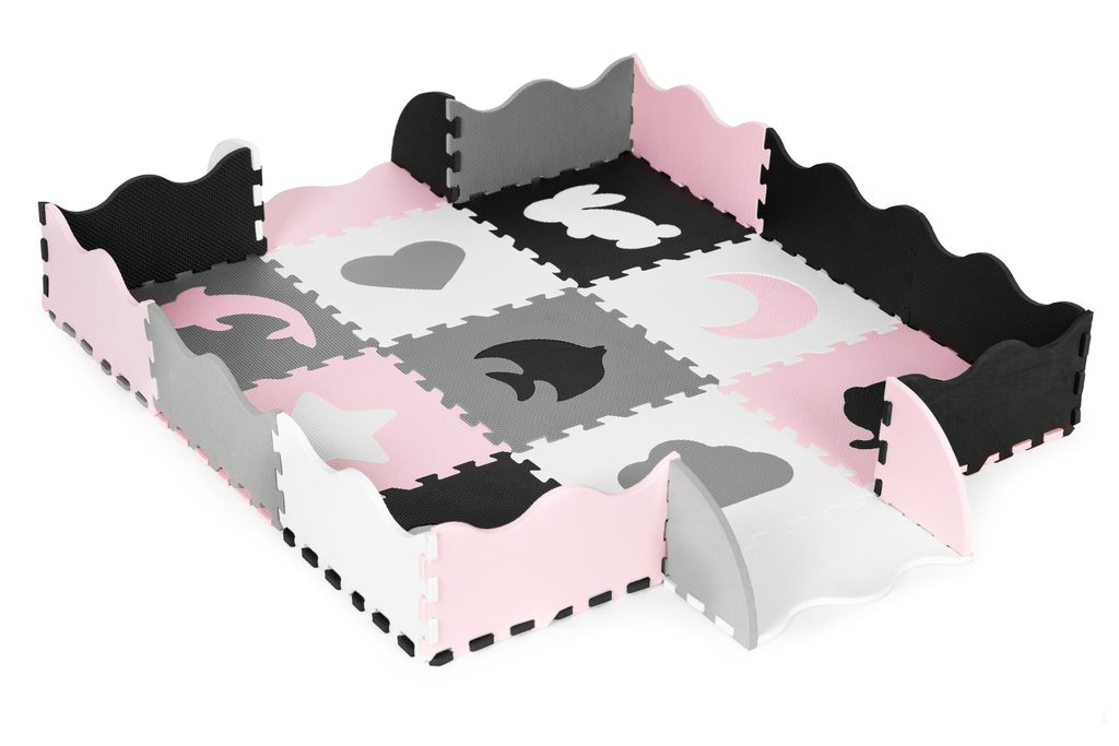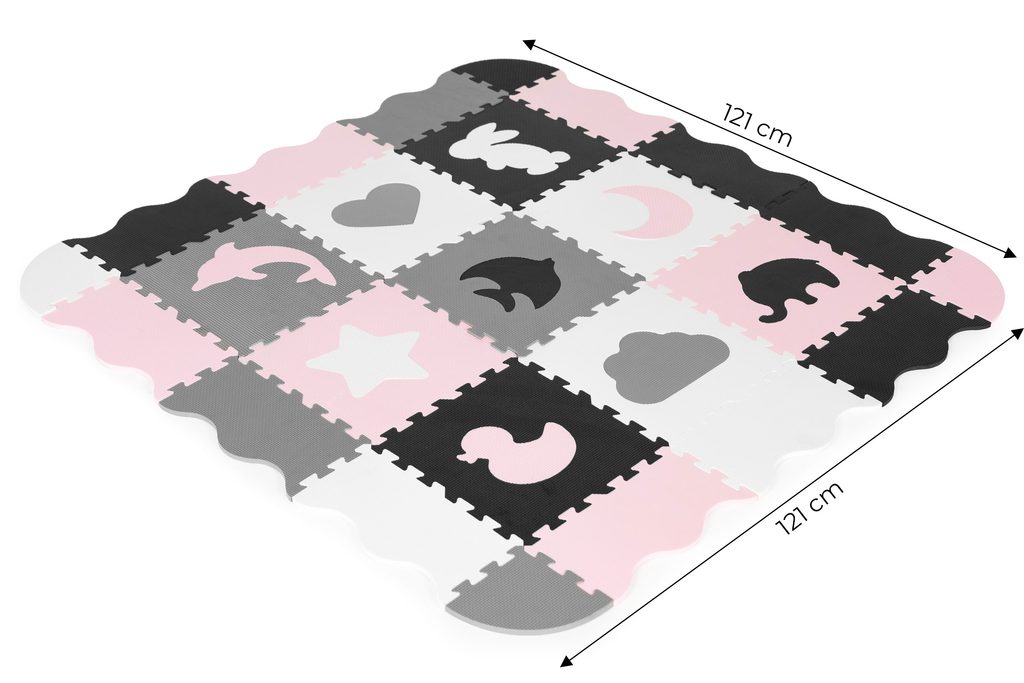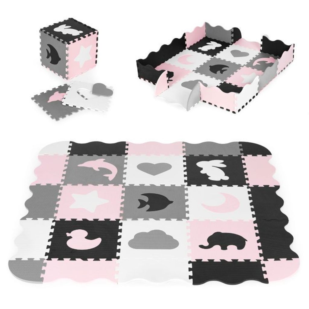 Ecotoys vzdělávací deka ve stylu puzzle Pink Puzzle se skládá z celkem 25 velkých barevných dílků z příjemné na dotek pěny. Uvnitř hlavních čtverců jsou vyobrazeny obrázky zvířátek a nebeských motivů. Všechny kostky jdou mezi sebou libovolně propojovat. Deka slouží k prvotnímu vzdělávání dítěte, dále jako cvičební podložka nebo místo pro hru. Vzhledem k tomu, že materiál deky nesaje vodu lze ji velmi snadno čistit například vlhkým hadříkem. Pomocí okrajových dílků lze vytvořit ohrádku.