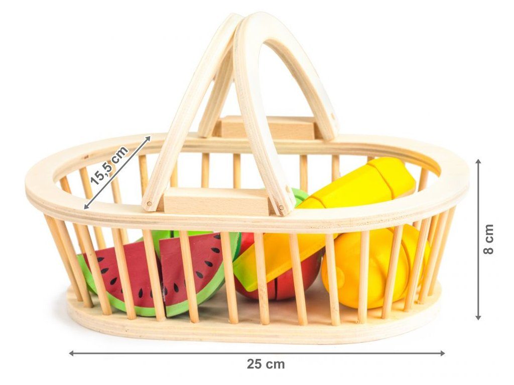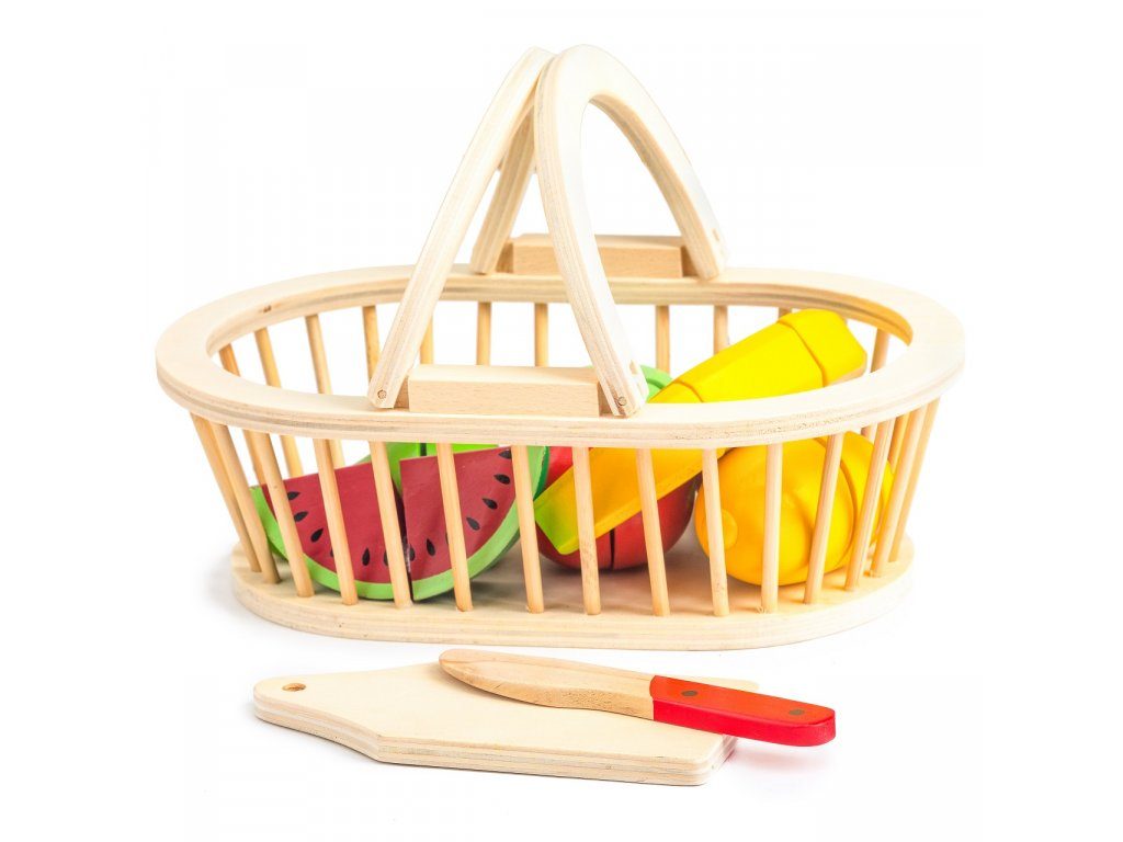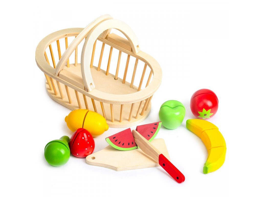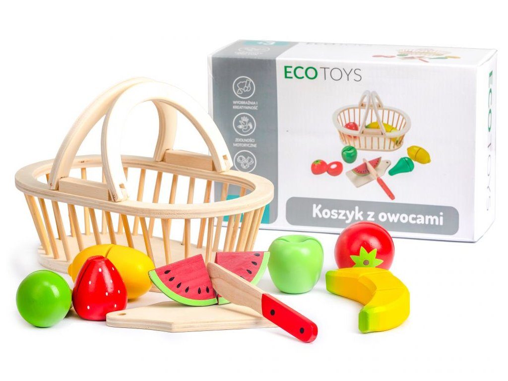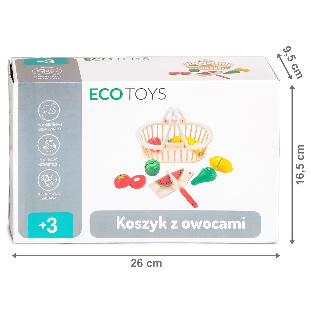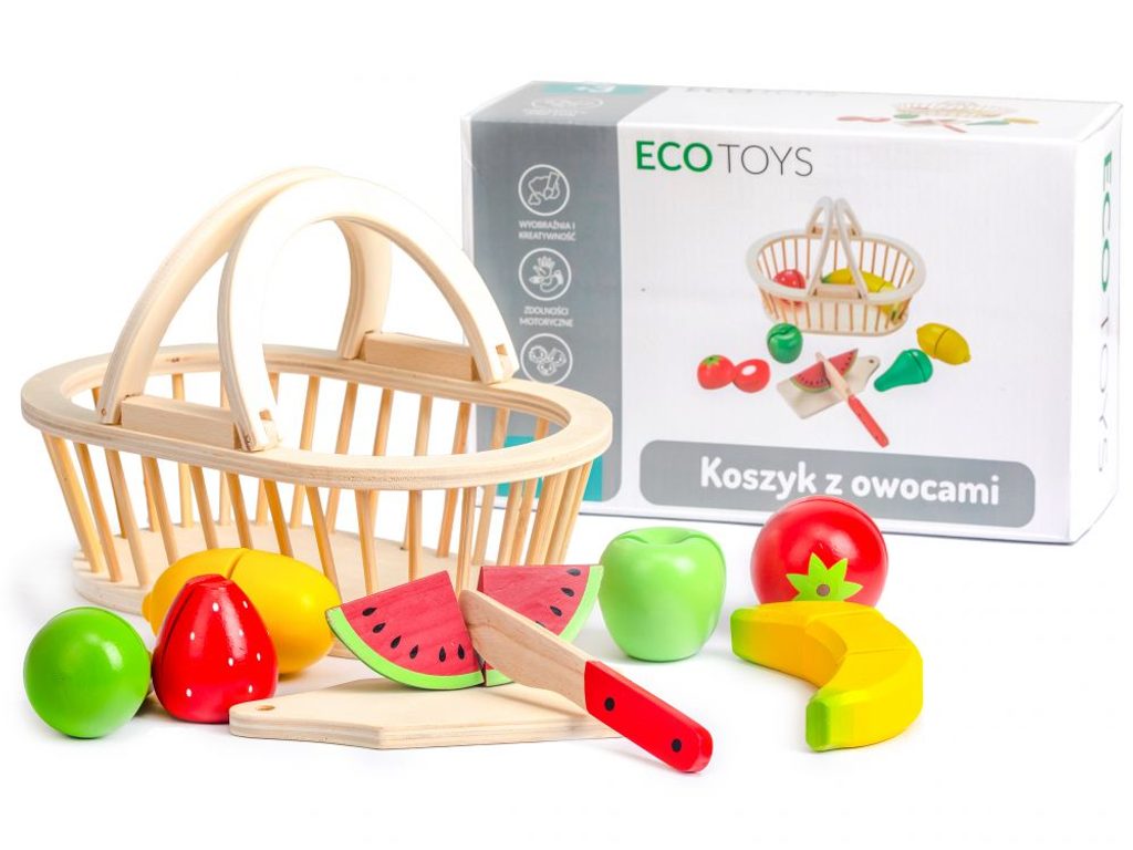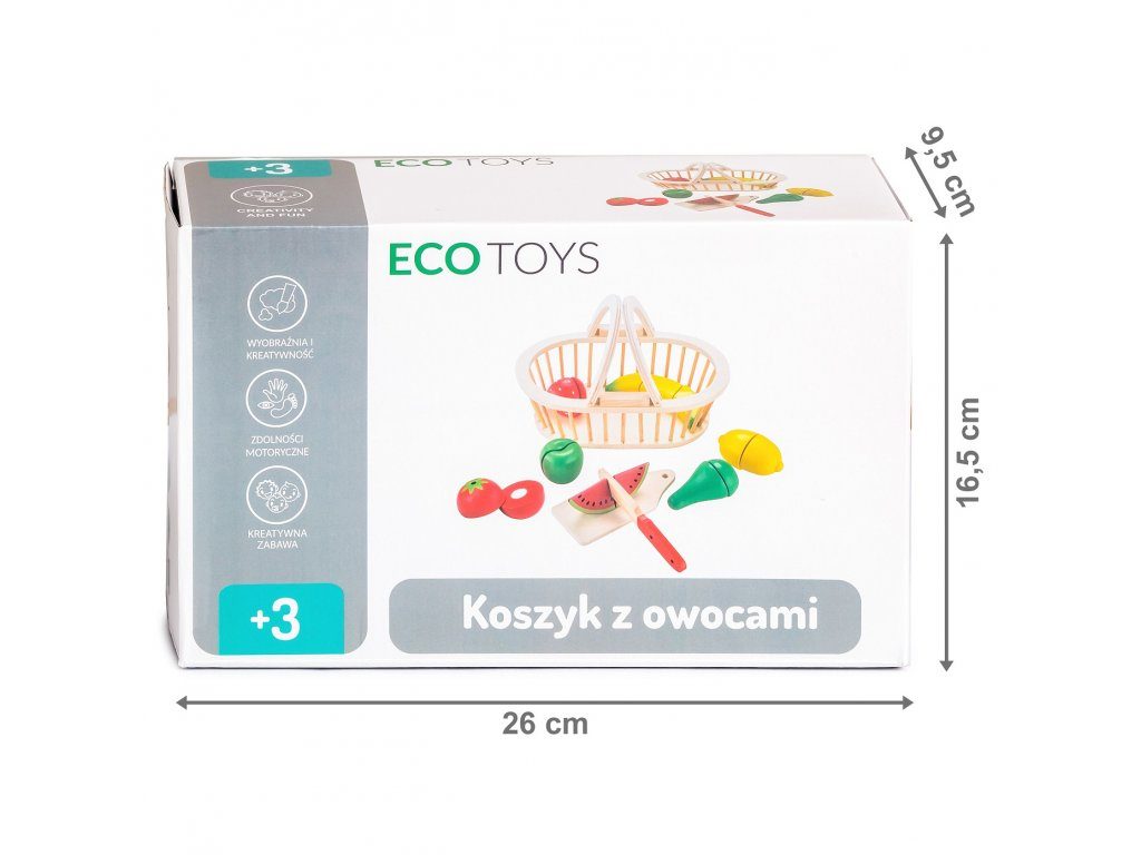 Sada dřevěného ovoce Ecotoys se hodí do každé dětské kuchyňky nebo si s ní může dítě hrát samostatně. Ovoce je vyrobeno z kvalitního dřeva a je pokryto zdravotně nezávadnou barvou. Každé z nich lze rozpůlit a zase zpět spojit pomocí suchého zipu. Krájet lze pomocí přiloženého dřevěného prkénka bezpečného dřevěného nožíku. Sada obsahuje nejznámější druhy ovoce, dítě se je tak snadno naučí rozpoznávat. Vše je uloženo v praktickém dřevěném košíčku. Tato hračka je určena pro děti od 3 let věku.