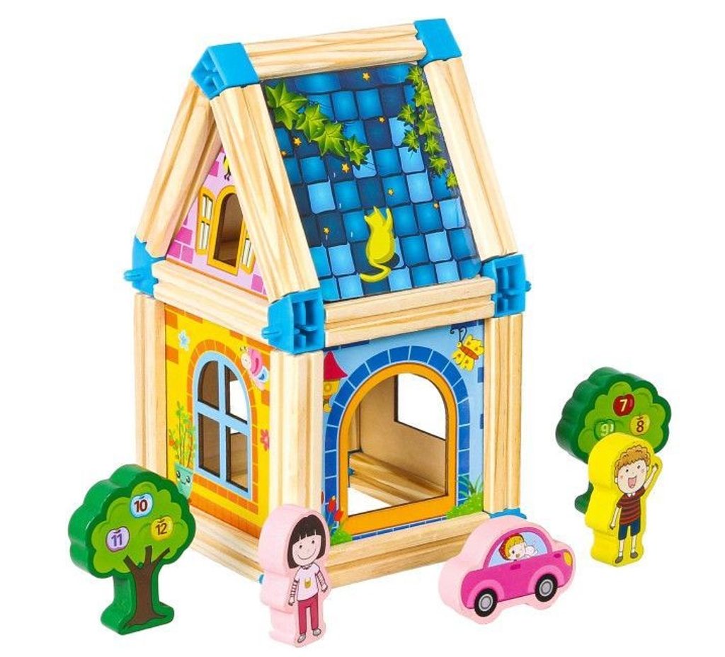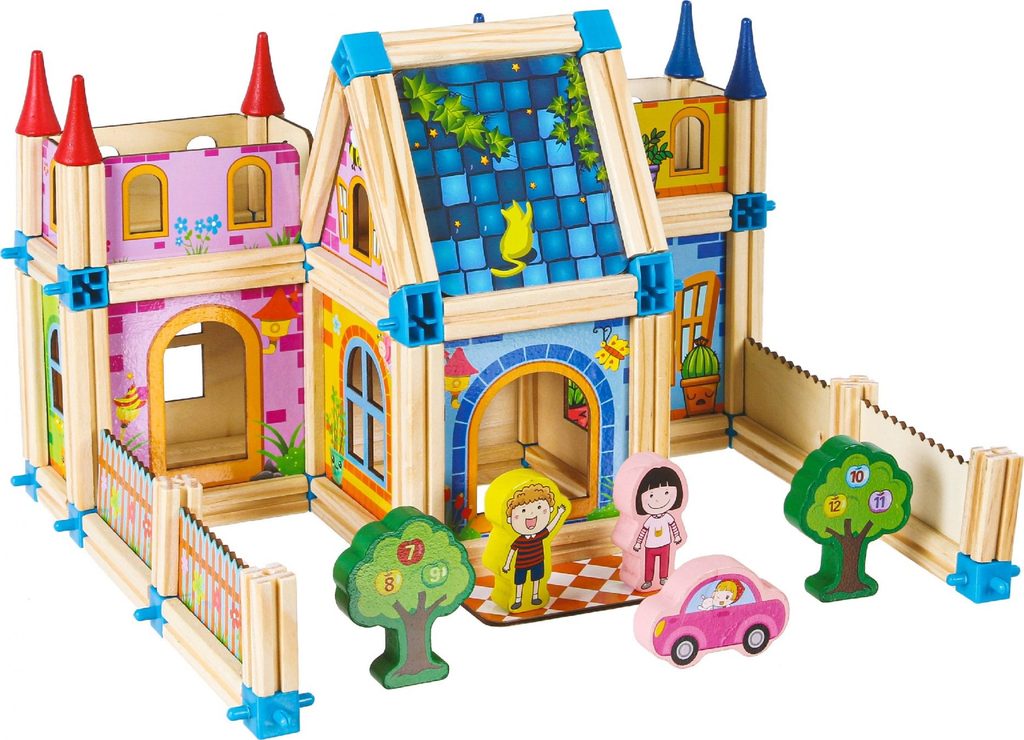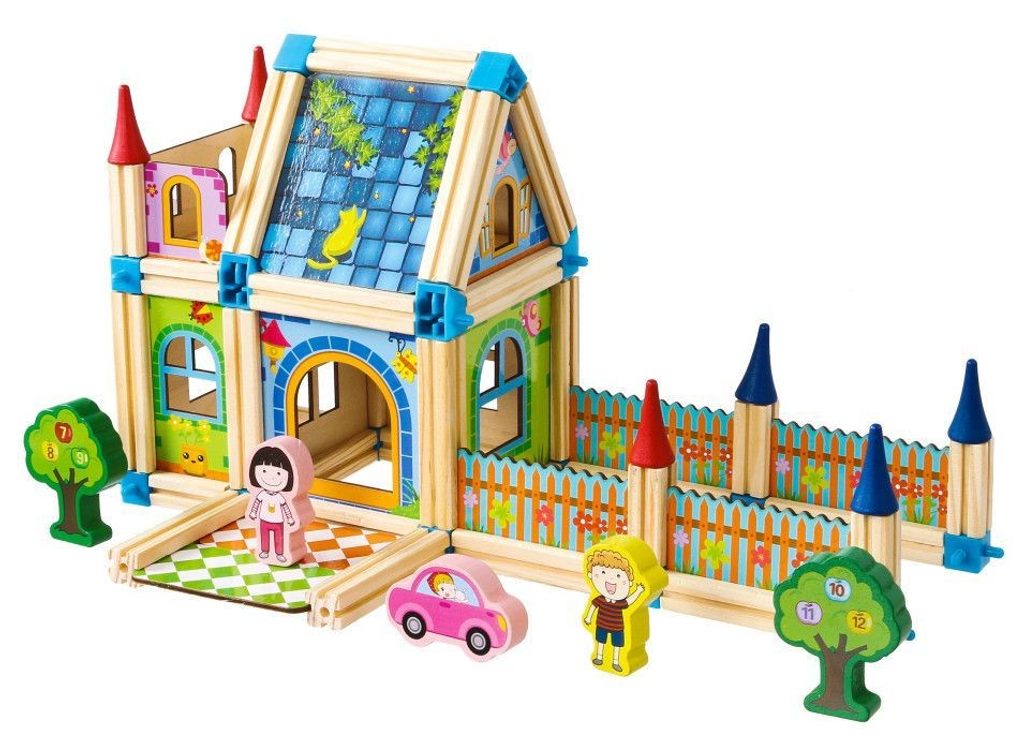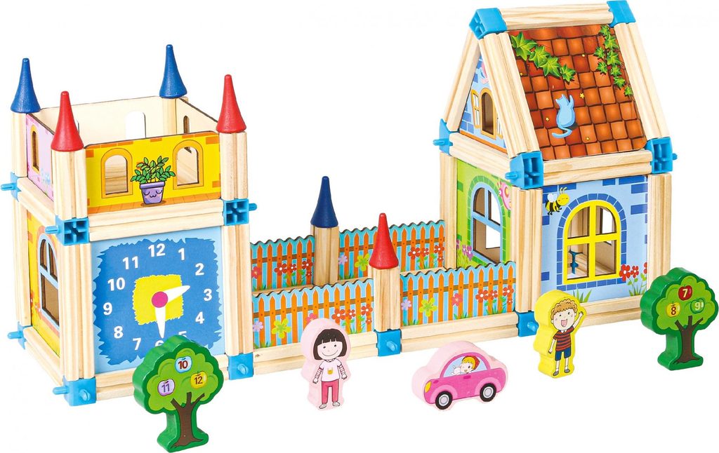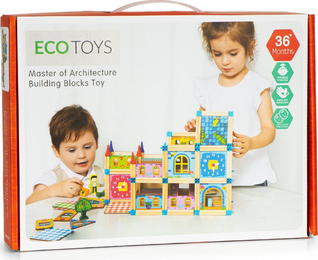 Ecotoys sada 128 ks barevných dřevěných kostek Domeček. Všechny kostky mají zaoblené hrany a jsou vyrobeny ze dřeva bez ostrých hran. Hra s nimi podporuje u dětí představivost a motoriku. Z kostek může dítě vytvořit nádherný domeček s postavičkami, stromy a autíčky. Hračka je určena pro děti od 36 měsíců věku.