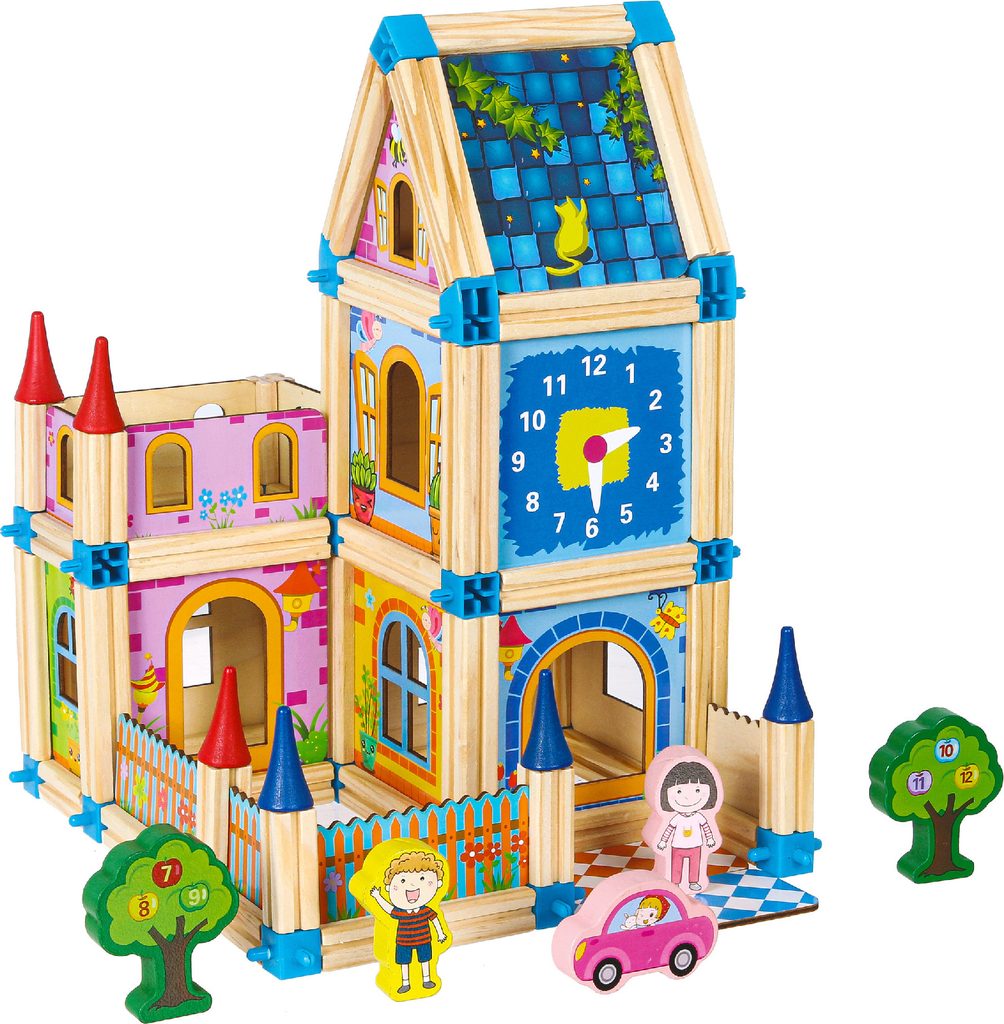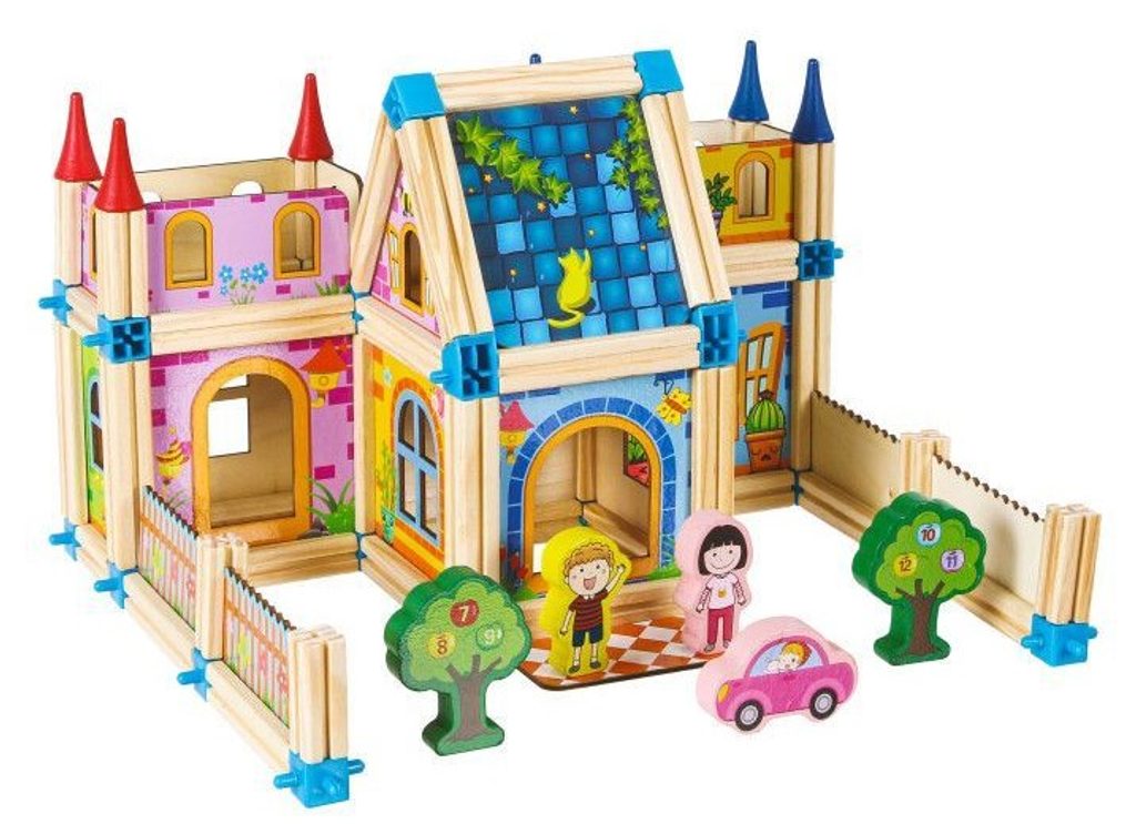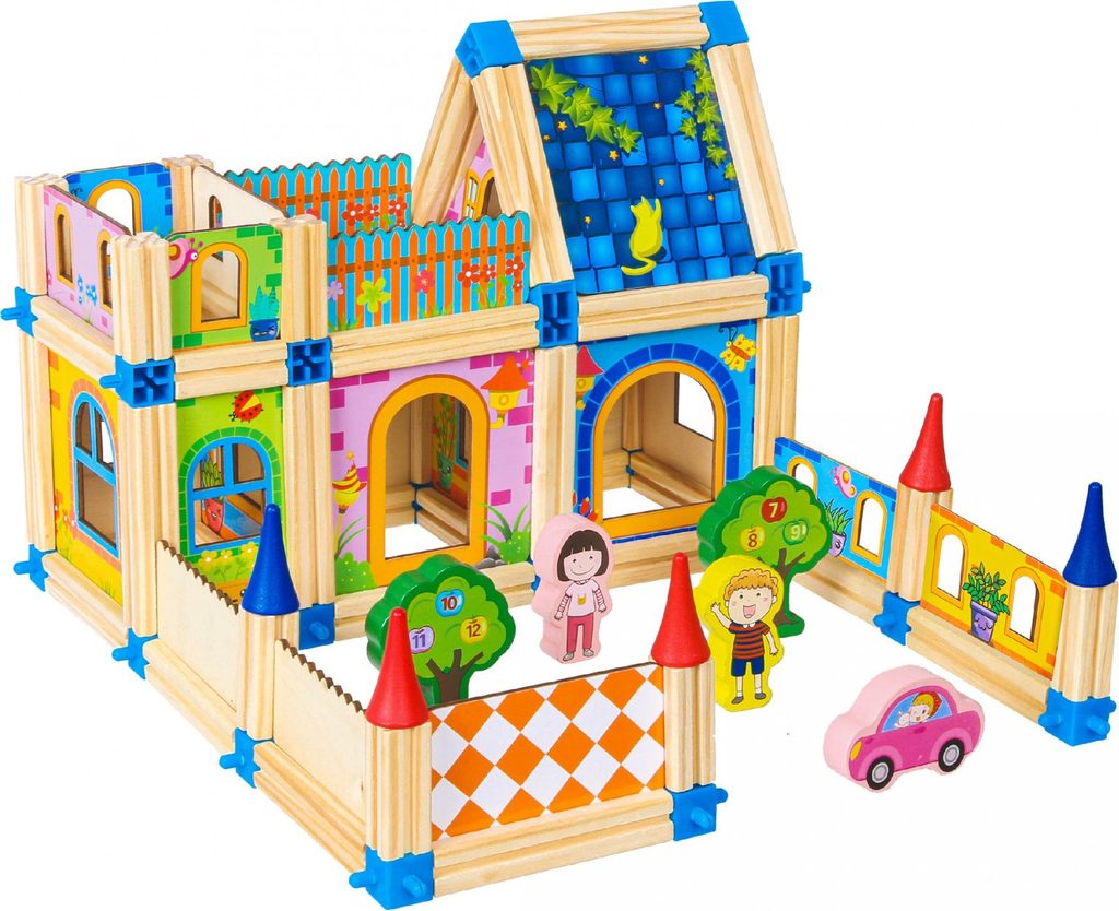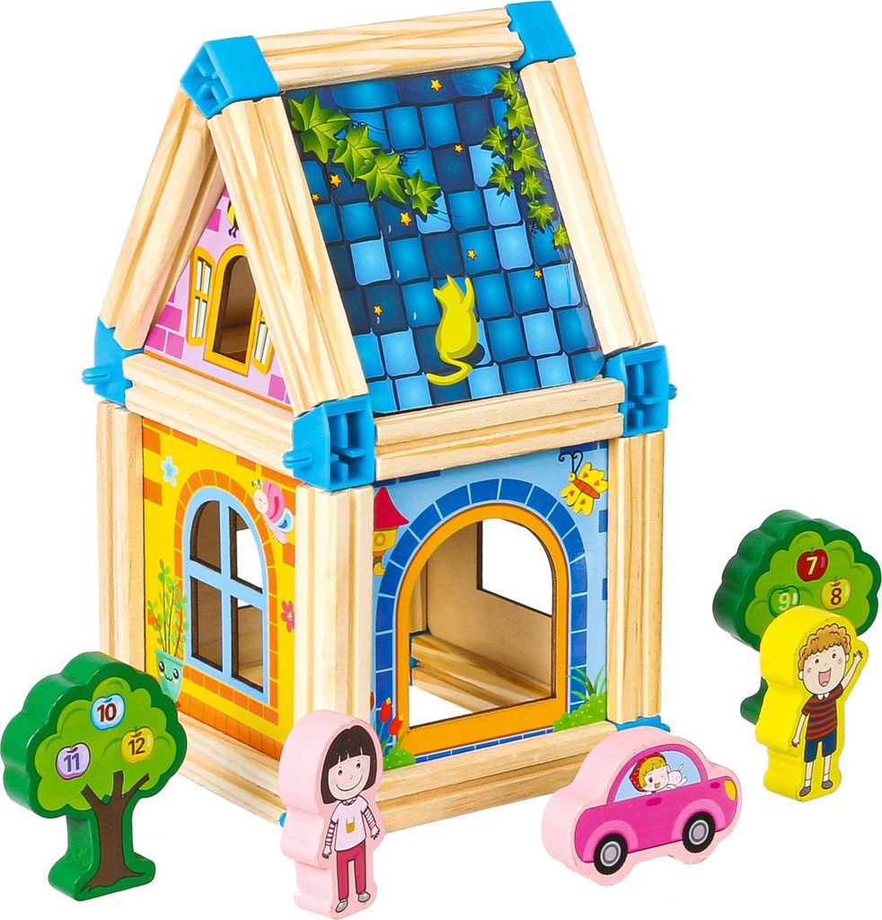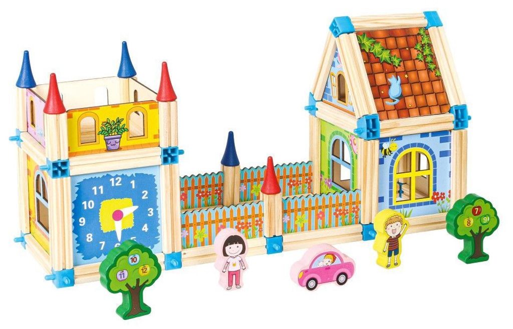 Ecotoys sada 128 ks barevných dřevěných kostek Domeček. Všechny kostky mají zaoblené hrany a jsou vyrobeny ze dřeva bez ostrých hran. Hra s nimi podporuje u dětí představivost a motoriku. Z kostek může dítě vytvořit nádherný domeček s postavičkami, stromy a autíčky. Hračka je určena pro děti od 36 měsíců věku.