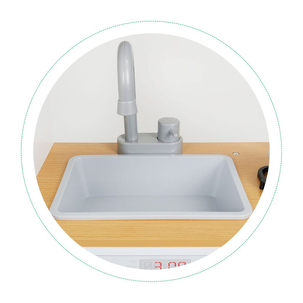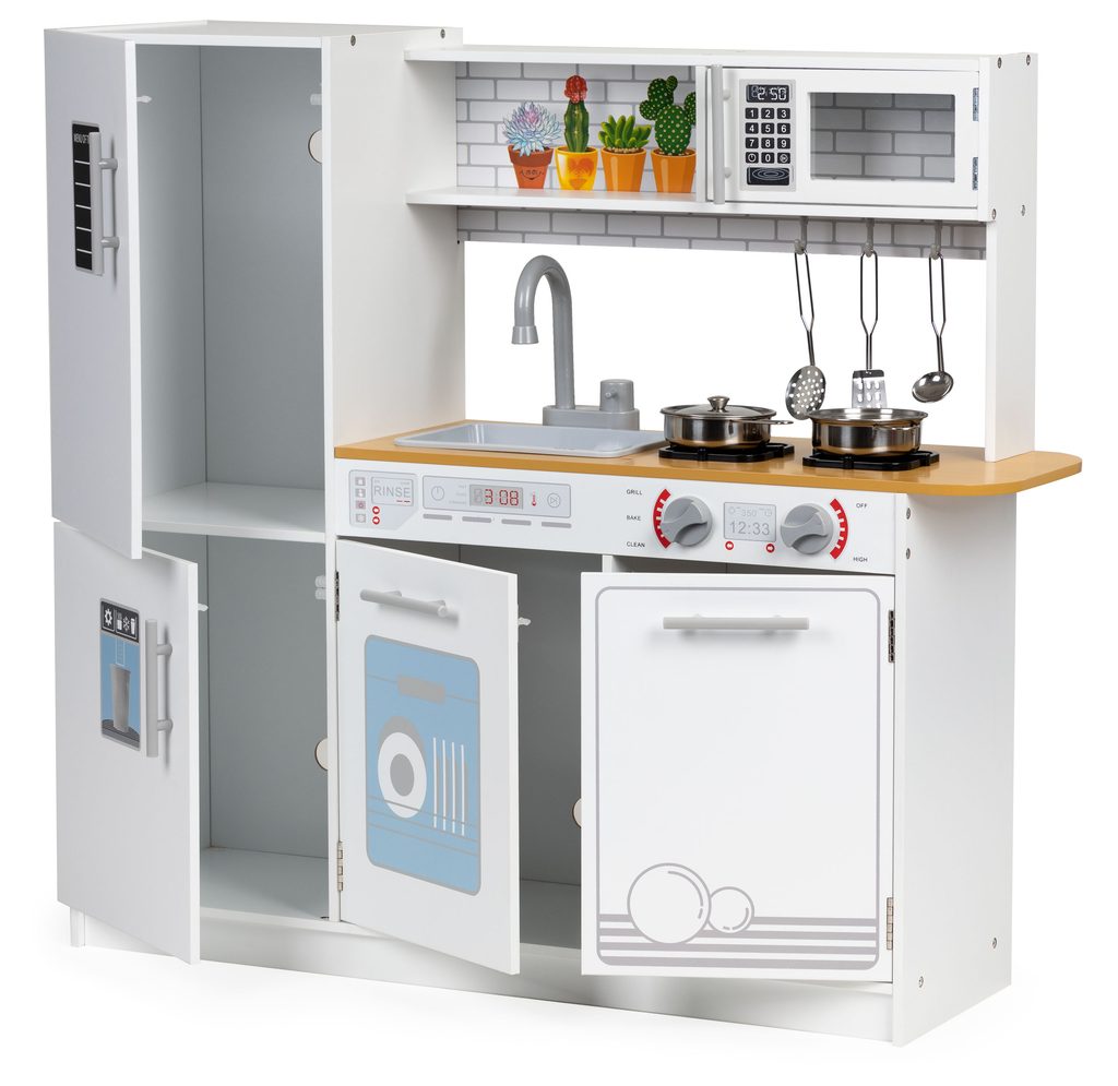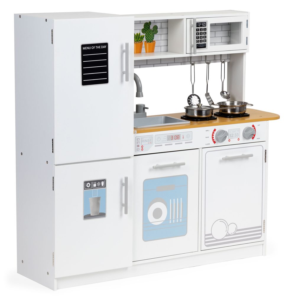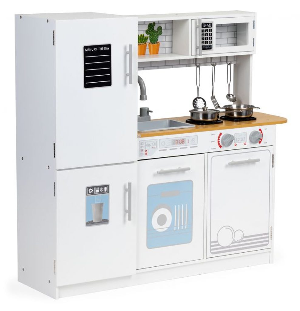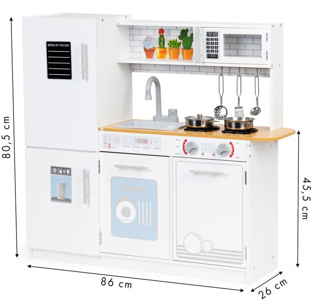 Velká dřevěná dětská kuchyňka Ecotoys Menu Kitchen s příslušenstvím pro děti od 3 let věku. Je vybavena celkem 5 kusy hliníkového nádobí. Vaše dítě se určitě s touto velkou kuchyňkou nudit nebude. Lednice, trouba, mikrovlnka a skříňka jsou otevírací. Díky policím a háčkům může dítě snadno v kuchyňce udržovat pořádek. Otočné vypínače u sporáku vydávají po otočení charakteristický zvuk "kliknutí". Dřez s vodovodním kohoutkem je vyjímatelný. Je vyrobena ze dřeva v pestrobarevném provedení.