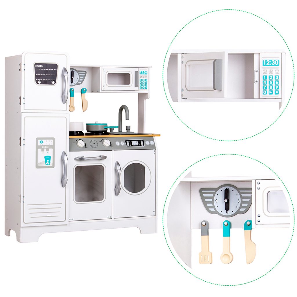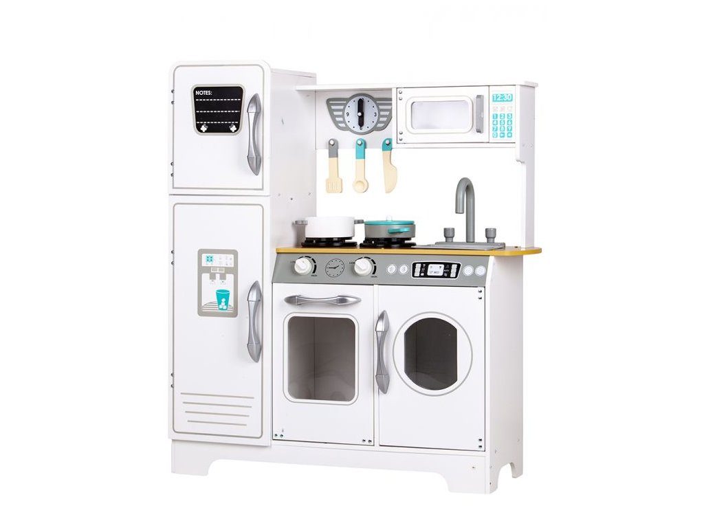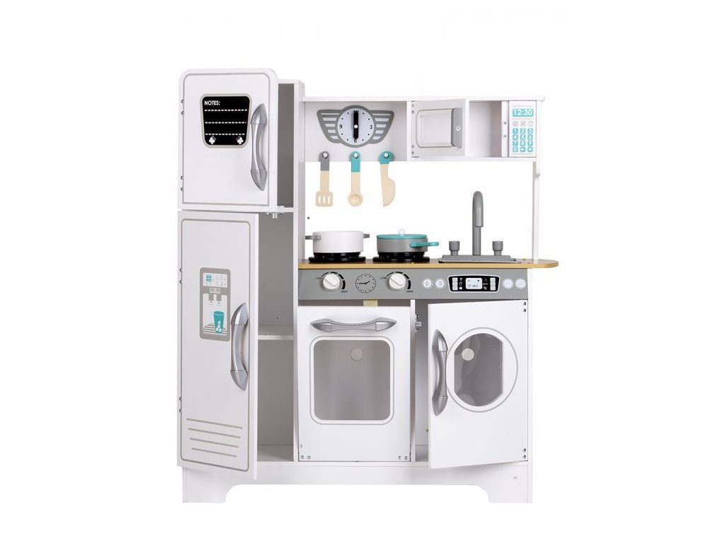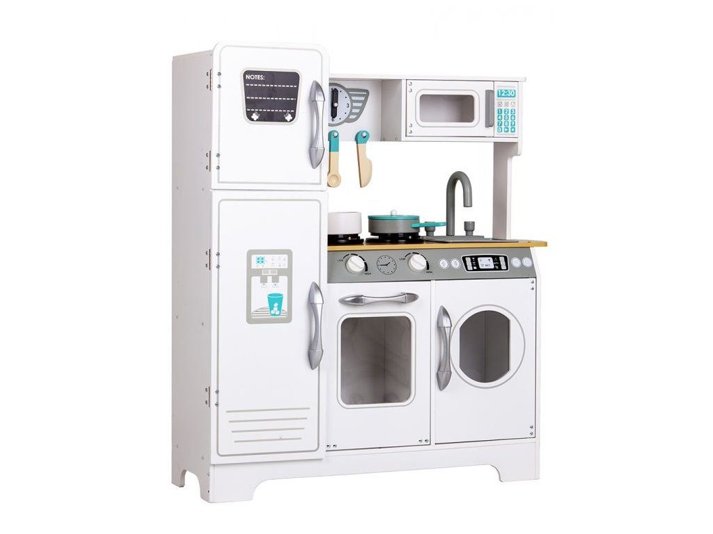 Dřevěná dětská kuchyňka Ecotoys s příslušenstvím pro děti od 3 let věku. Je vybavena celkem 6 kusy dřevěného nádobí. Vaše dítě se určitě s touto velkou kuchyňkou nudit nebude. Nalezne zde mikrovlnnou troubu, velkou lednici, pračku, sporák s dvěma plotýnka, troubu, dřez a hodiny. Vypínače u sporáku jsou otočné a po otočení vydávají charakteristické "klikání". Je vyrobena pouze z kvalitního dřeva ve skandinávském barevném provedení.