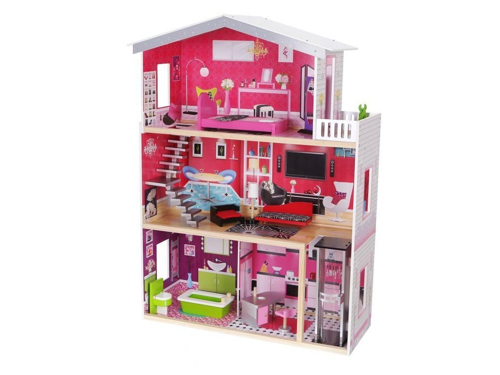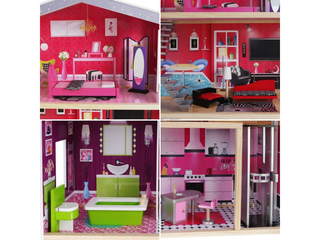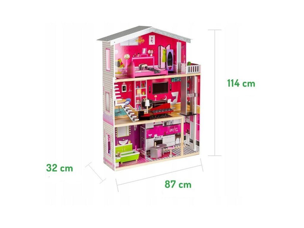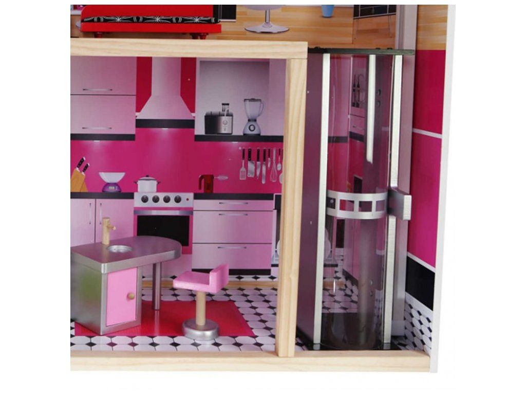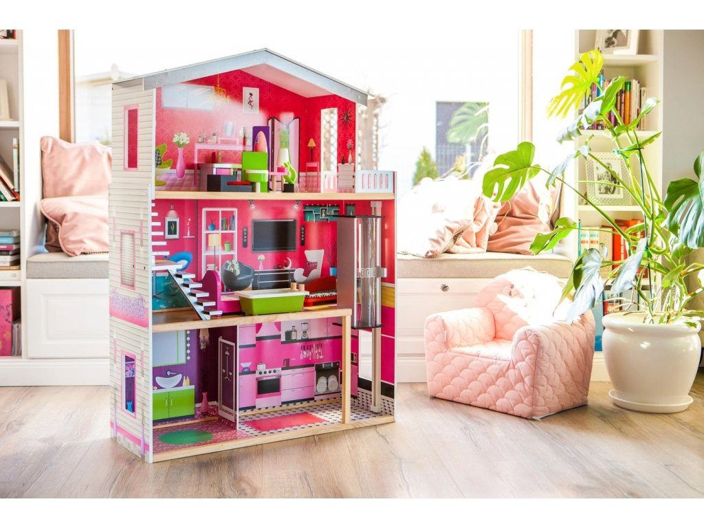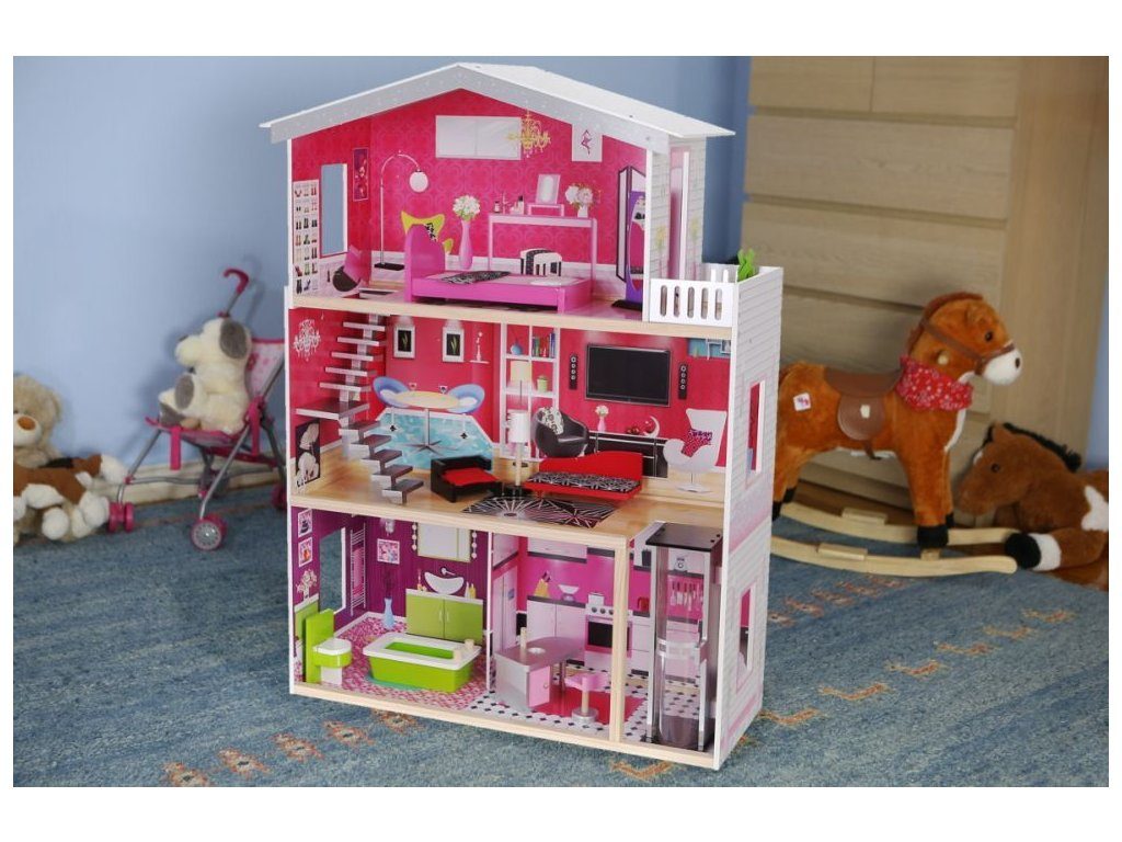 Obrovský dřevěný domeček pro panenky Malibu s výtahem. Celý domeček se skládá ze 3 částí, dvou pater a přízemí. Vše imituje dokonale skutečný bytový dům. Každý pokoj byl dokončen v jiném stylu, přizpůsoben byl dekor a nábytek charakteru a účelu místnosti. Součástí soupravy je také sada 10 ks dřevěného nábytku, který lze bez omezení přesunovat. Každý kus nábytku je vyroben ručně, s velkou pozorností k detailu a nejvyšší kvalitě provedení, bylo také dbáno na odstranění ostrých hran, které jsou zásadní pro bezpečnost Vašeho dítěte. Domeček pro panenky MALIBU je nepochybně nejlepší dárek, který můžete dát Vašemu dítěti! Každá dívka sní o takovém domečku! Rezidence Malibu bude vypadat dobře nejen v dětském pokoji, ale i v obývacím pokoji, což povzbudí potěšení všech členů domácnosti. Nemusíte se starat o sestavení domu - jasná příručka s obrázky a číslování všech prvků Vám umožní rychle a efektivně sestavit dům. Domeček je určen pro větší panenky Barbie. První a druhé patro propojené pohyblivým výtahem. Výška patra je cca 35 cm. Součástí balení je jedna panenka o výšce 28 cm.