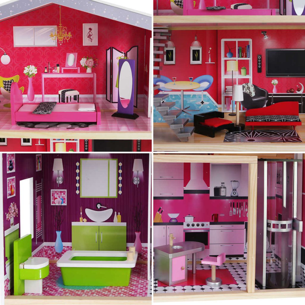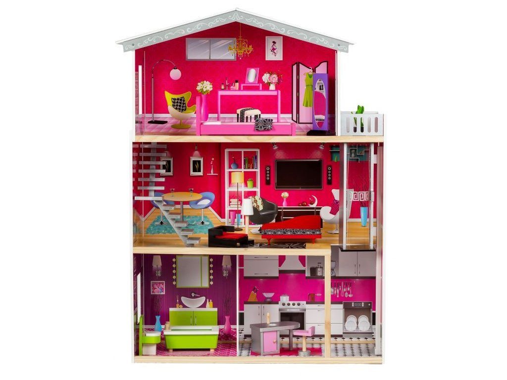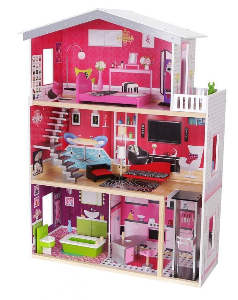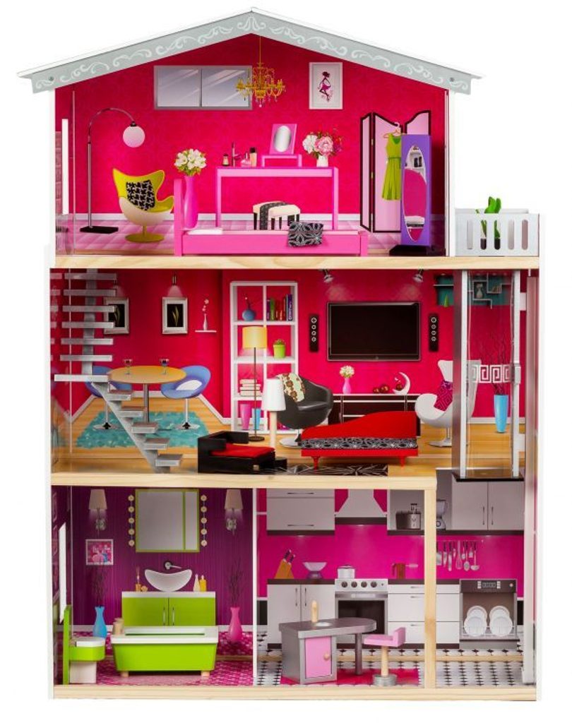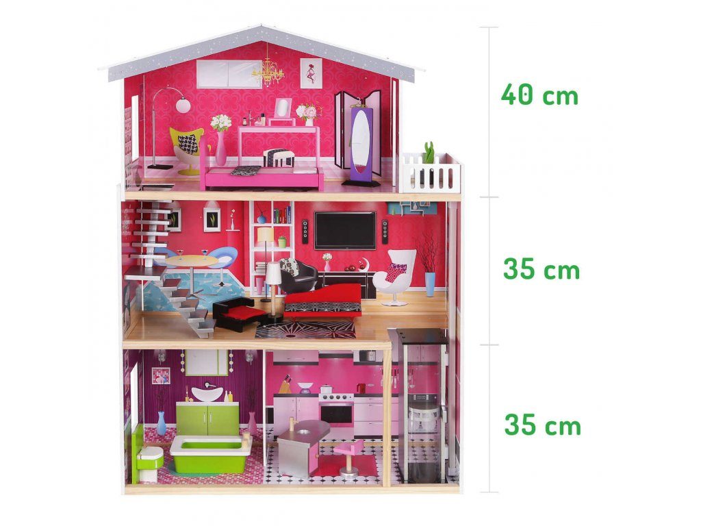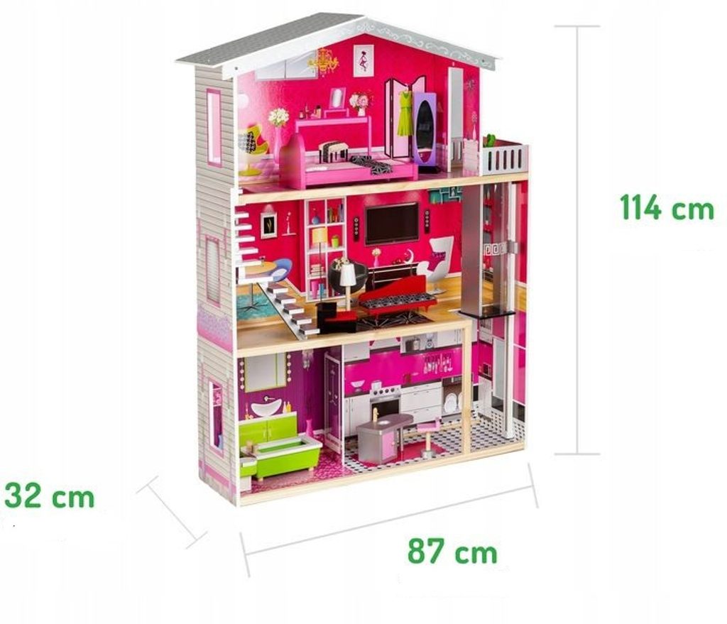 Obrovský dřevěný domeček pro panenky Malibu s výtahem. Celý domeček se skládá ze 3 částí, dvou pater a přízemí. Vše imituje dokonale skutečný bytový dům. Každý pokoj byl dokončen v jiném stylu, přizpůsoben byl dekor a nábytek charakteru a účelu místnosti. Součástí soupravy je také sada 10 ks dřevěného nábytku, který lze bez omezení přesunovat. Každý kus nábytku je vyroben ručně, s velkou pozorností k detailu a nejvyšší kvalitě provedení, bylo také dbáno na odstranění ostrých hran, které jsou zásadní pro bezpečnost Vašeho dítěte. Domeček pro panenky MALIBU je nepochybně nejlepší dárek, který můžete dát Vašemu dítěti! Každá dívka sní o takovém domečku! Rezidence Malibu bude vypadat dobře nejen v dětském pokoji, ale i v obývacím pokoji, což povzbudí potěšení všech členů domácnosti. Nemusíte se starat o sestavení domu - jasná příručka s obrázky a číslování všech prvků Vám umožní rychle a efektivně sestavit dům. Domeček je určen pro větší panenky Barbie. První a druhé patro propojené pohyblivým výtahem. Výška patra je cca 35 cm. Součástí balení je jedna panenka o výšce 28 cm.