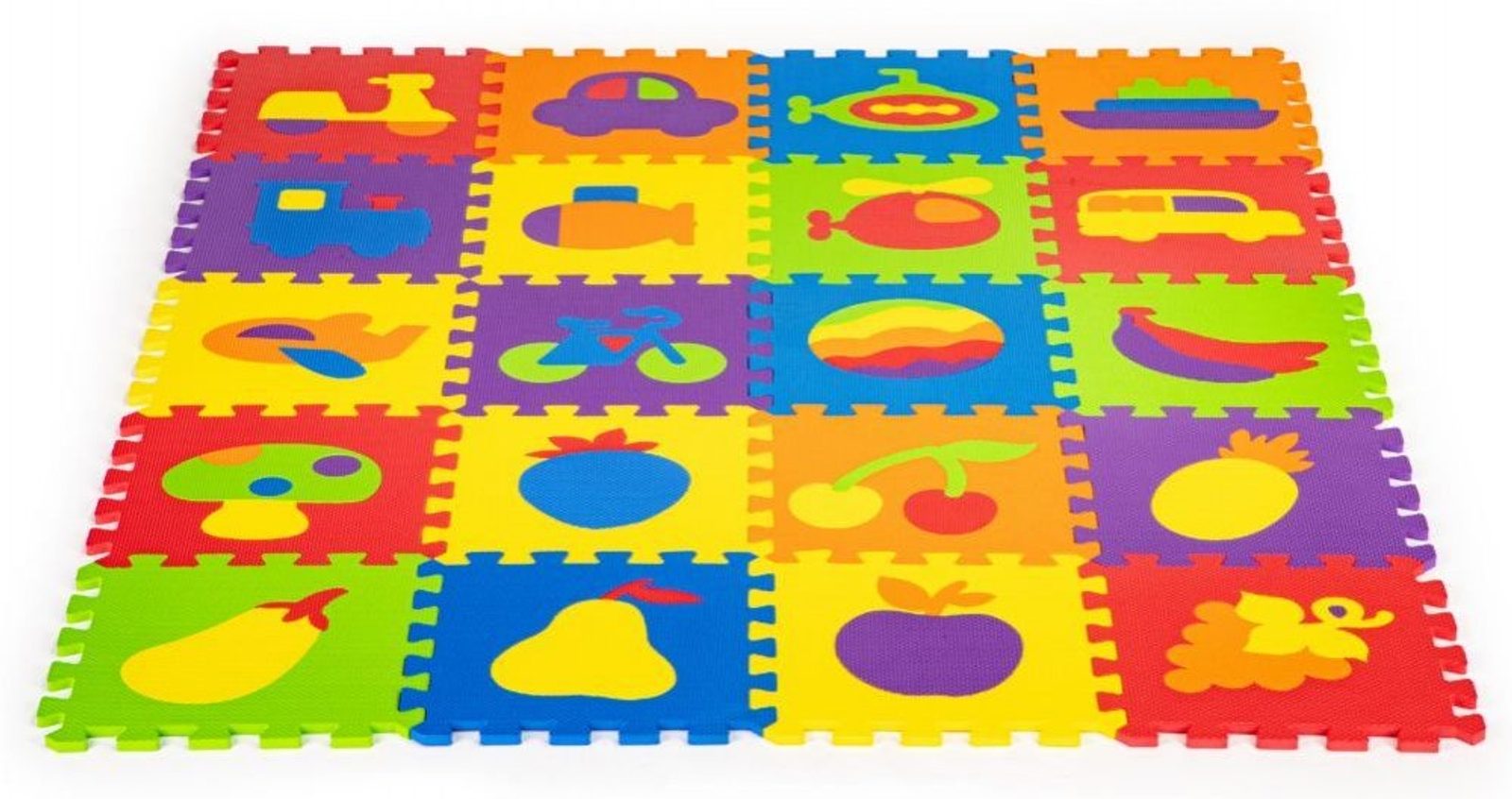 Ecotoys barevná vzdělávací deka ve stylu puzzle Happy Fruit se skládá z celkem 20 velkých barevných dílků z příjemné na dotek pěny. Uvnitř dílků jsou vyobrazeny obrázky různých druhů ovoce a dopravních prostředků. Všechny kostky jdou mezi sebou libovolně propojovat. Deka slouží k prvotnímu vzdělávání dítěte, dále jako cvičební podložka nebo místo pro hru. Vzhledem k tomu, že materiál deky nesaje vodu lze ji velmi snadno čistit například vlhkým hadříkem. Každý dílek má rozměry 32x31 cm. Součástí balení je praktická průhledná taška, kam můžete deku složit.