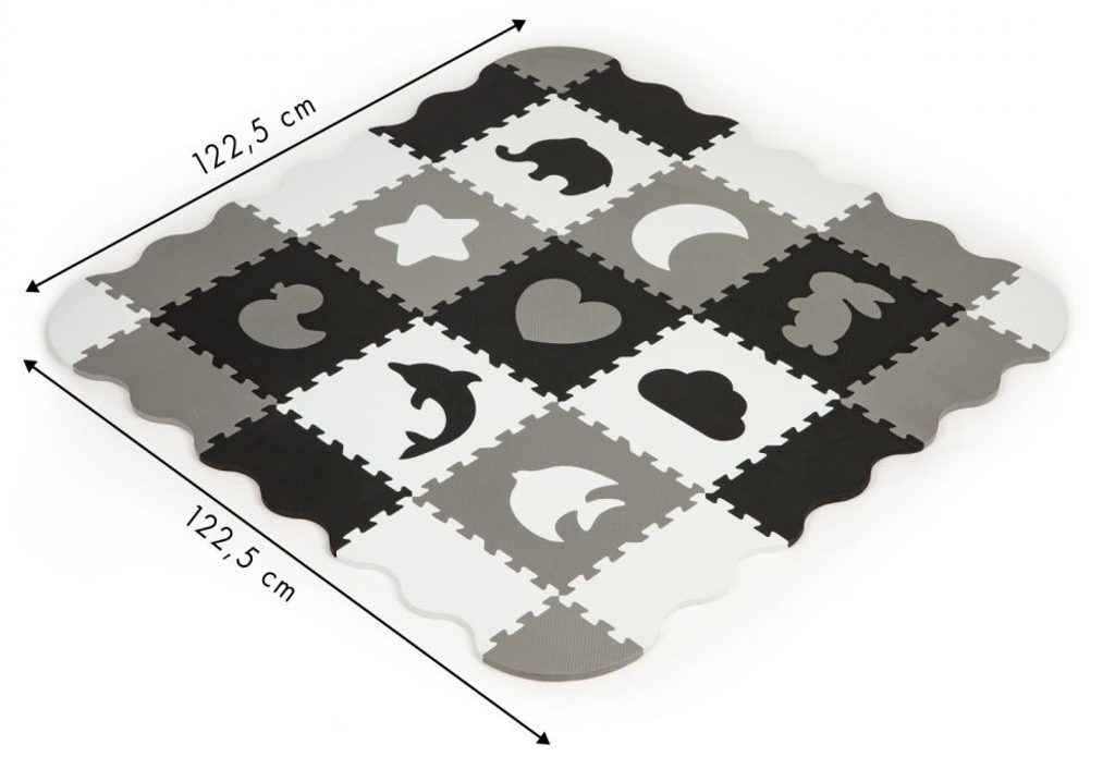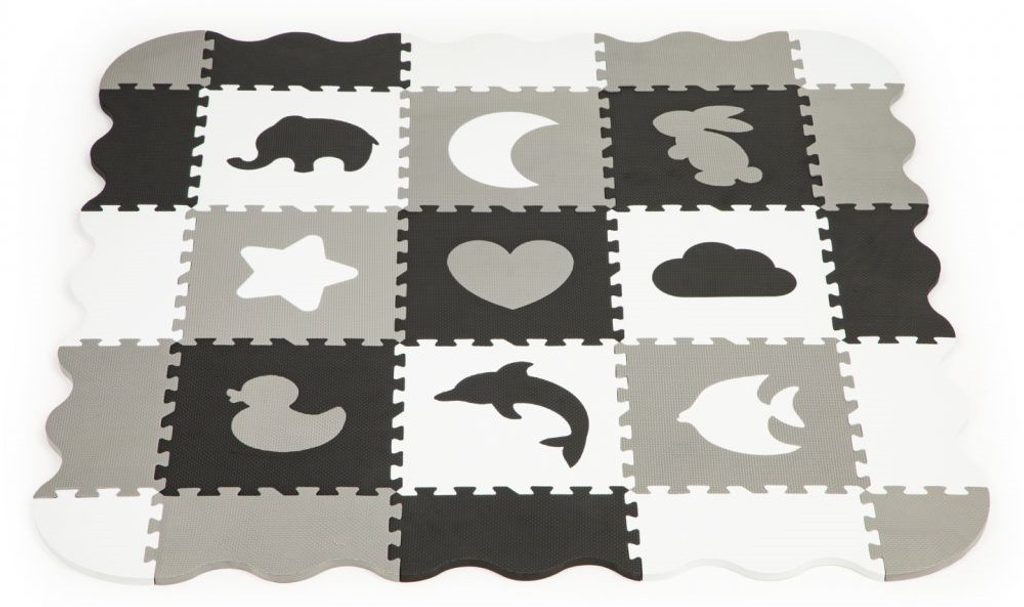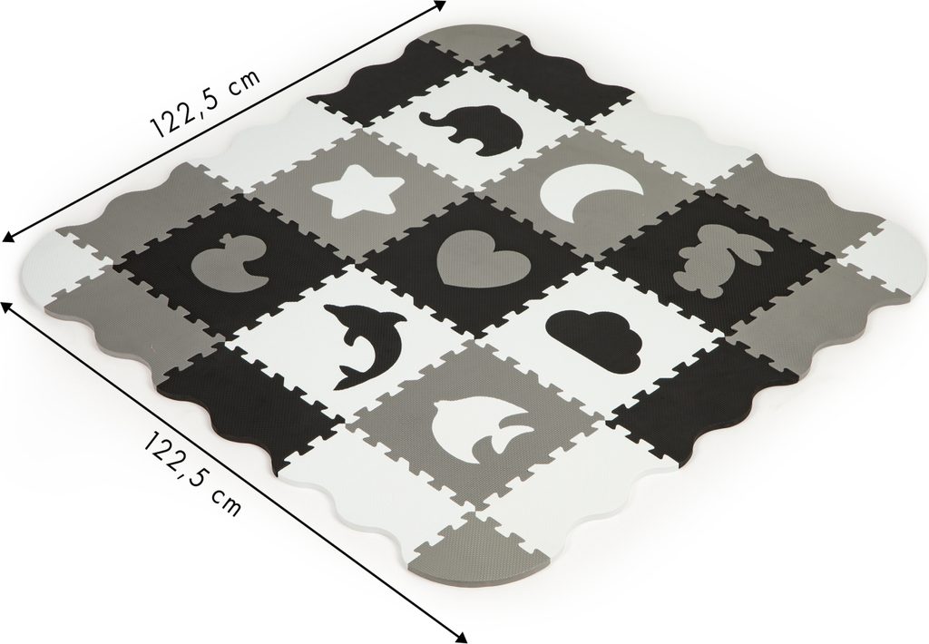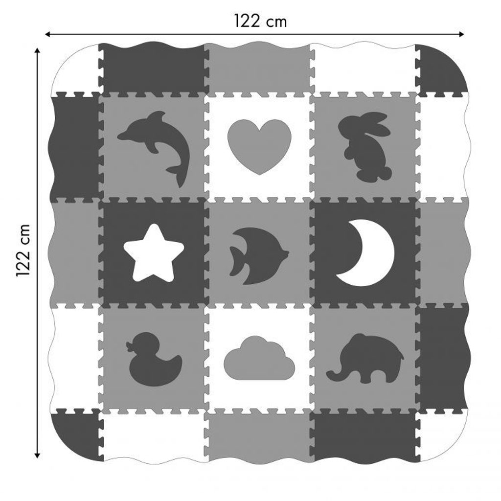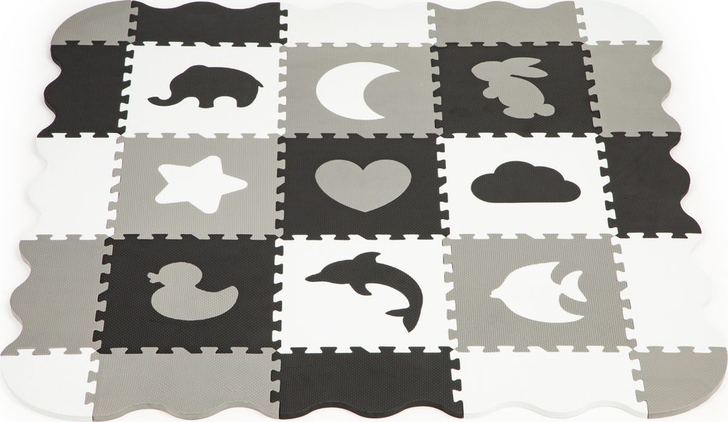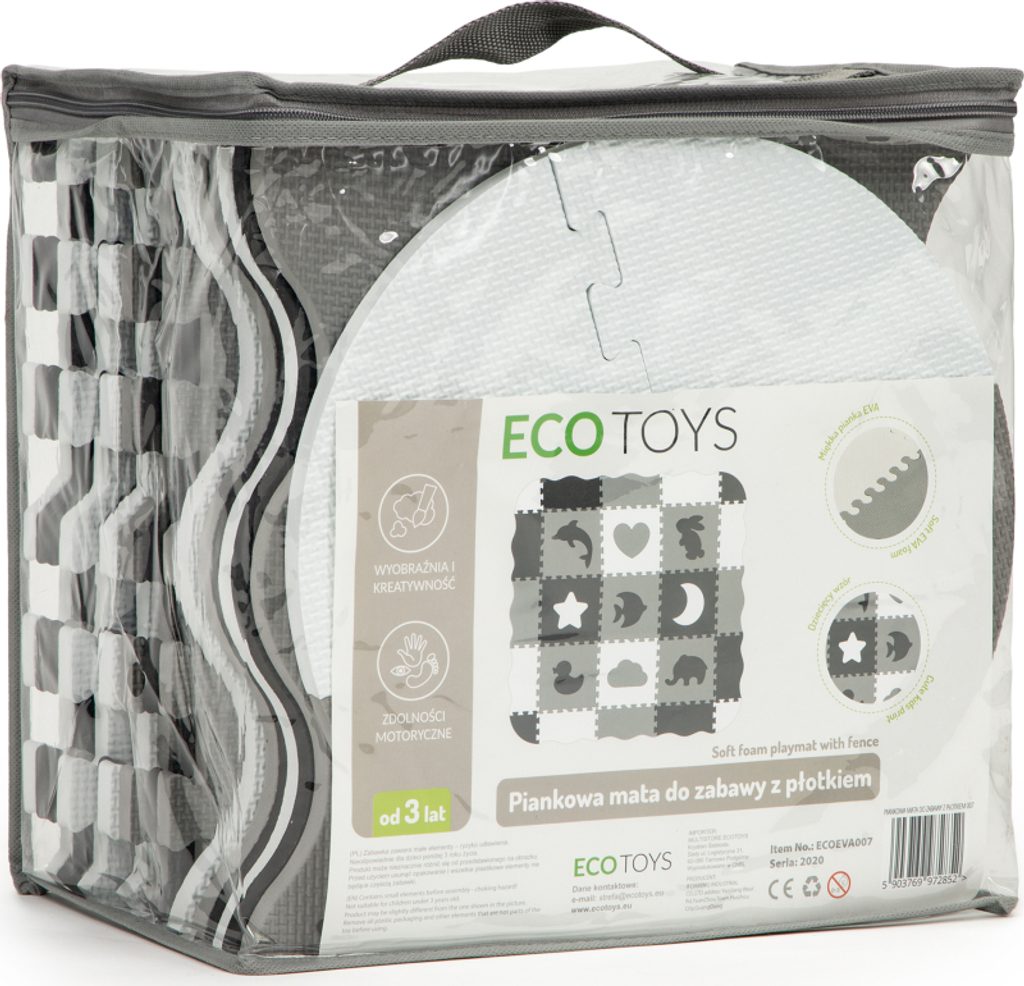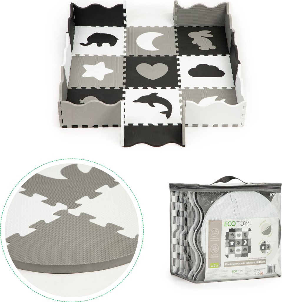 Ecotoys vzdělávací deka ve stylu puzzle Happy Gray se skládá z celkem 25 velkých barevných dílků z příjemné na dotek pěny. Uvnitř hlavních čtverců jsou vyobrazeny obrázky zvířátek a nebeských motivů. Všechny kostky jdou mezi sebou libovolně propojovat. Deka slouží k prvotnímu vzdělávání dítěte, dále jako cvičební podložka nebo místo pro hru. Vzhledem k tomu, že materiál deky nesaje vodu lze ji velmi snadno čistit například vlhkým hadříkem. Pomocí okrajových dílků lze vytvořit ohrádku. Součástí balení je praktická průhledná taška, kam můžete deku složit.