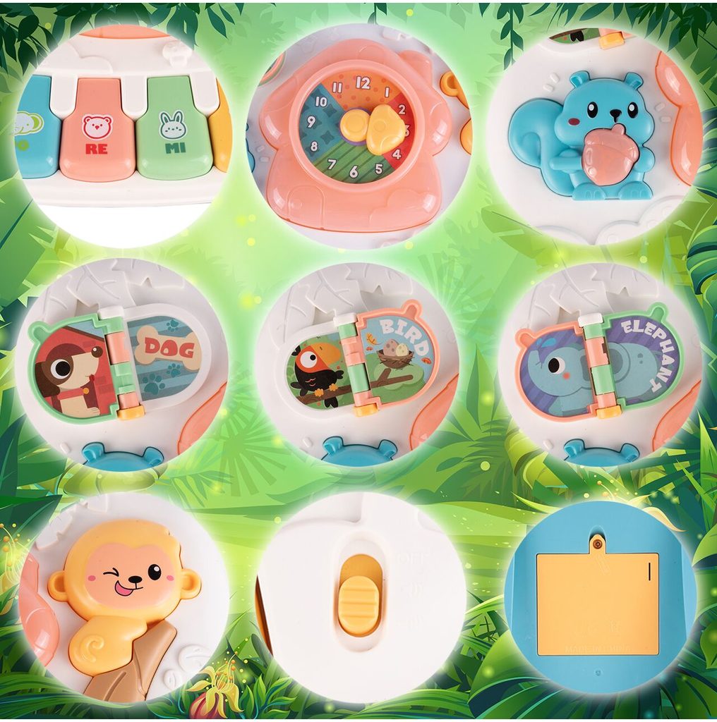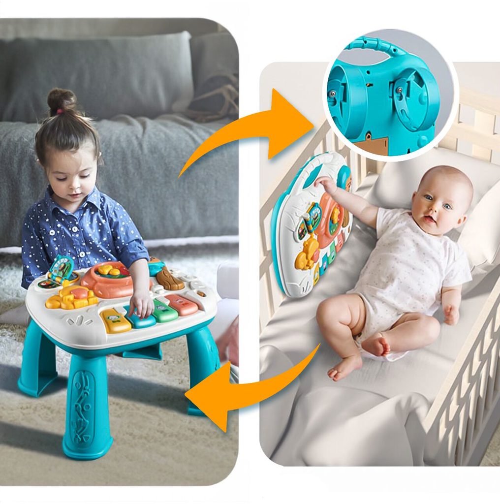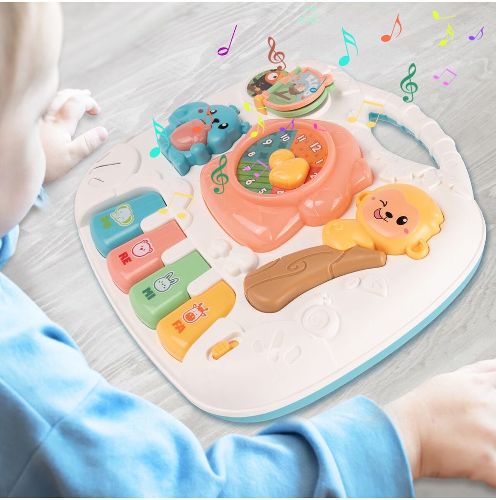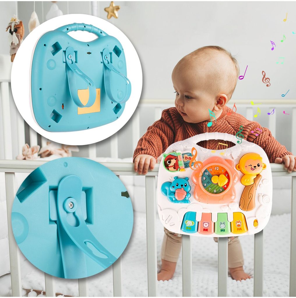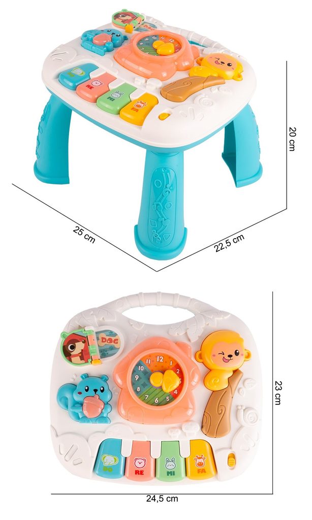 Dětský multifunkční stoleček 2v1 Opička určen pro ty nejmenší děti. Po vyjmutí nohou stolu může dítě hrát s panelem samotným nebo ho můžete zavěsit na dětskou postýlku. Hrací deska je pokryta příjemnými barvami. Tvary stolečku jsou velmi jednoduché a zaoblené pro maximální bezpečnost dítěte. Děti se díky všem smyslům seznamují s okolním světem, a proto je důležité neustále upoutávat jejich pozornost správným a příjemným způsobem - nejlépe veselou hrou. Barevný stolek zaujme zvukovými a barevnými efekty každé dítě. Velkou výhodou stolu je kombinace všech aktivit se zvukovými a světelnými efekty, které zajímají a povzbuzují všechny děti k hraní. Tento stolek bude perfektní jak pro chlapce, tak pro dívku - hračky, které lze přesunout, jistě zaujmou každé dítě.