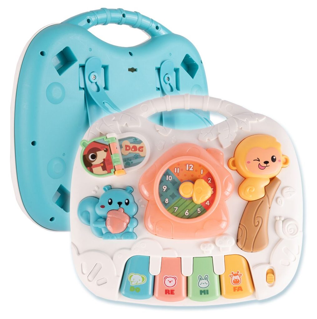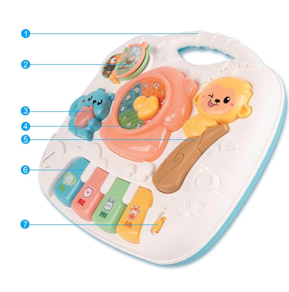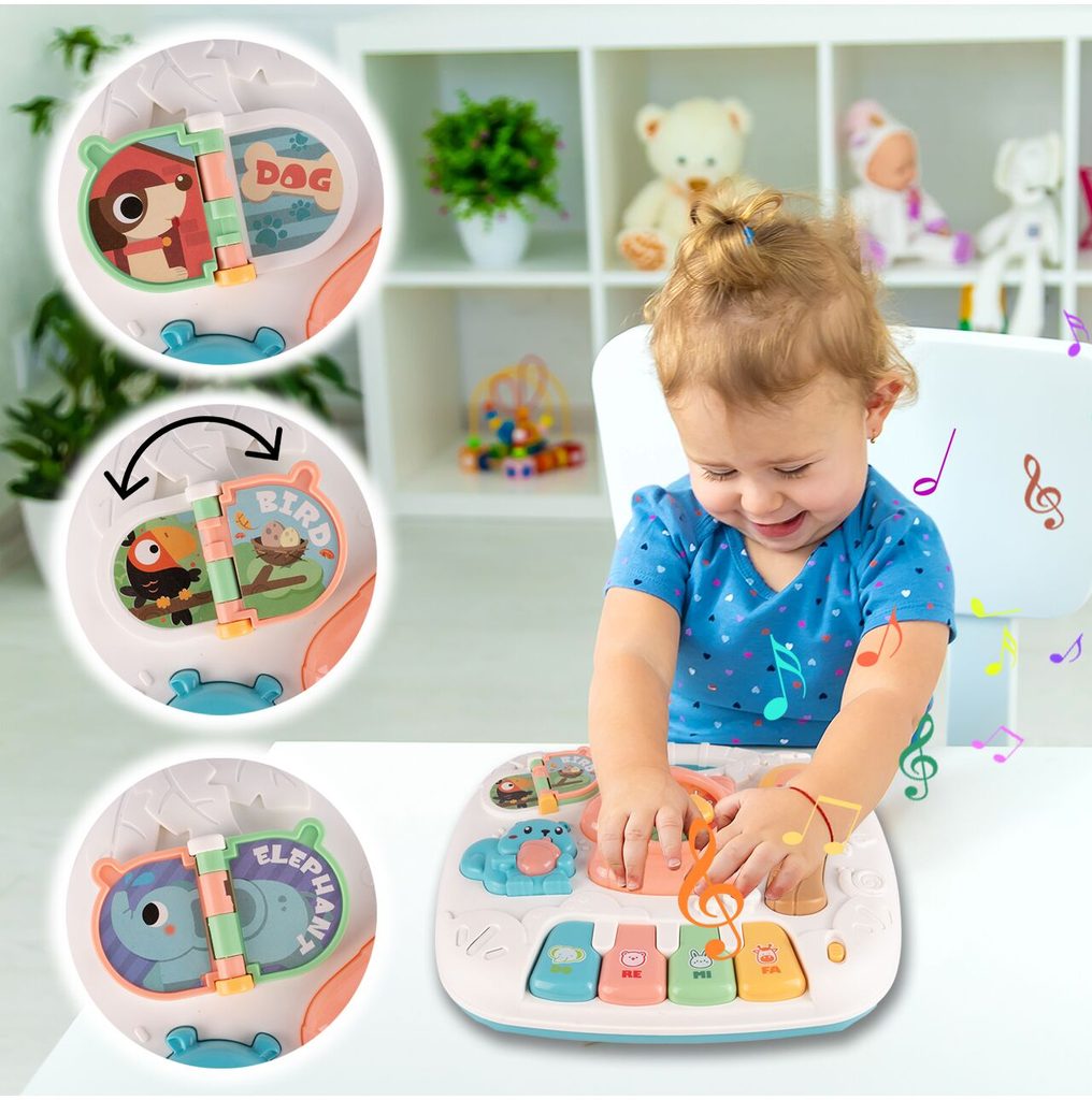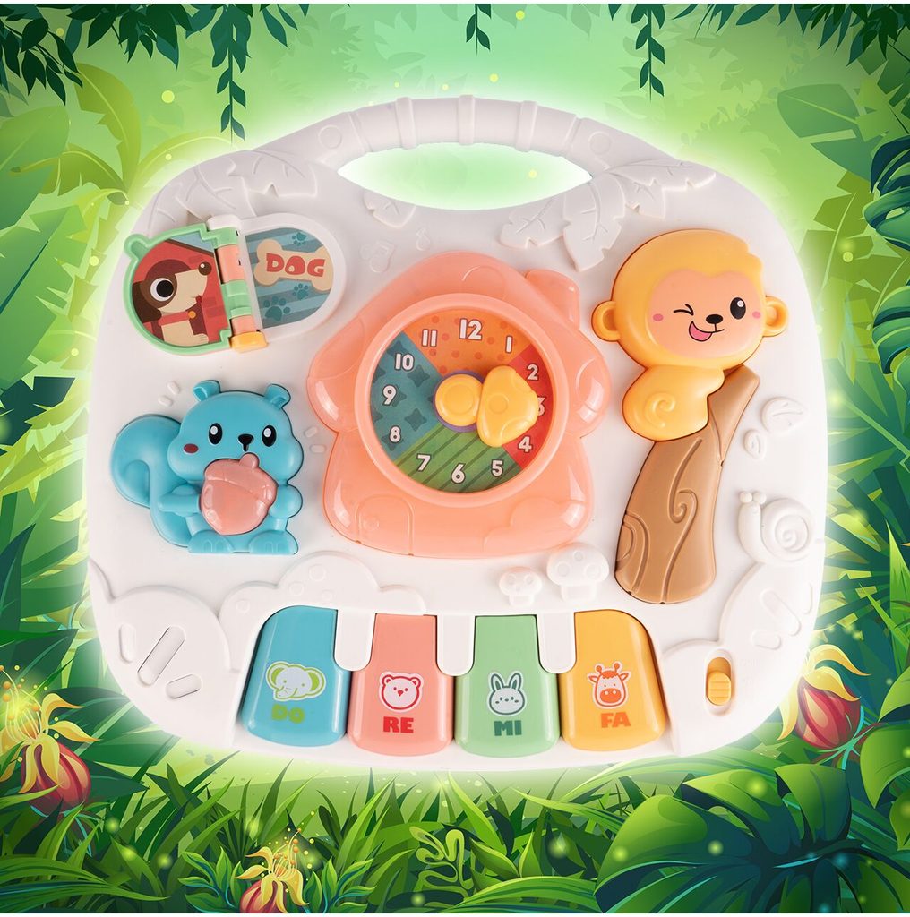 Dětský multifunkční stoleček 2v1 Opička určen pro ty nejmenší děti. Po vyjmutí nohou stolu může dítě hrát s panelem samotným nebo ho můžete zavěsit na dětskou postýlku. Hrací deska je pokryta příjemnými barvami. Tvary stolečku jsou velmi jednoduché a zaoblené pro maximální bezpečnost dítěte. Děti se díky všem smyslům seznamují s okolním světem, a proto je důležité neustále upoutávat jejich pozornost správným a příjemným způsobem - nejlépe veselou hrou. Barevný stolek zaujme zvukovými a barevnými efekty každé dítě. Velkou výhodou stolu je kombinace všech aktivit se zvukovými a světelnými efekty, které zajímají a povzbuzují všechny děti k hraní. Tento stolek bude perfektní jak pro chlapce, tak pro dívku - hračky, které lze přesunout, jistě zaujmou každé dítě.