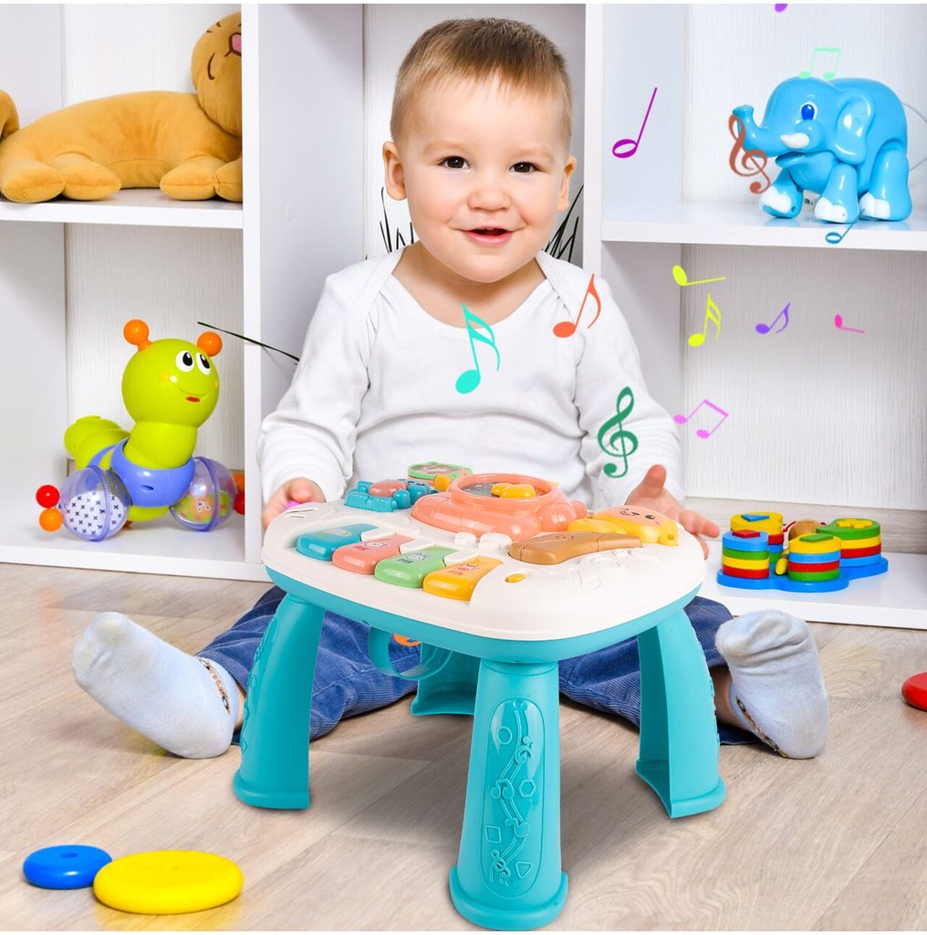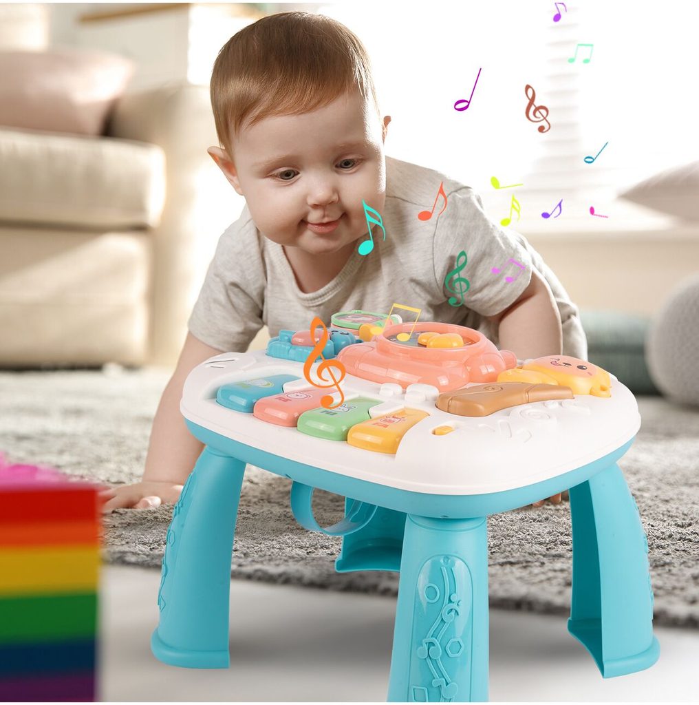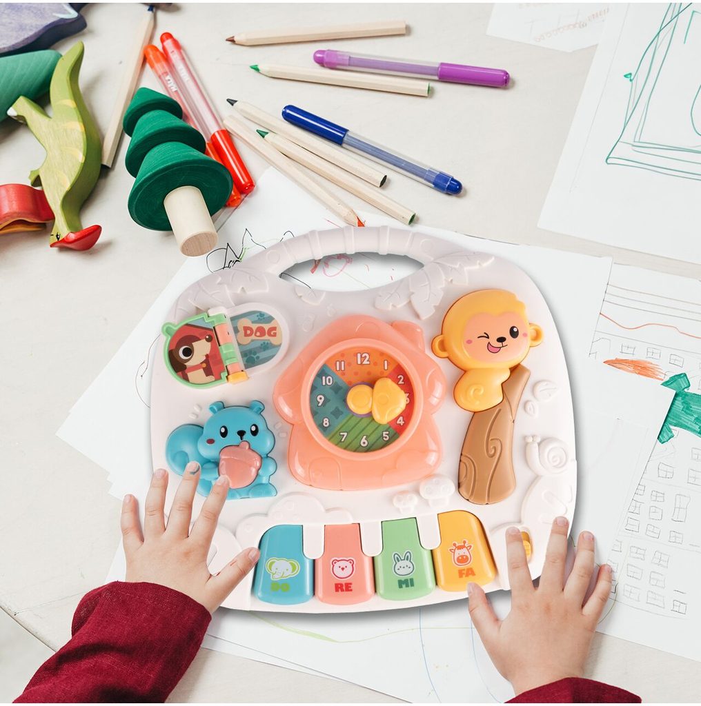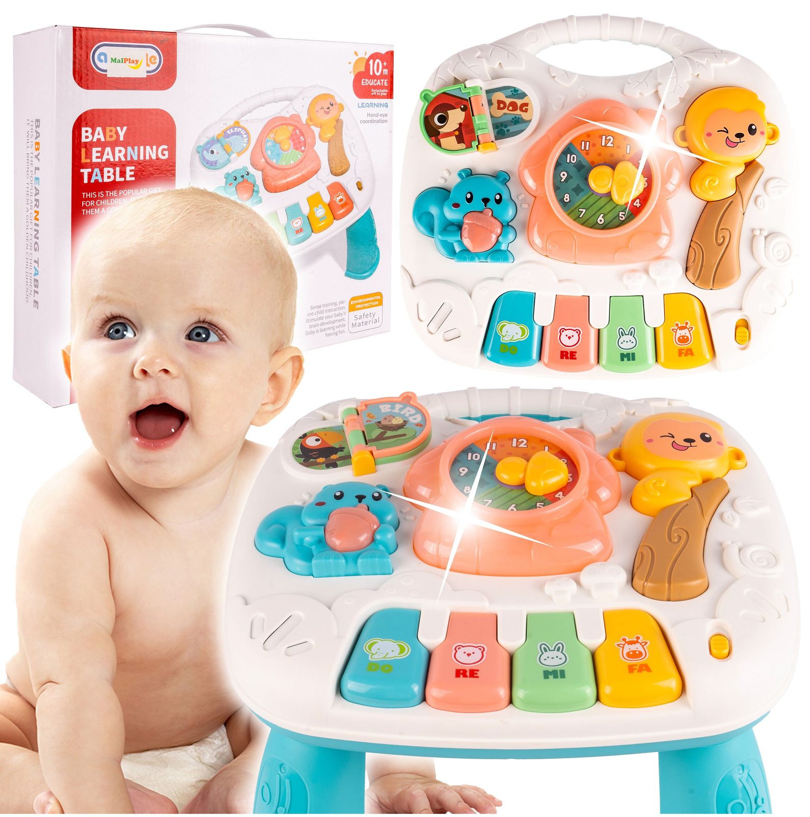 Dětský multifunkční stoleček 2v1 Opička určen pro ty nejmenší děti. Po vyjmutí nohou stolu může dítě hrát s panelem samotným nebo ho můžete zavěsit na dětskou postýlku. Hrací deska je pokryta příjemnými barvami. Tvary stolečku jsou velmi jednoduché a zaoblené pro maximální bezpečnost dítěte. Děti se díky všem smyslům seznamují s okolním světem, a proto je důležité neustále upoutávat jejich pozornost správným a příjemným způsobem - nejlépe veselou hrou. Barevný stolek zaujme zvukovými a barevnými efekty každé dítě. Velkou výhodou stolu je kombinace všech aktivit se zvukovými a světelnými efekty, které zajímají a povzbuzují všechny děti k hraní. Tento stolek bude perfektní jak pro chlapce, tak pro dívku - hračky, které lze přesunout, jistě zaujmou každé dítě.