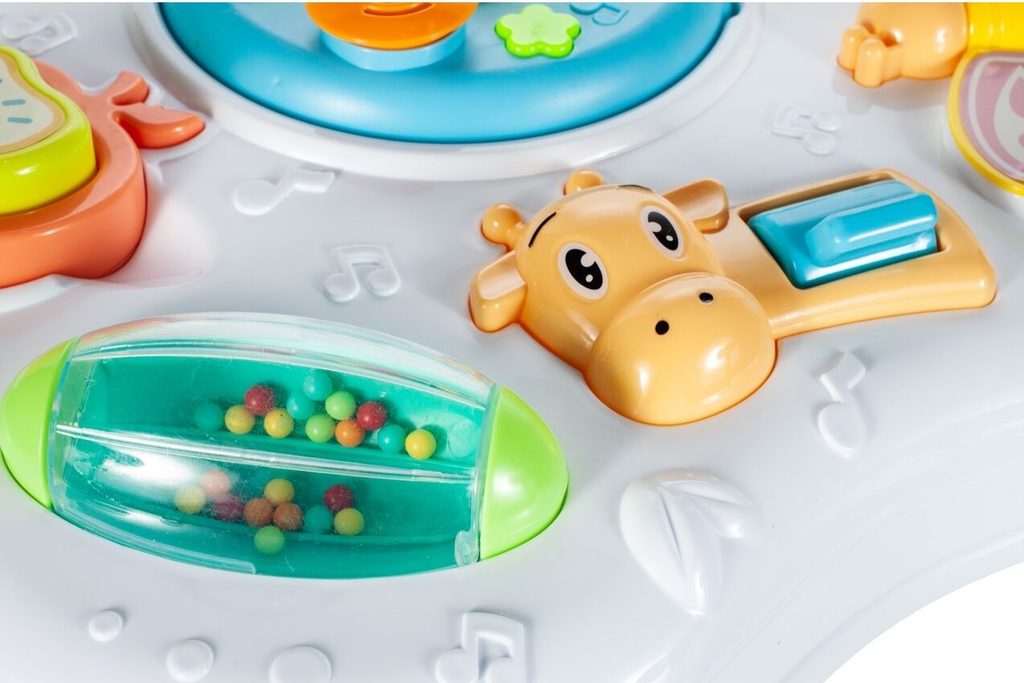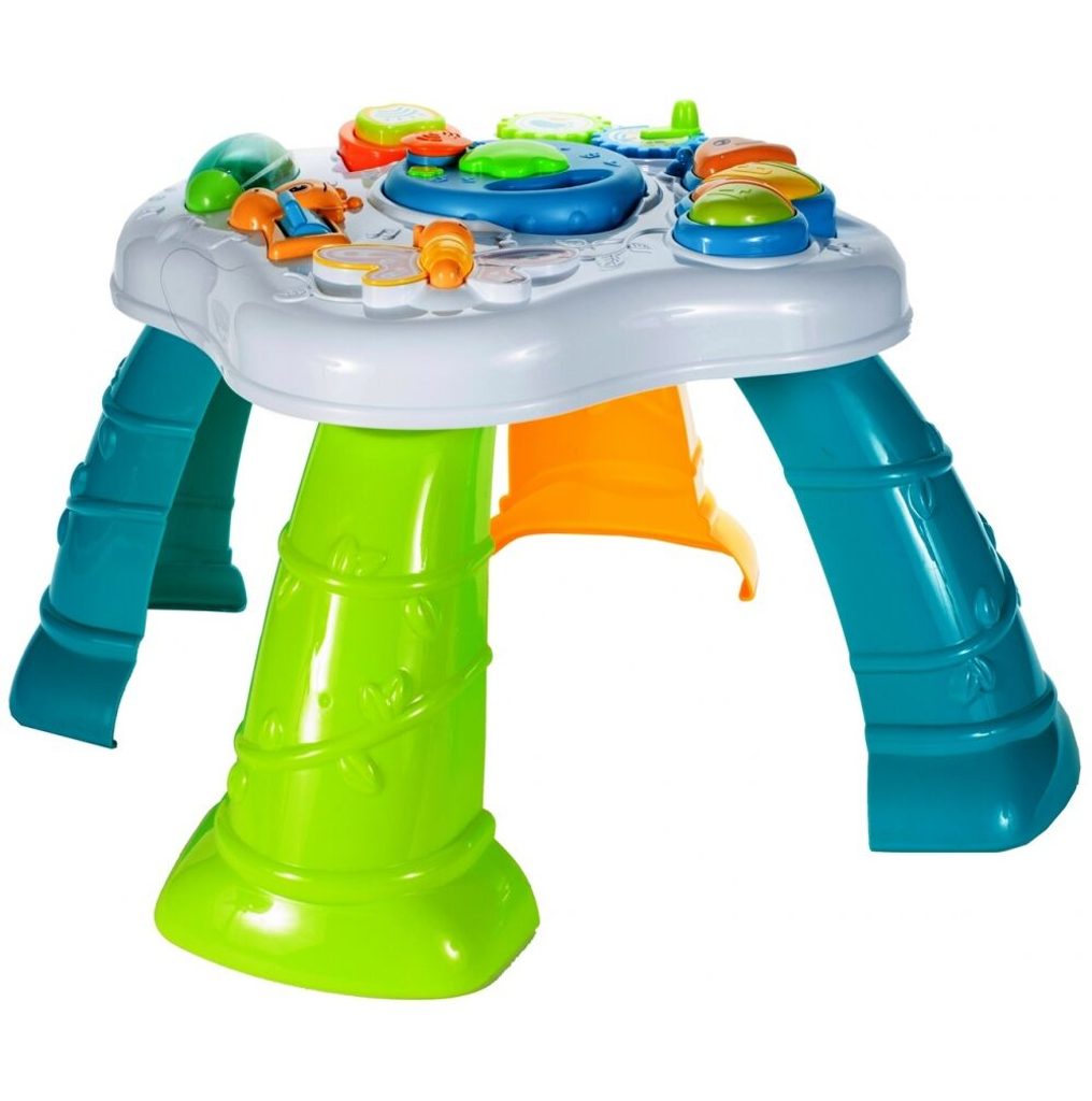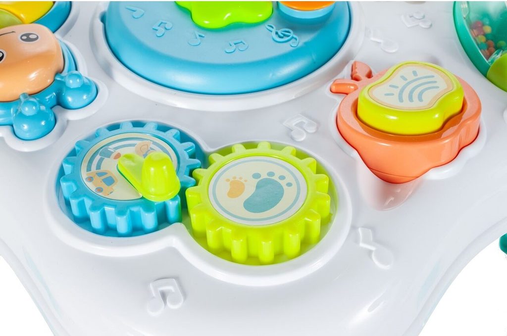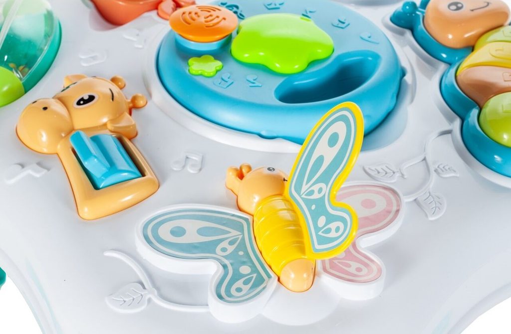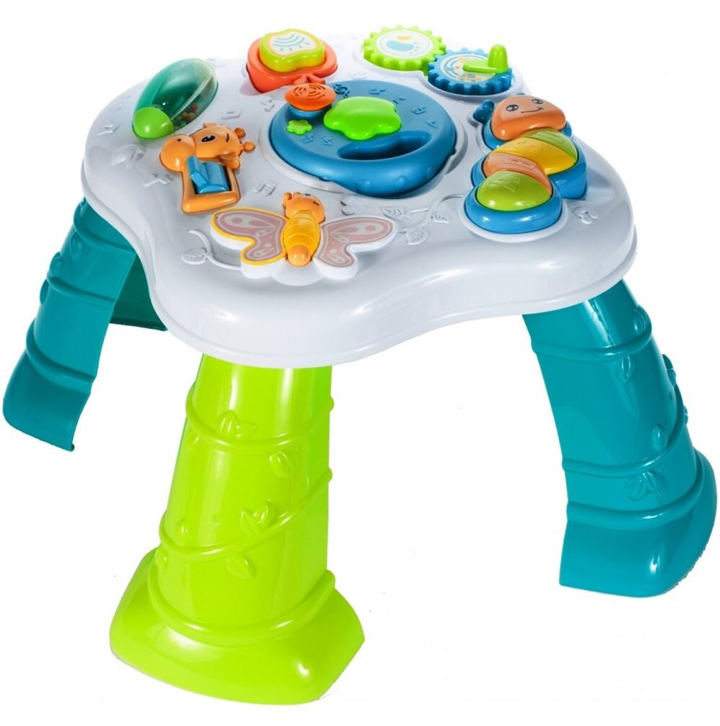 Dětský multifunkční stoleček 2v1 Baby Table určen pro ty nejmenší děti. Po vyjmutí nohou stolu může dítě hrát s panelem. Hrací panel je je vybaven mnoha aktivitami, které dítě zabaví po velmi dlouhou dobu. Najdete na něm ozubená kolečka, chrastítko, motýlka, kravičku a také housenku a bubínek na baterie, které mají mnoho dalších funkcí. Navíc je lze vyjmut a hrát si s nimi samostatně. Tvary stolečku jsou velmi jednoduché a zaoblené pro maximální bezpečnost dítěte. Děti se díky všem smyslům seznamují s okolním světem, a proto je důležité neustále upoutávat jejich pozornost správným a příjemným způsobem - nejlépe veselou hrou. Barevný stolek zaujme zvukovými a barevnými efekty každé dítě. Stoleček má dvoustupňovou kontrolu hlasitosti, díky níž může být hračka zcela zticha, což bude užitečné během večerní hry. Velkou výhodou stolu je kombinace všech aktivit se zvukovými a světelnými efekty, které zajímají a povzbuzují všechny děti k hraní. Tento stolek bude perfektní jak pro chlapce, tak pro dívku - hračky, které lze přesunout, jistě zaujmou každé dítě.