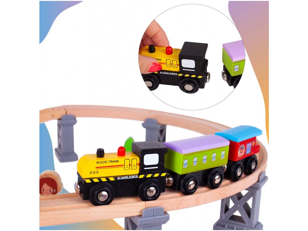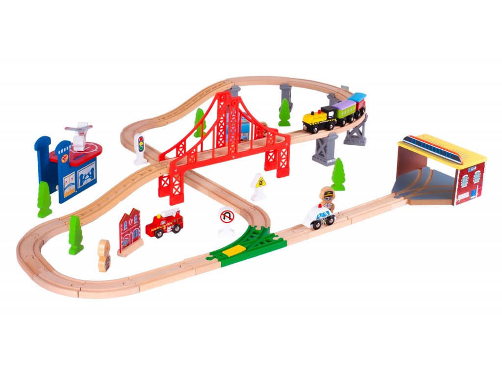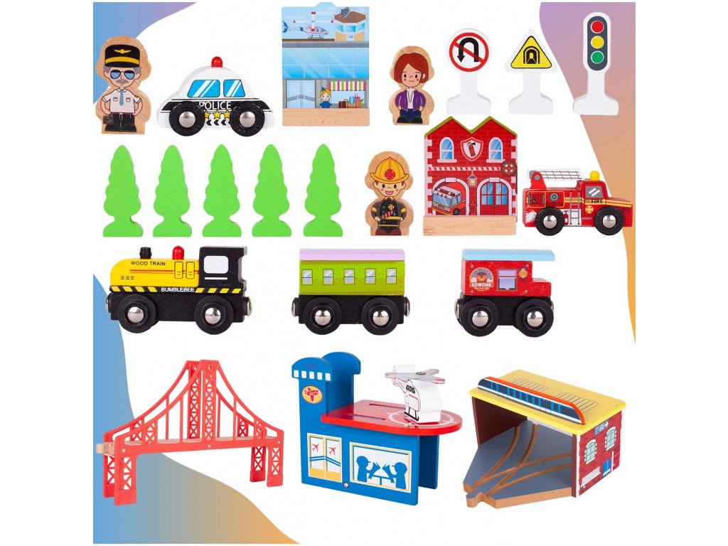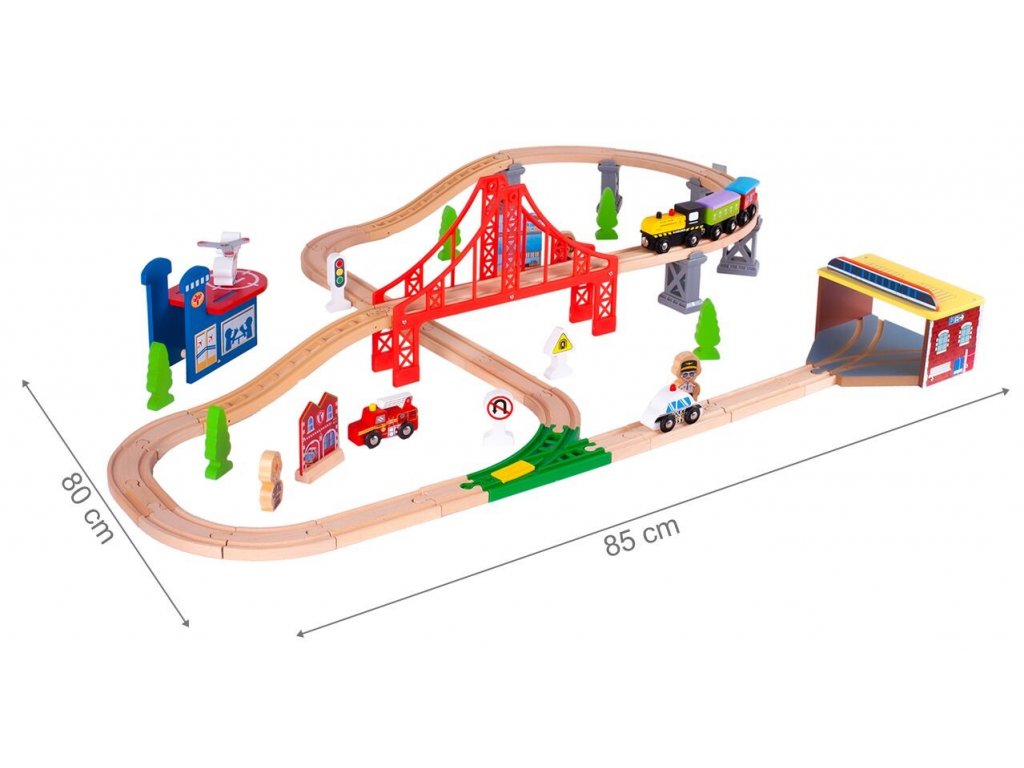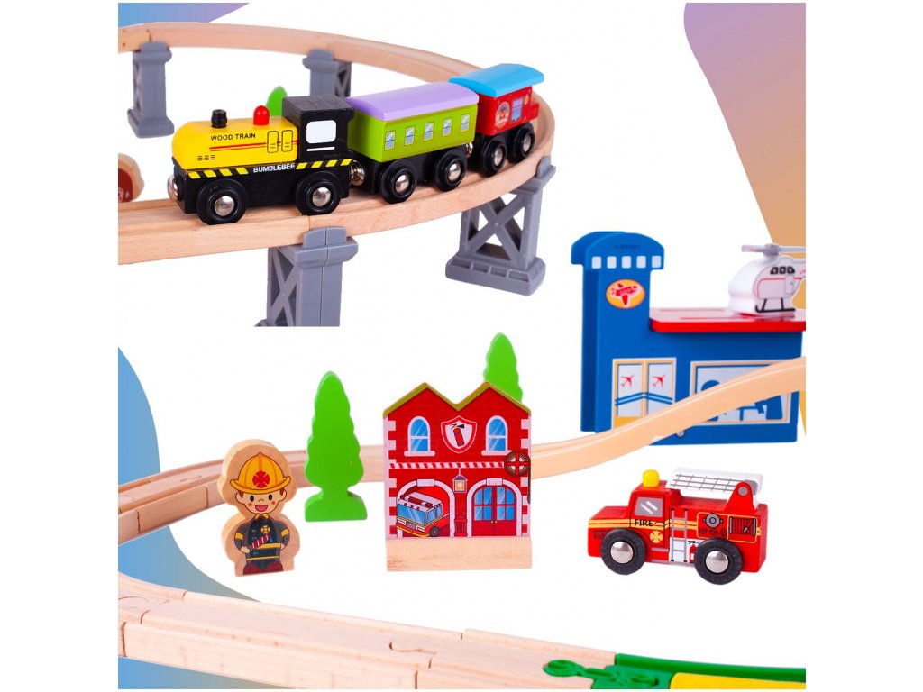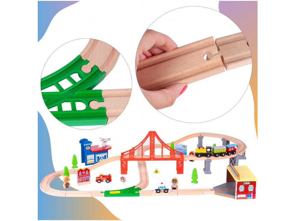 Dřevěná vláčkodráha Wooden Train s 70 elementy učí dětí představivost a podporuje kreativitu. Vláčkodráha je kompletně vybavená, naleznete zde lokomotivu se dvěma vagóny, helikoptéru, přistávací plochu, budovy, postavičky, stromečky, autíčka, dopravní značky a samozřejmě koleje. Vše je vyrobeno ze dřeva bez ostrých hran v pestrobarevném provedení. Hračka je určena pro děti od 36 měsíců věku.