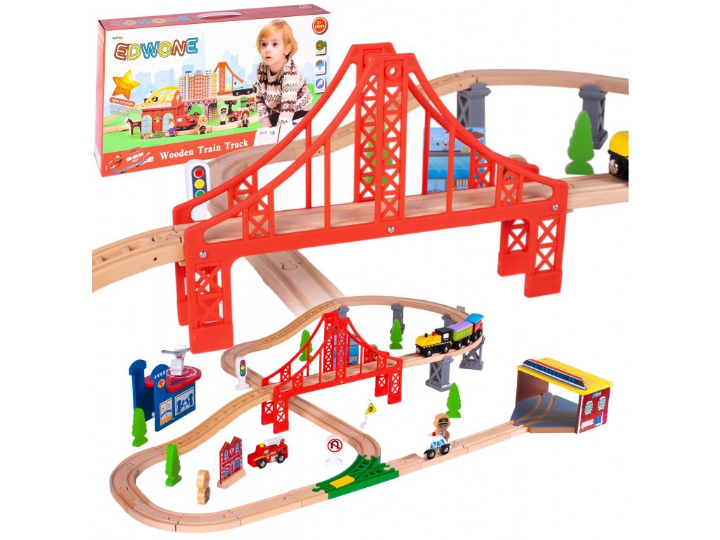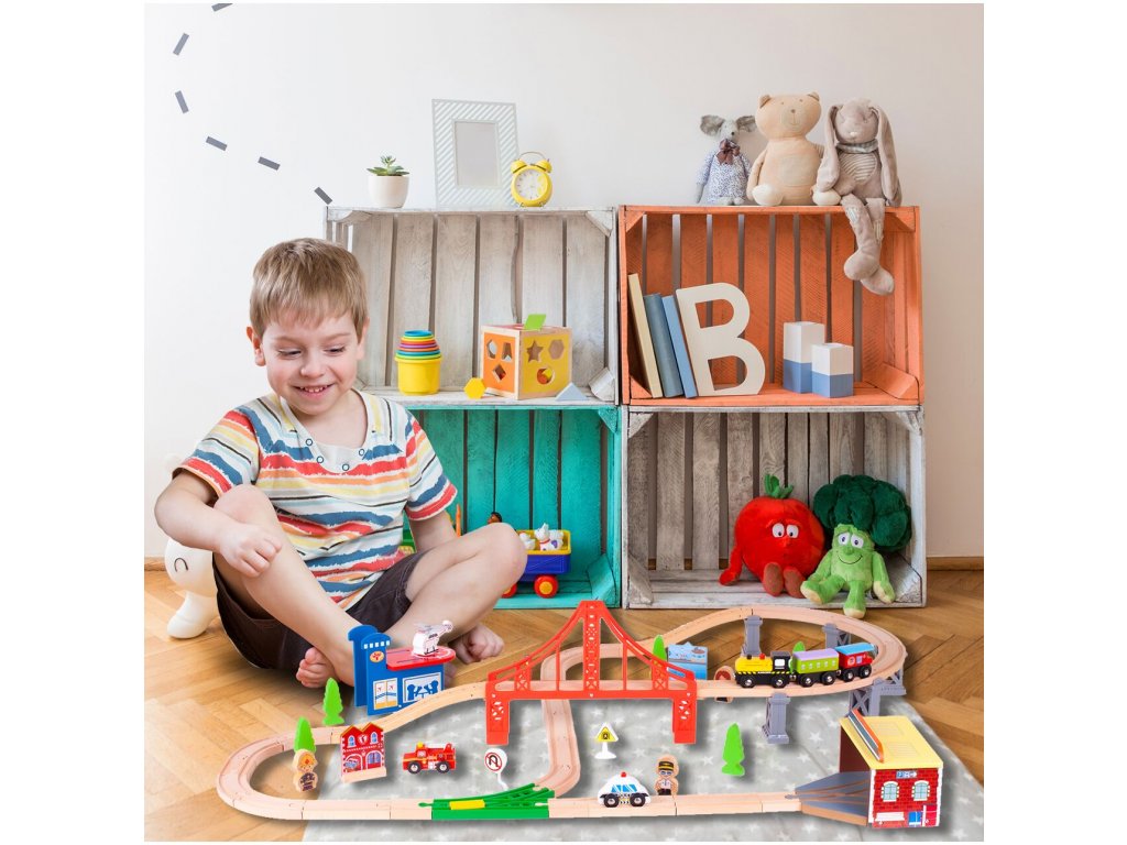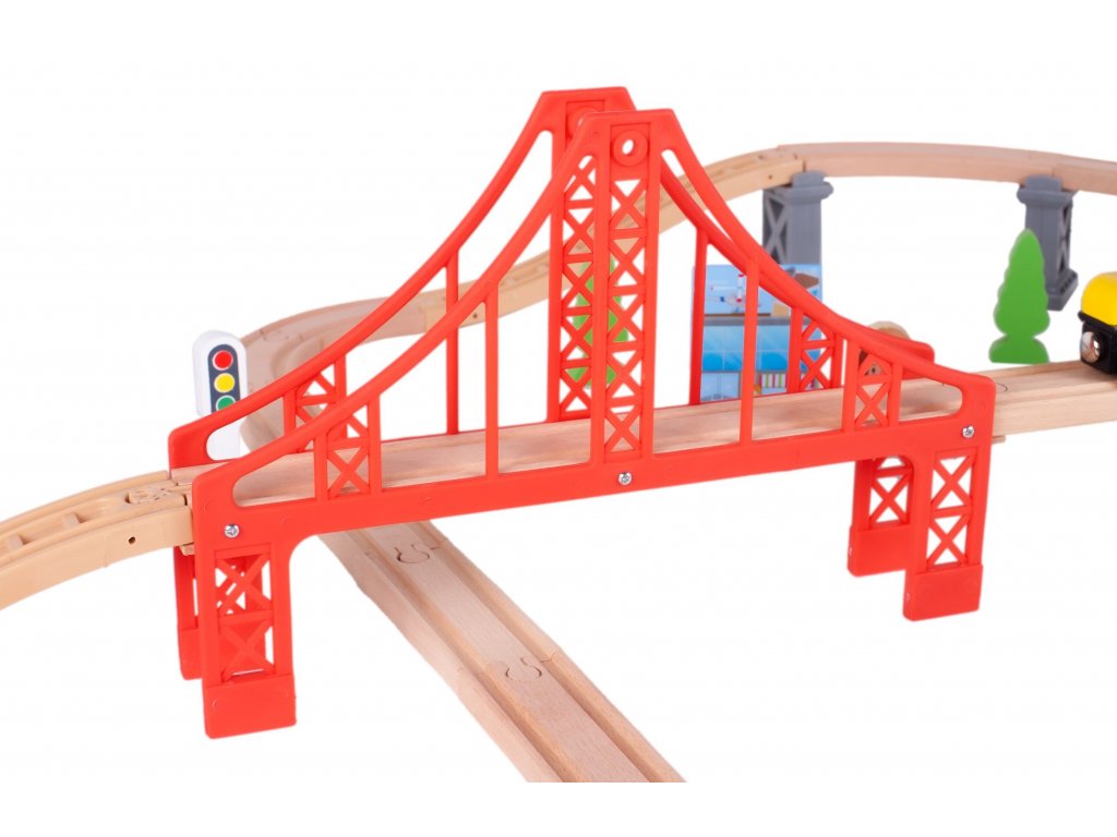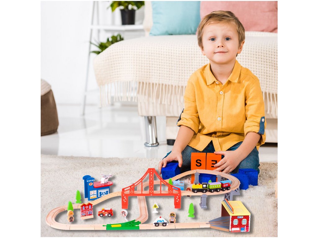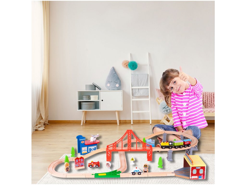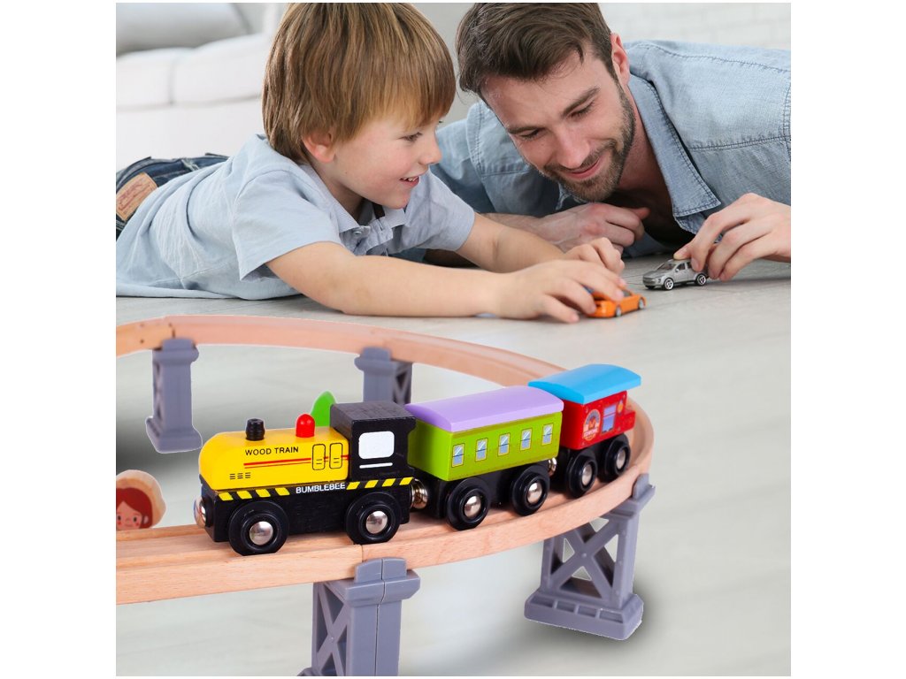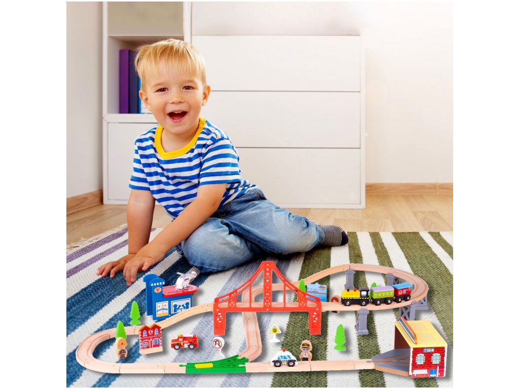 Dřevěná vláčkodráha Wooden Train s 70 elementy učí dětí představivost a podporuje kreativitu. Vláčkodráha je kompletně vybavená, naleznete zde lokomotivu se dvěma vagóny, helikoptéru, přistávací plochu, budovy, postavičky, stromečky, autíčka, dopravní značky a samozřejmě koleje. Vše je vyrobeno ze dřeva bez ostrých hran v pestrobarevném provedení. Hračka je určena pro děti od 36 měsíců věku.