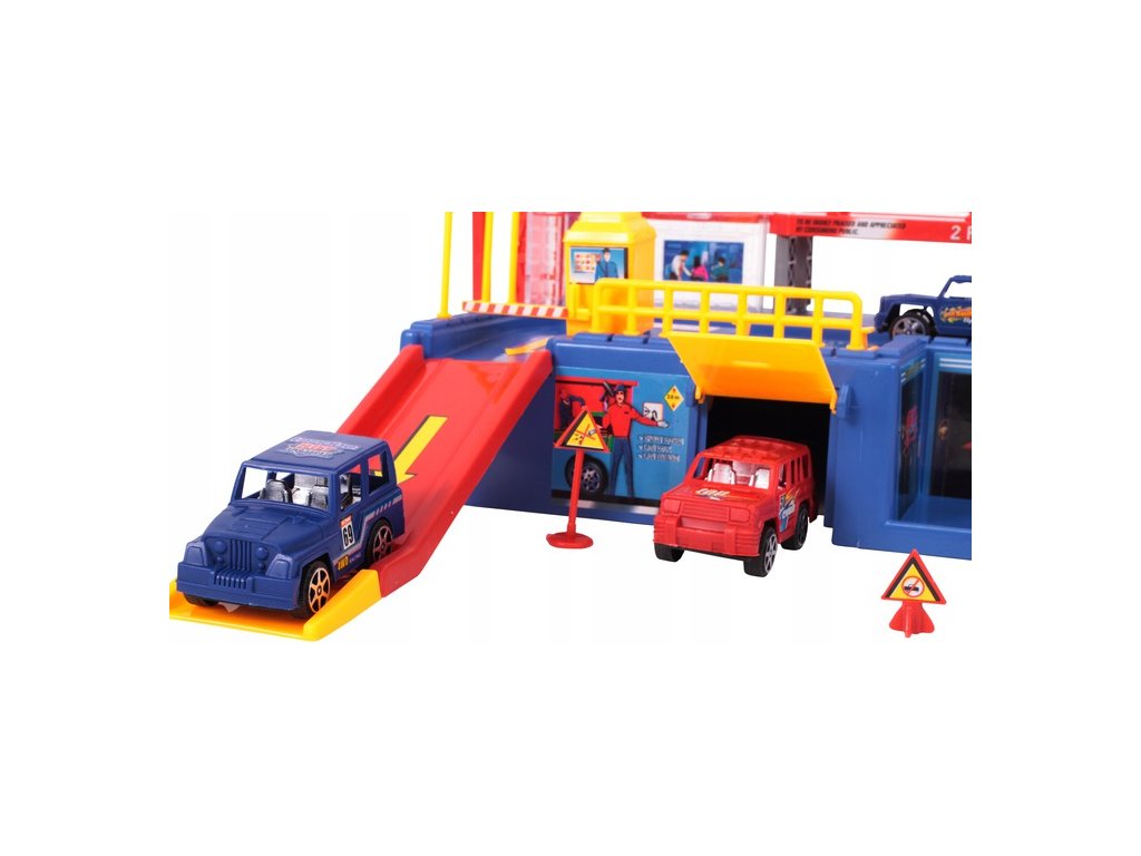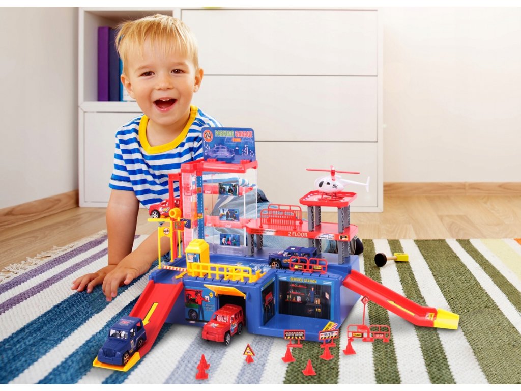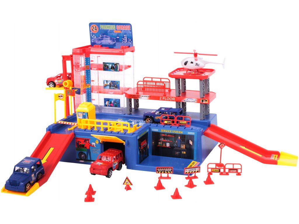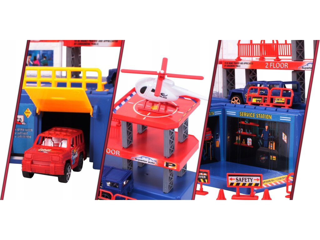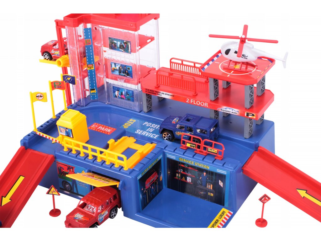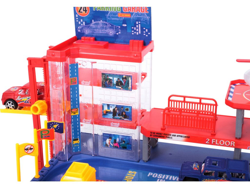 Dětská patrová garáž se 4 autíčky a helikoptérou Parking lot. Součástí parkoviště je pohyblivý výtah, který umožňuje přesouvat autíčka mezi jednotlivými patry, garáž, závora, dopravní značení, servisní plocha a dráha. Mladý motoristický nadšenec zde nalezne vše co potřebuje. Je vyrobena z materiálu bez ostrých hran a určena pro děti od 3 let věku.