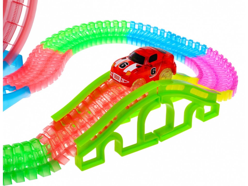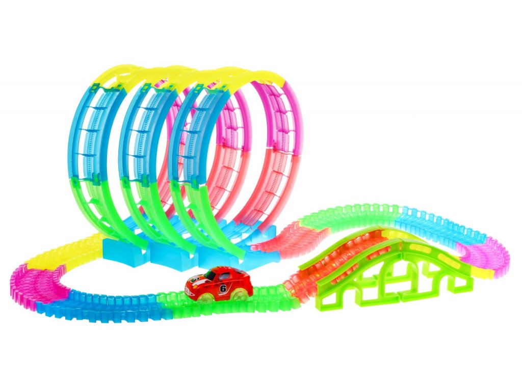 Dětská svítící autodráha Twister Tracks se 145 elementy učí dětí představivost a podporuje kreativitu. Dráha je elastická a fluorescenční lze ji tak libovolně otáček a kombinovat a tmě svítí. Součástí dráhy jsou otočné smyčky, nadjezd a tunel. Autíčko, které je součástí balení je napájeno bateriemi a má LED podsvětlení. Hračka je určena pro děti od 36 měsíců věku.