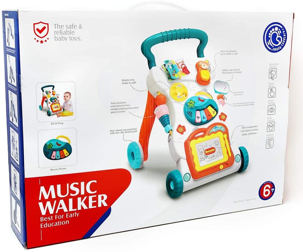 Dětské multifunkční chodítko Haunger green Walker pro ty nejmenší děti, edukační centrum. Je vyrobeno ve tvaru písmene A se dvěma rameny, které dítěti pomáhá udržet rovnováhu a stabilitu při chůzi. Chodítko je vybaveno knížkou s obrázky, kulatým číselníkem na vytáčení čísel, mobilním telefonem s tlačítkem ,kreslící tabulí a malým piánkem se zvuky. Na pravé straně je umístěno zrcátko pro bezpečnost dítěte. V horní části chodítka je umístěn držák pomocí kterého dítě snadno udrží rovnováhu a nespadne na zem. Určeno pro děti od 9 měsíců věku.