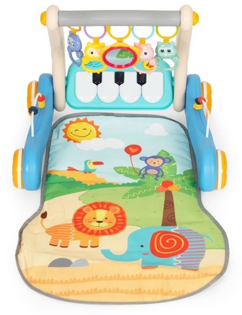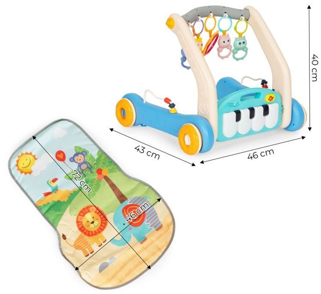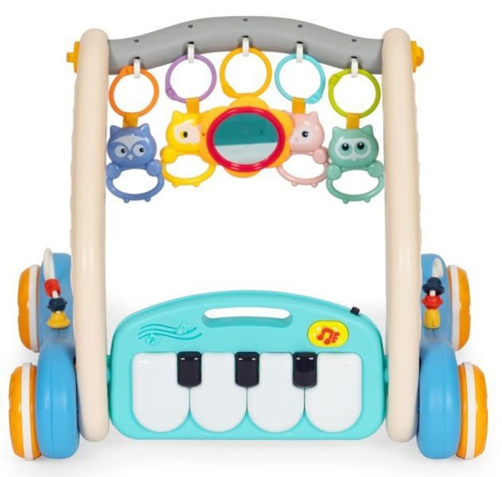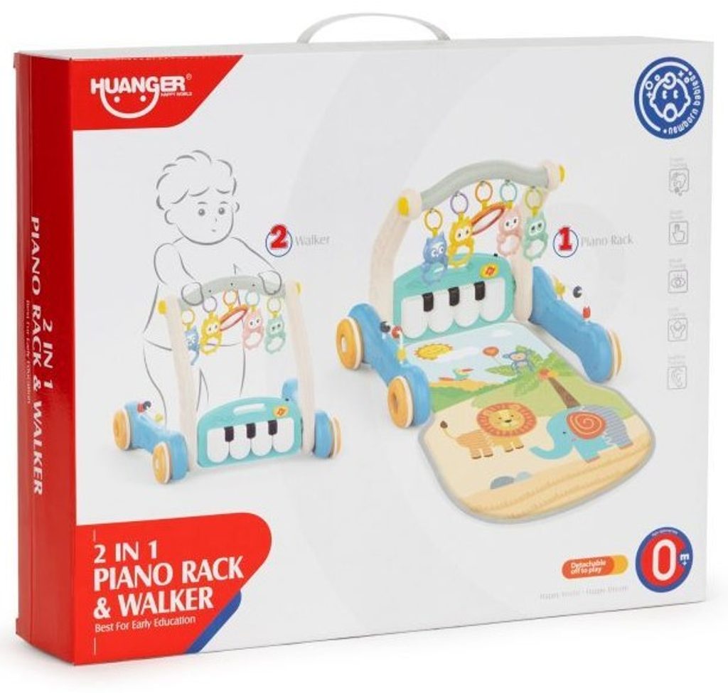 Chodítko s hrací dekou Haunger 2v1 Rack Walker je určeno Vašemu dítěti už od narození. Součástí deky je hrazdička, která slouží také jako madlo chodítka se zavěšenými chrastítky a malinkým zrcadlem a také pianko, které svítí a hraje melodie. Dítě si může v leže hrát s chrastítky a sledovat se u toho v zrcátku a pianko může být využito jako uspávací melodie. Na břiše se dítě naučí zvedat hlavičku a pozorovat věci kolem sebe, pomůže mu k prvním krůčkům a zároveň odděluje dítě od chladné podlahy.